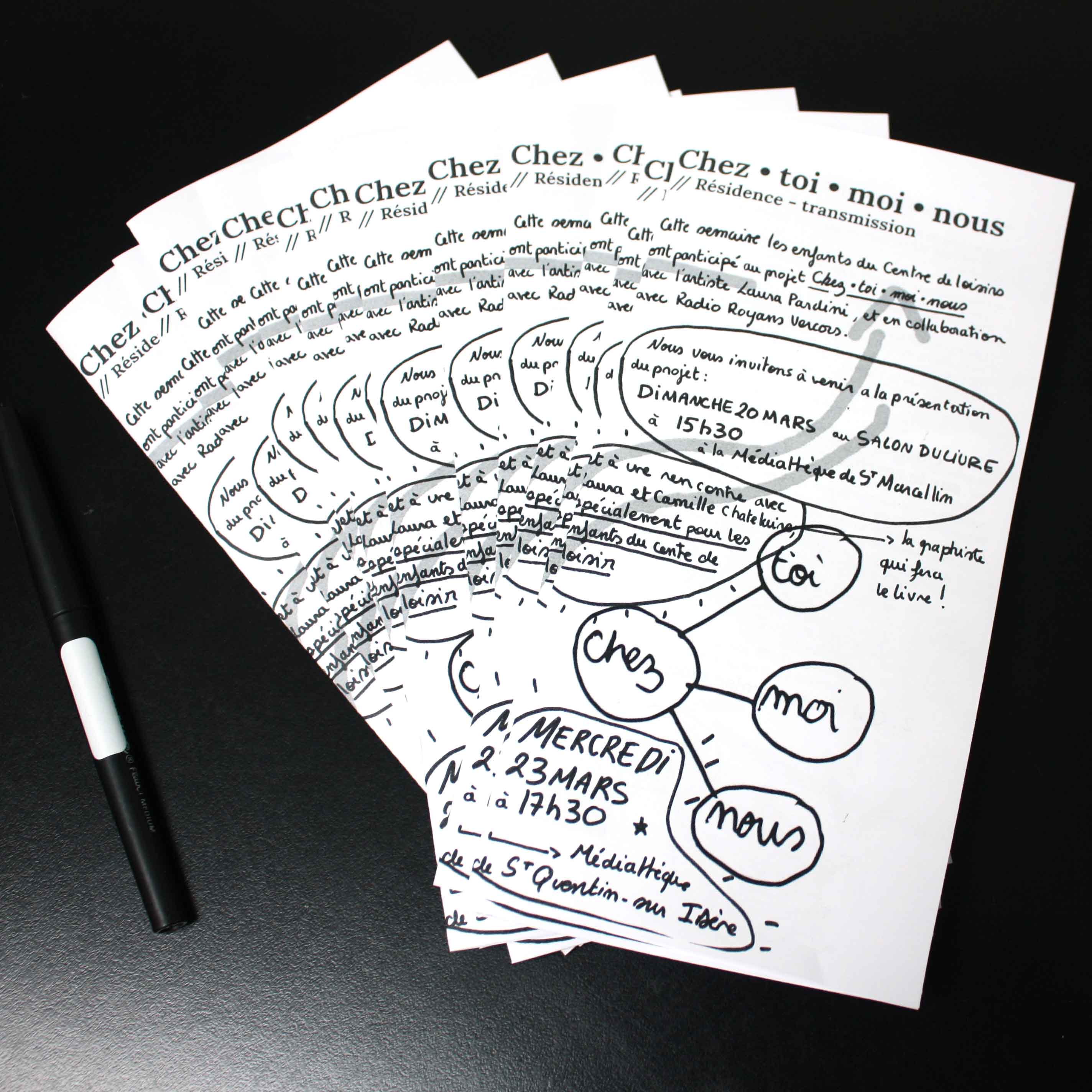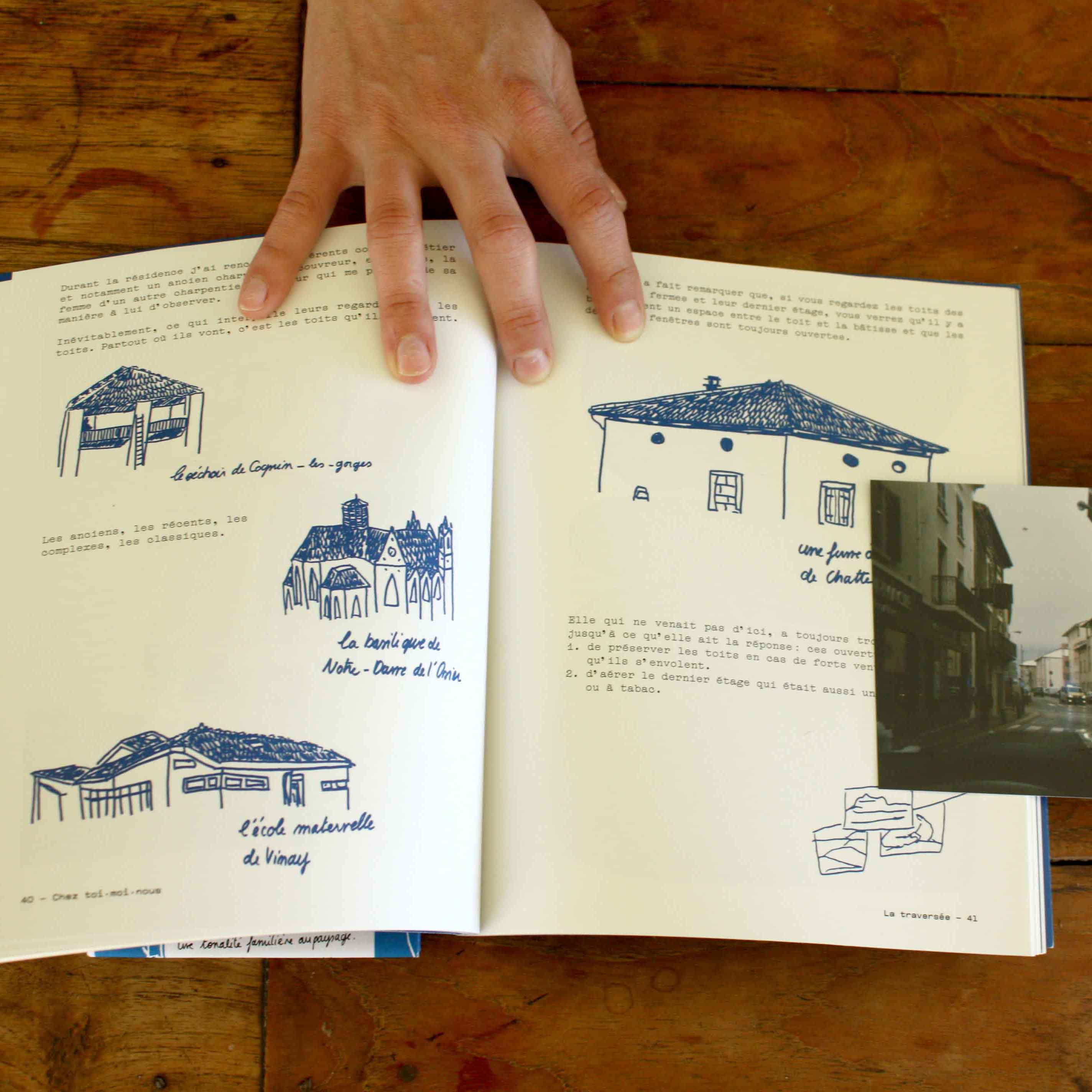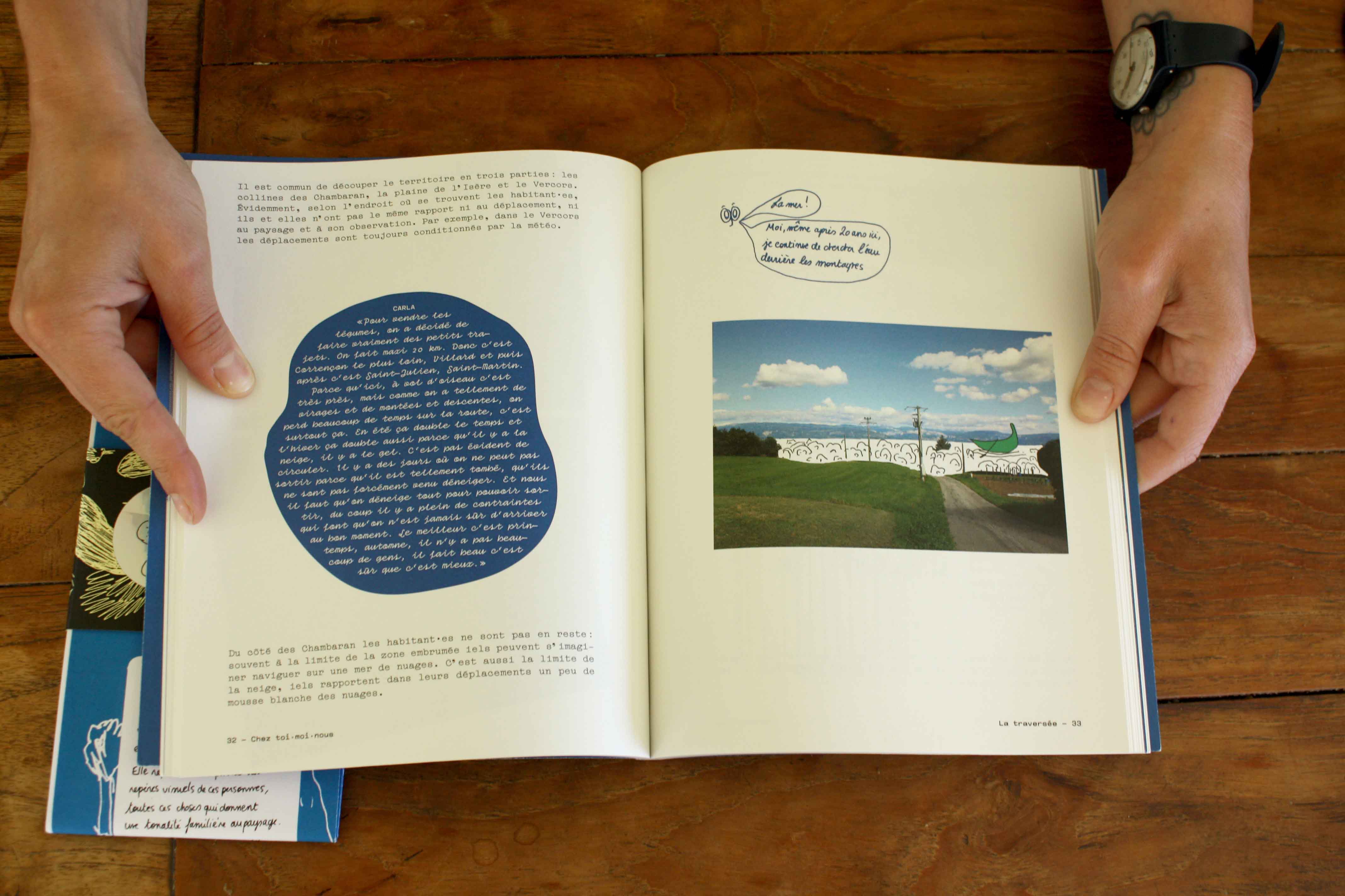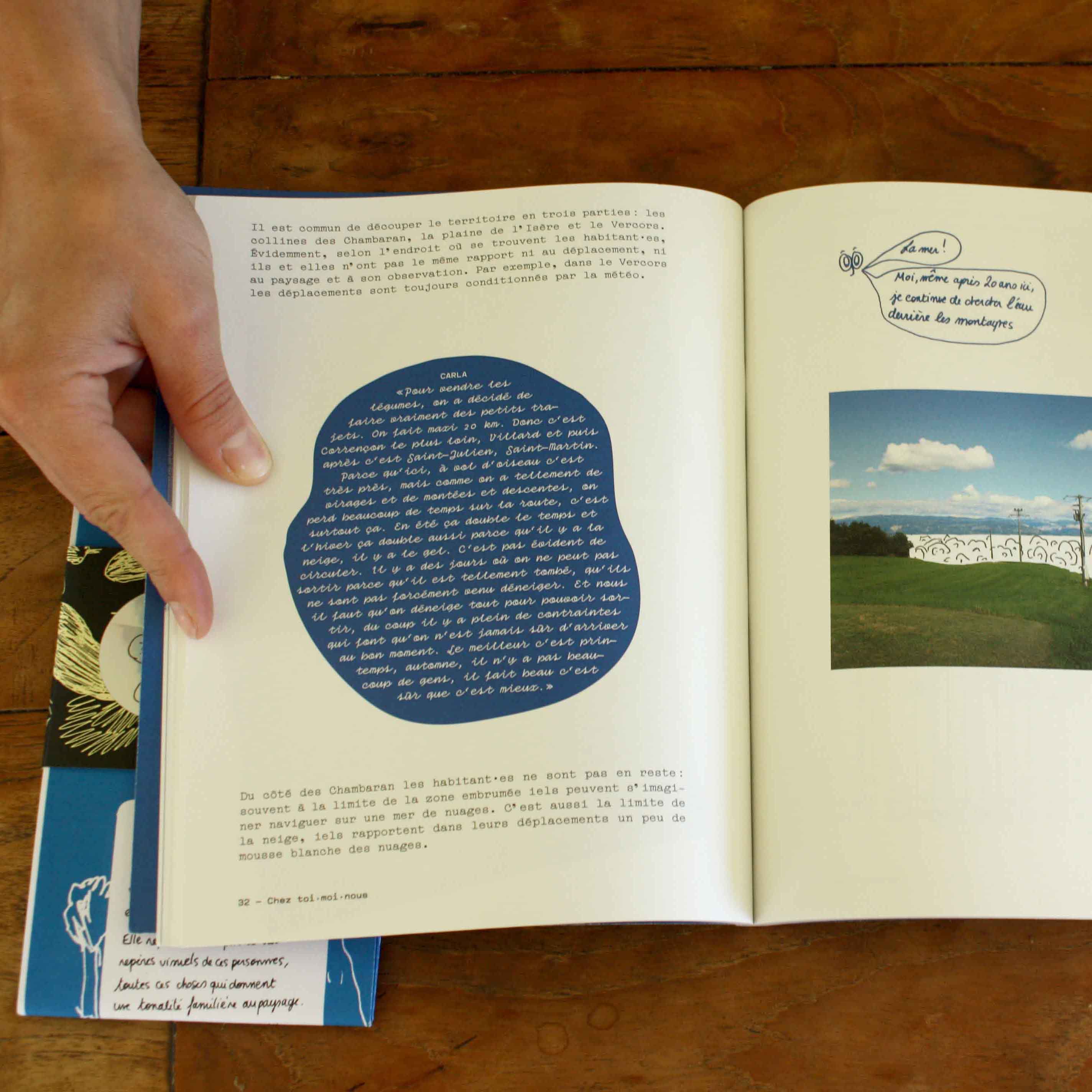 Pour Chez • toi • moi • nous, j’ai cherché les points communs des habitant·es des 47 communes du territoire, qui est entre montagnes, vallée et collines. À travers une enquête sensible sous forme d’entretiens, j’ai demandé aux habitant·es quels sont leurs repères visuels lors de leurs déplacements quotidiens. Ceux-ci changent en fonction de leurs sensibilités et de leurs centres d’intérêts.