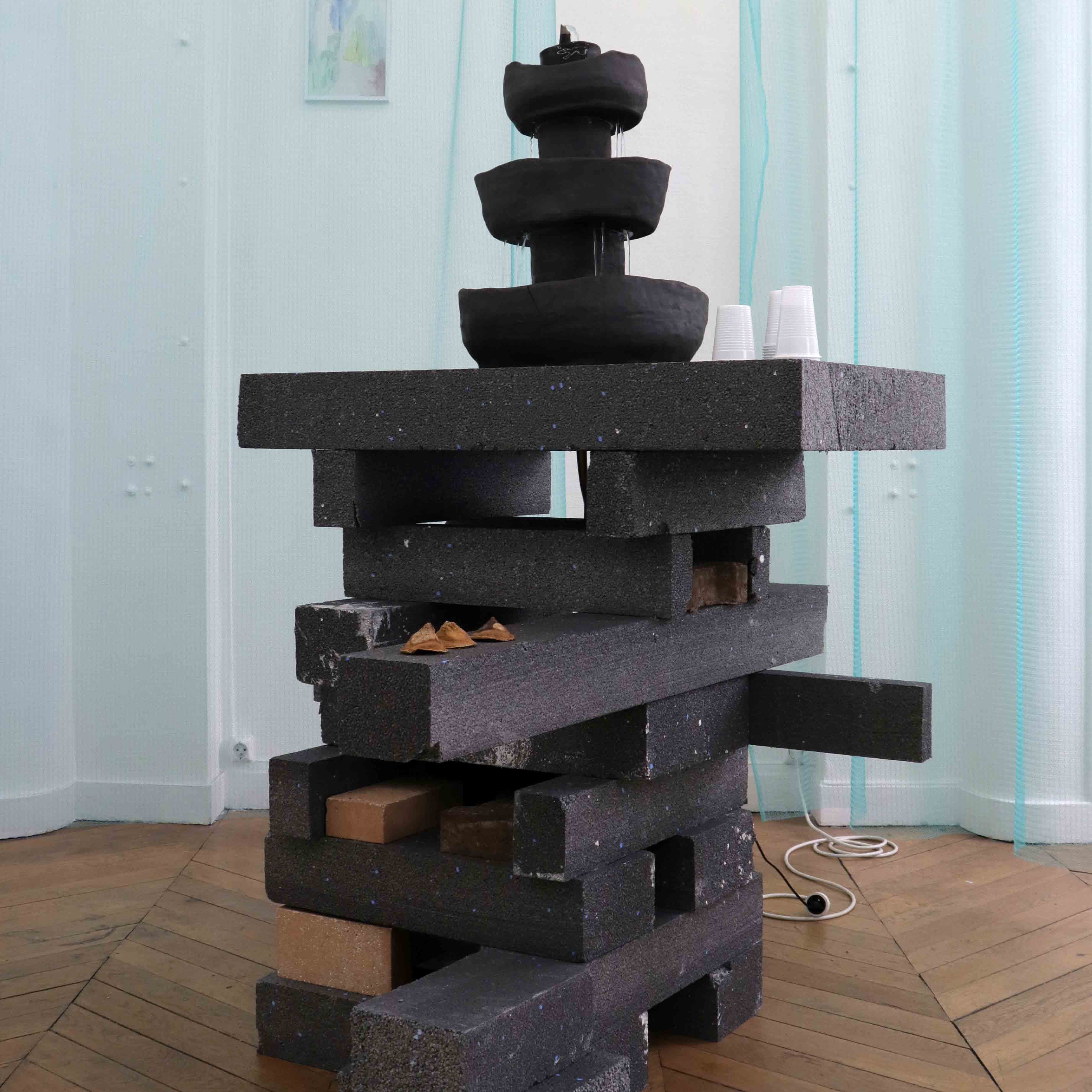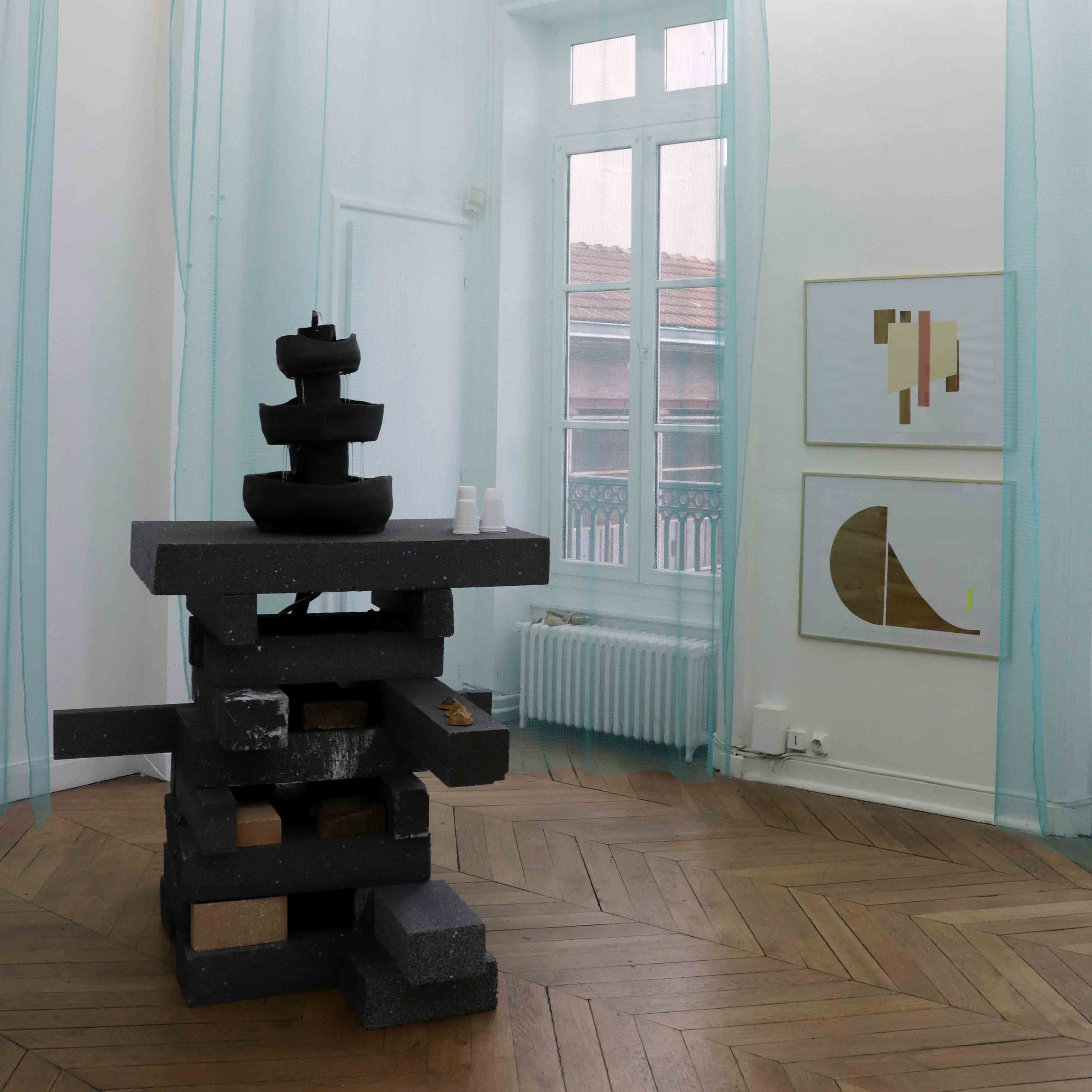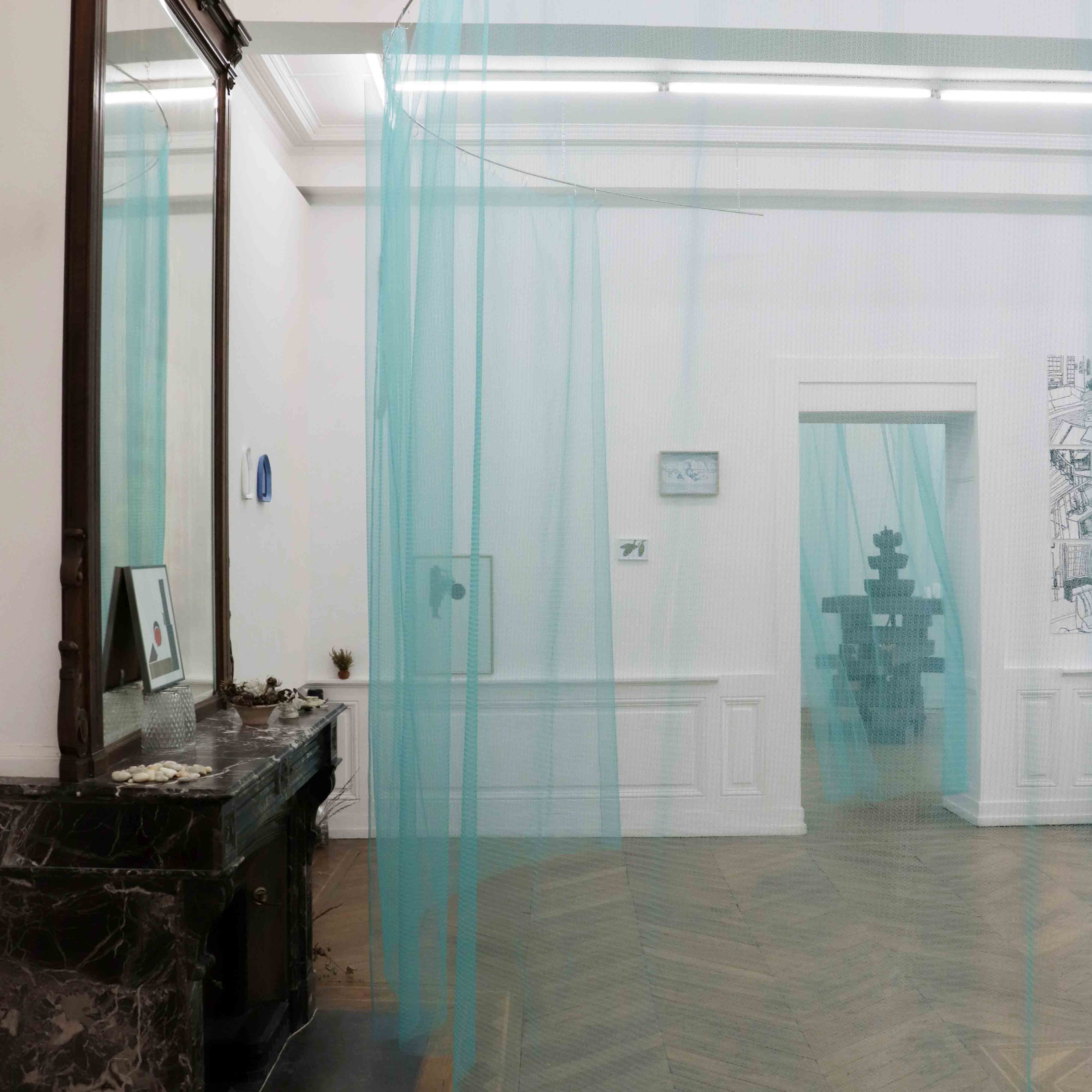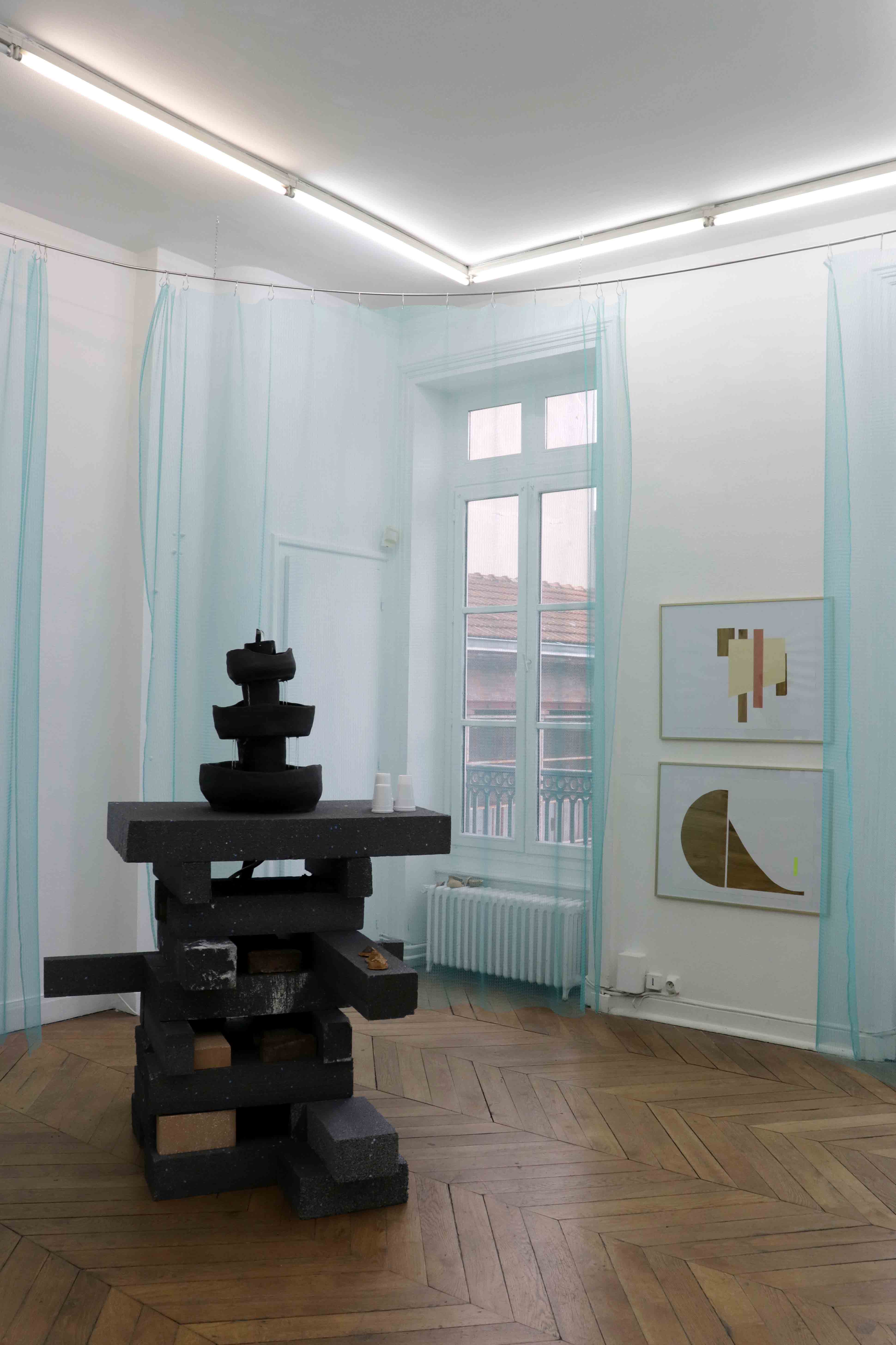 De cette réflexion en découle une autre qui est celle de l’accueil. « Qu’est-ce qu’un accueil chaleureux ? » a été notre phrase maitresse pour les pièces que nous avons réalisées en duo. Le rideau bleu d’abord, vient changer en douceur la déambulation du spectateur et atténuer les angles et le blanc des murs. Dans la seconde salle une fontaine placée au centre a été activée le soir du vernissage avec un punch, et le reste du temps de l’exposition avec de l’eau parfumée aux plantes. Et au second étage une installation composée de draps, d’un tapis et de bouteilles de rhums arrangés invite le spectateur à se prélasser.