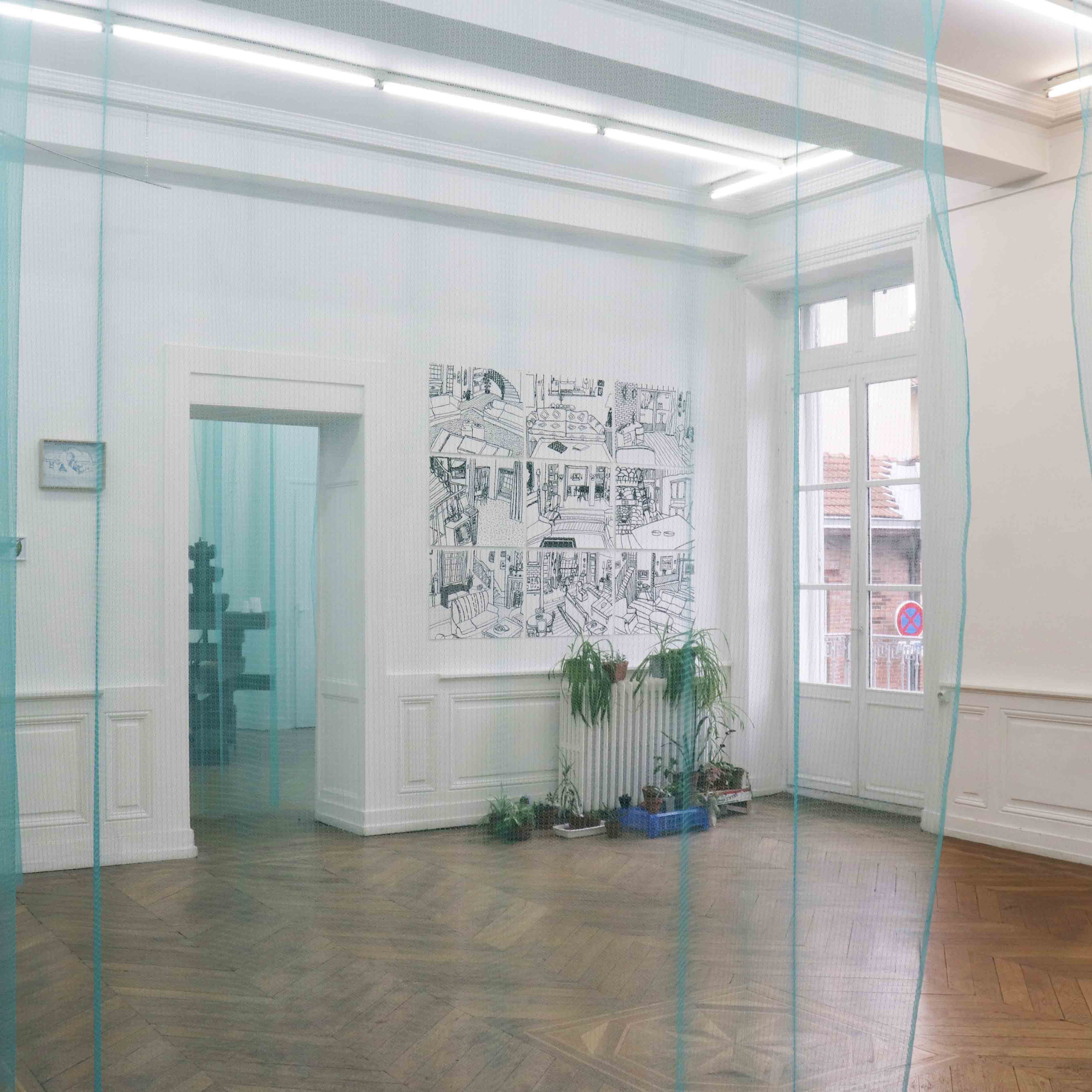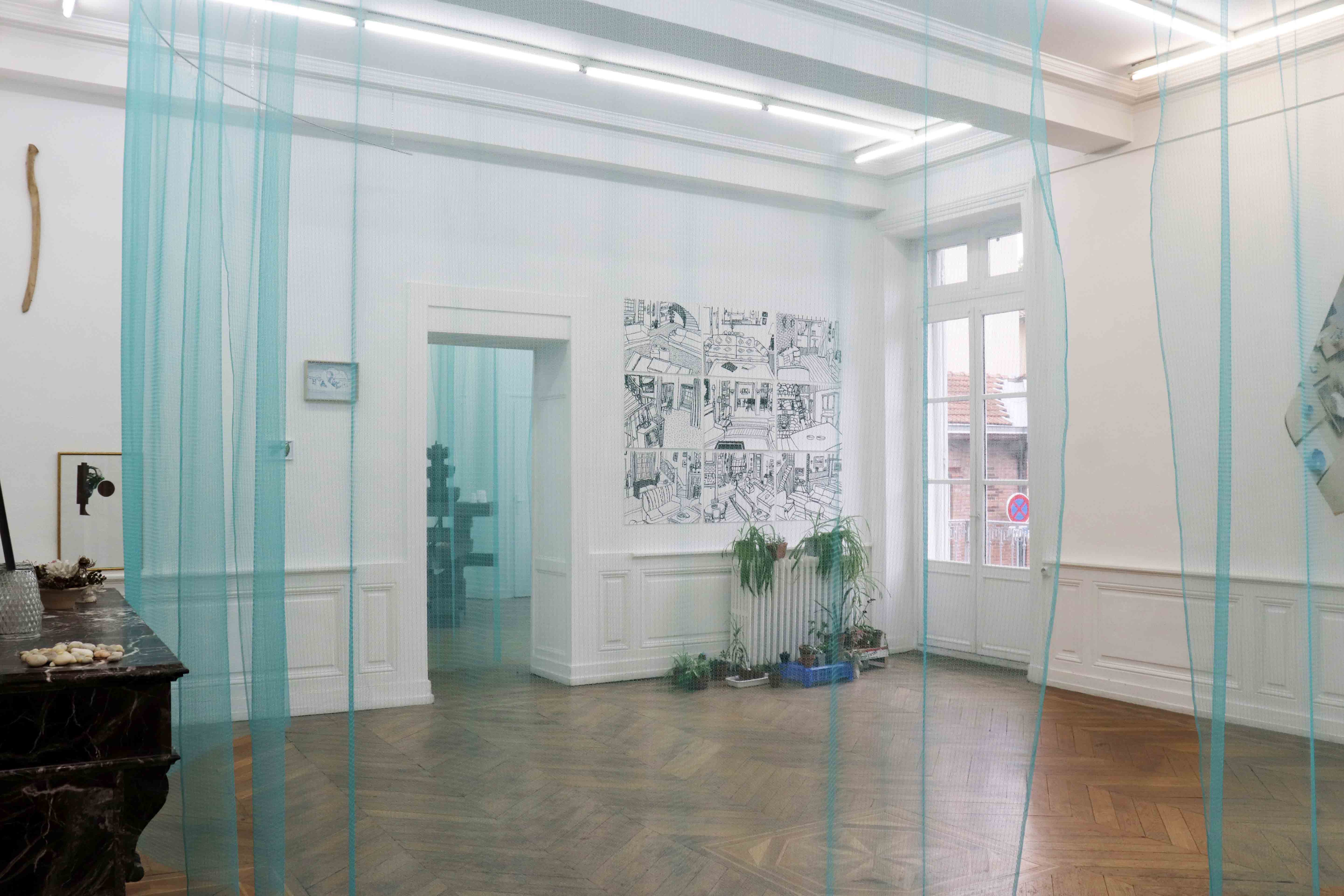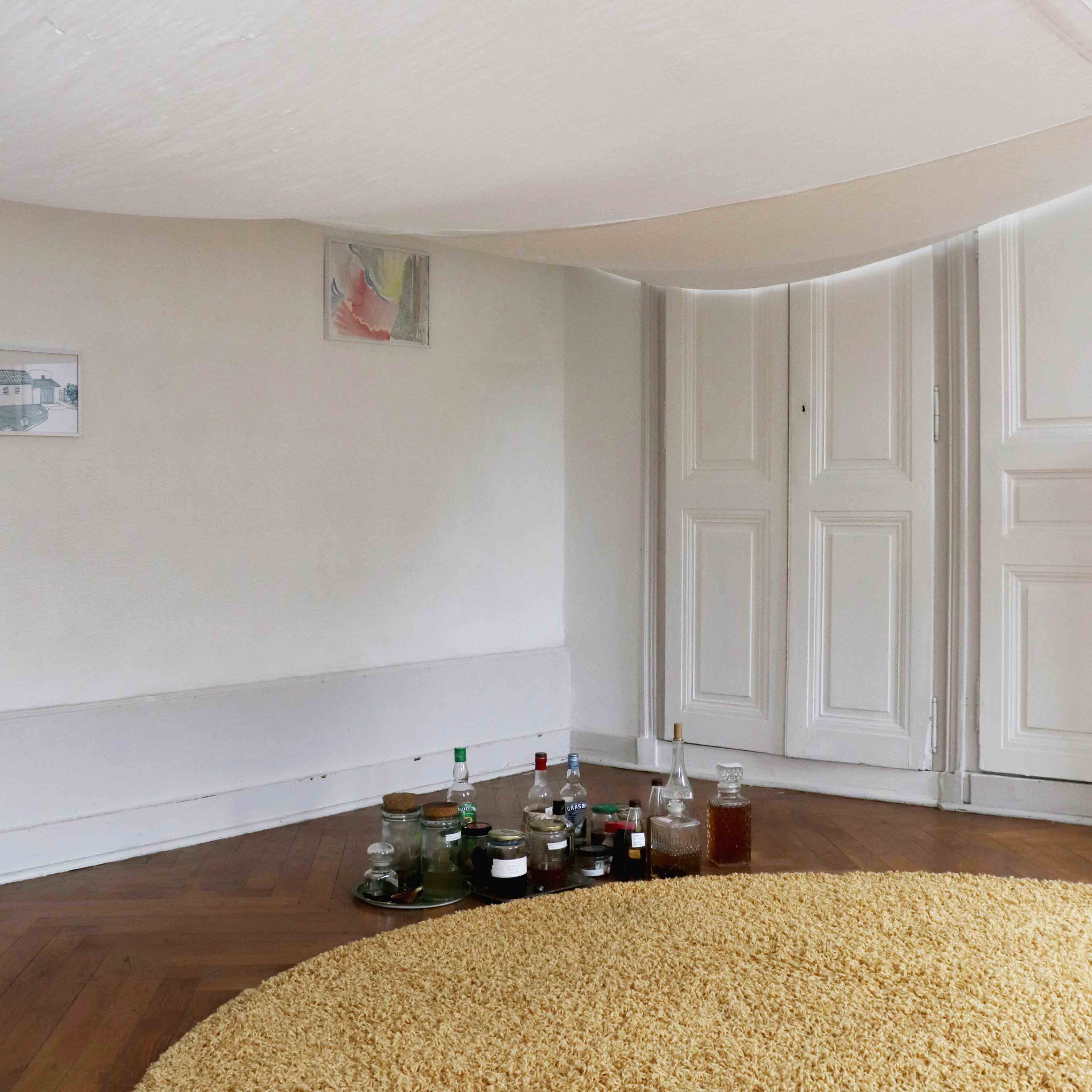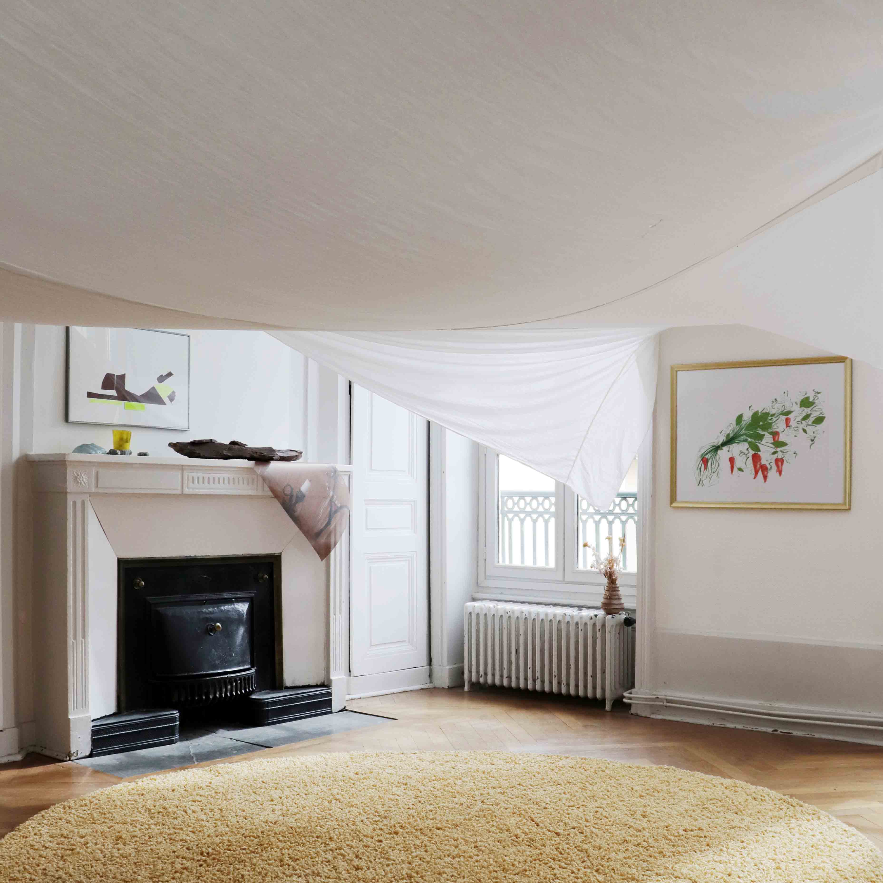 Housewarming party est une réflexion commune avec Julie Kieffer sur la notion d’habiter un espace. Le lieu d’exposition possède des éléments encore bien identifiables de son passé de maison bourgeoise - des moulures, des cheminées, un parquet en bois massif. Nous avons alors pris le parti de l’exploiter dans son ambiguïté, entre lieu d’exposition et espace domestique, en jouant entre ces différents codes.