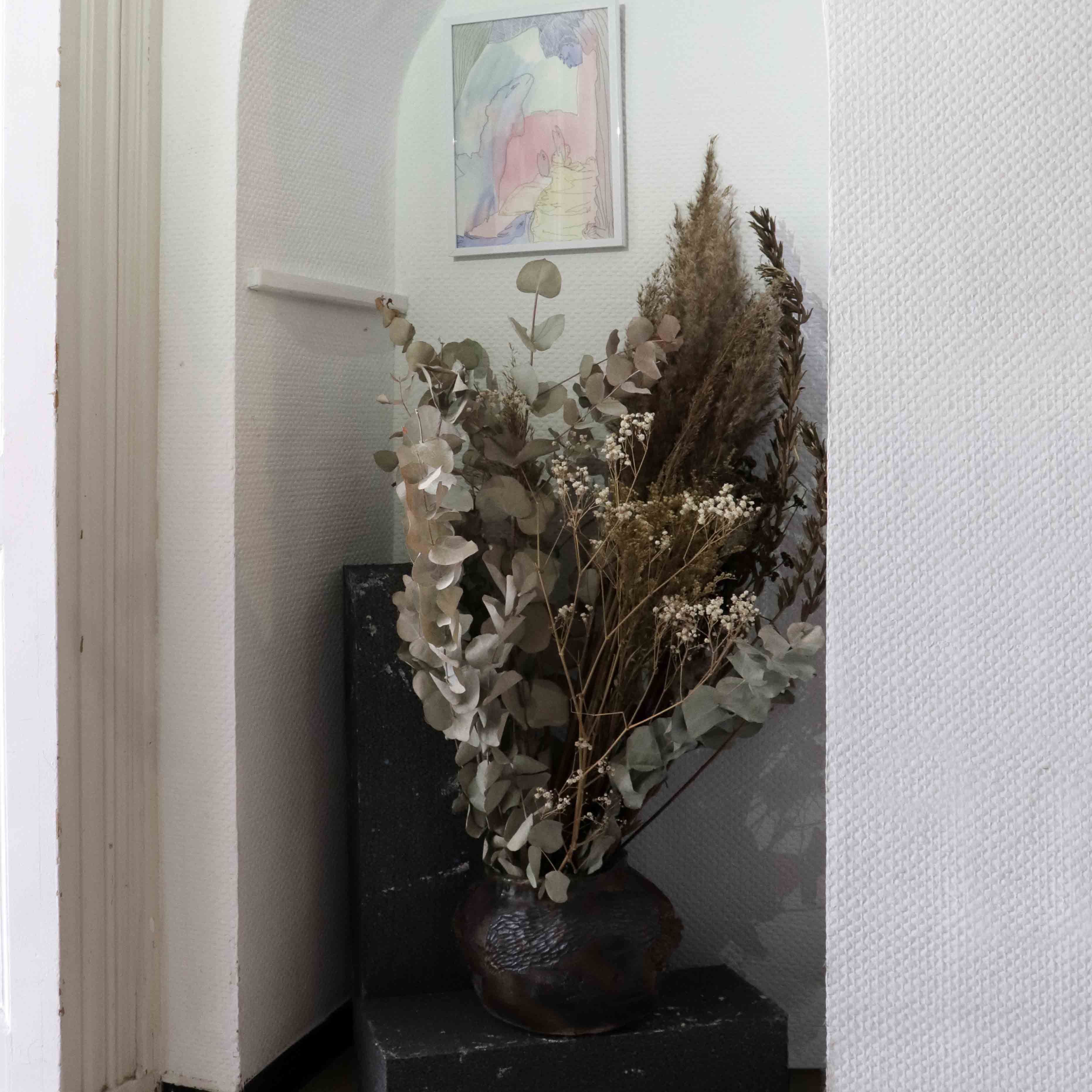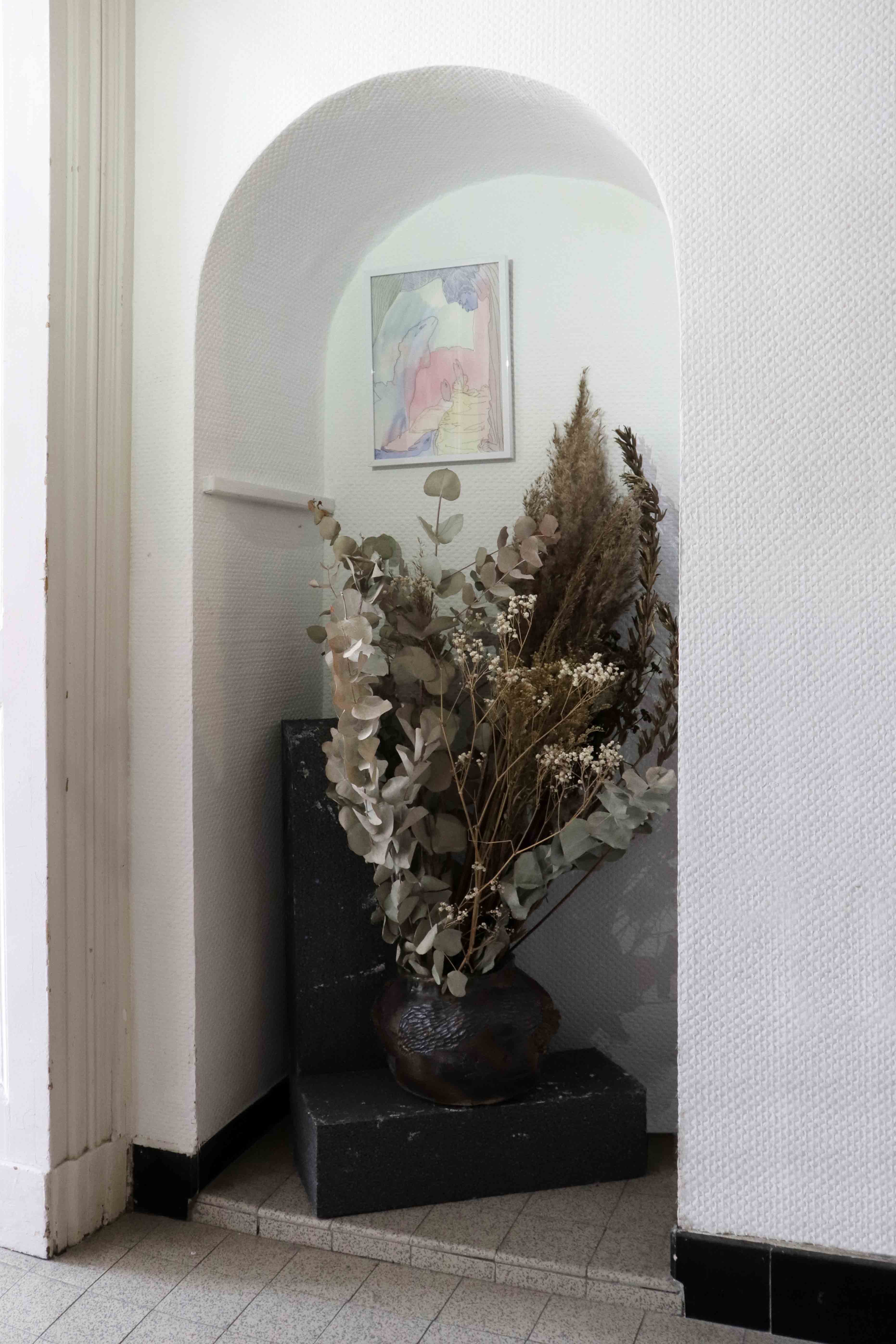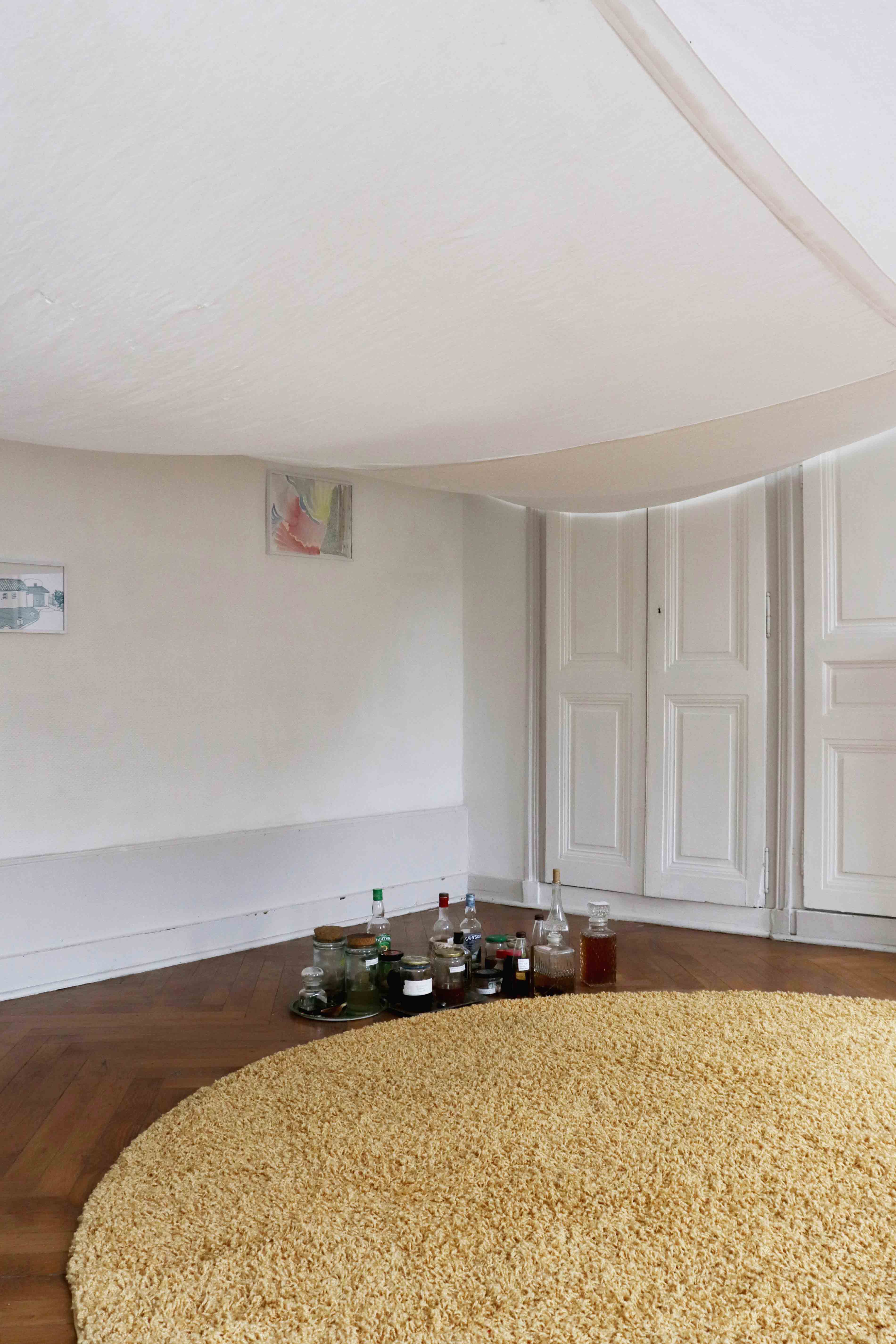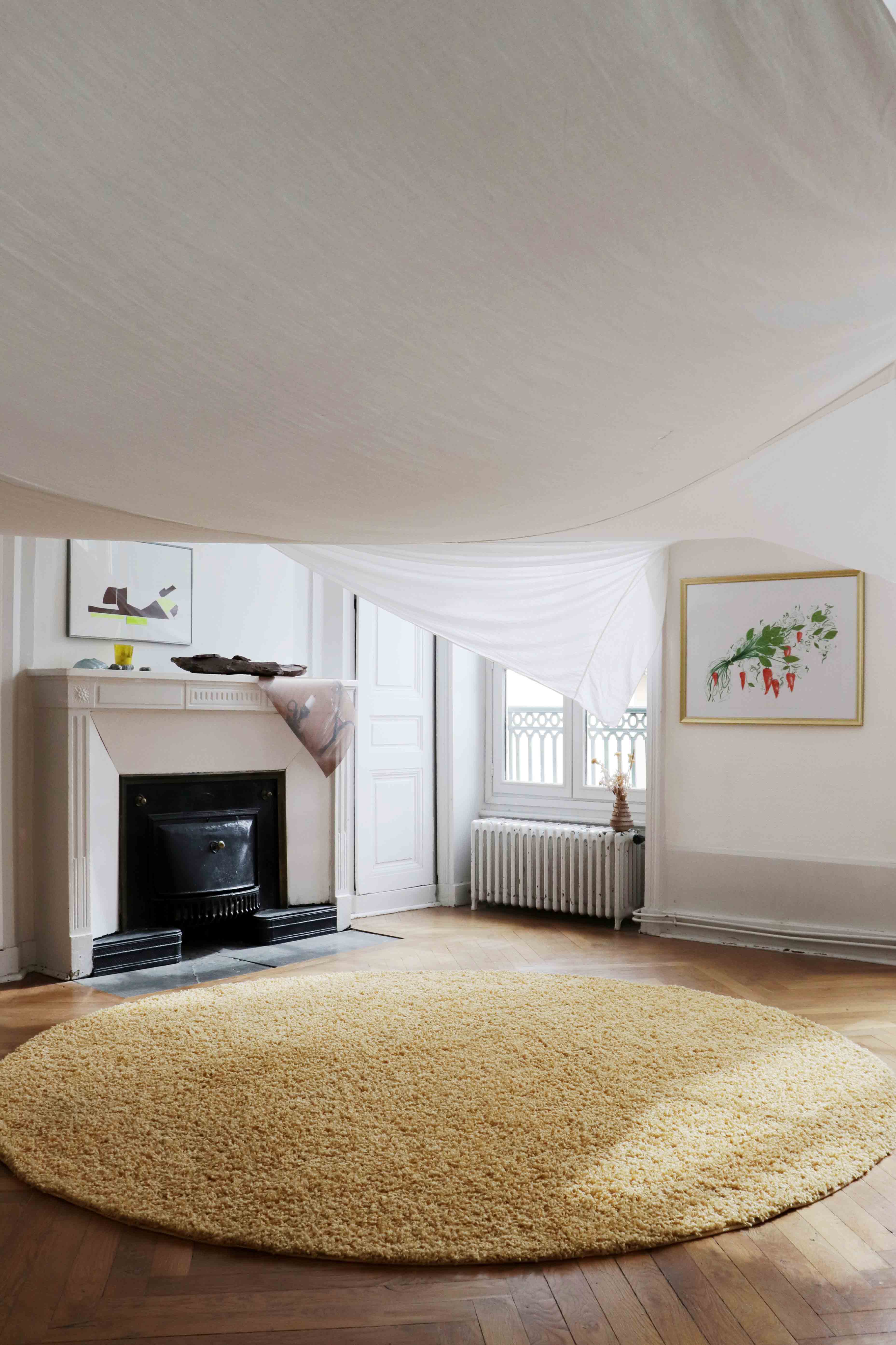 Housewarming party est une réflexion commune avec Julie Kieffer sur la notion d’habiter un espace. Le lieu d’exposition possède des éléments encore bien identifiables de son passé de maison bourgeoise - des moulures, des cheminées, un parquet en bois massif. Nous avons alors pris le parti de l’exploiter dans son ambiguïté, entre lieu d’exposition et espace domestique, en jouant entre ces différents codes.