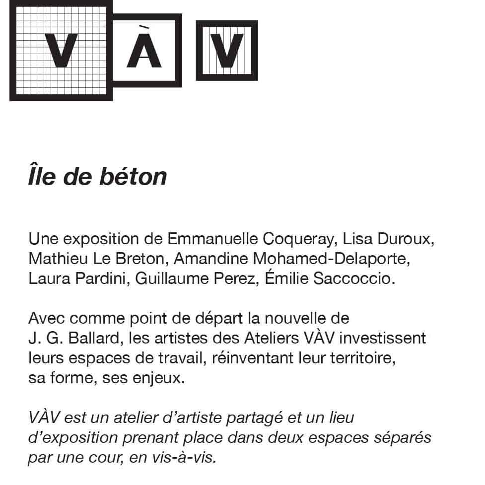 Avec comme point de départ la nouvelle de J. G. Ballard, les artistes des Ateliers VÀV investissent leurs espaces de travail, réinventant leur territoire, sa forme, ses enjeux.