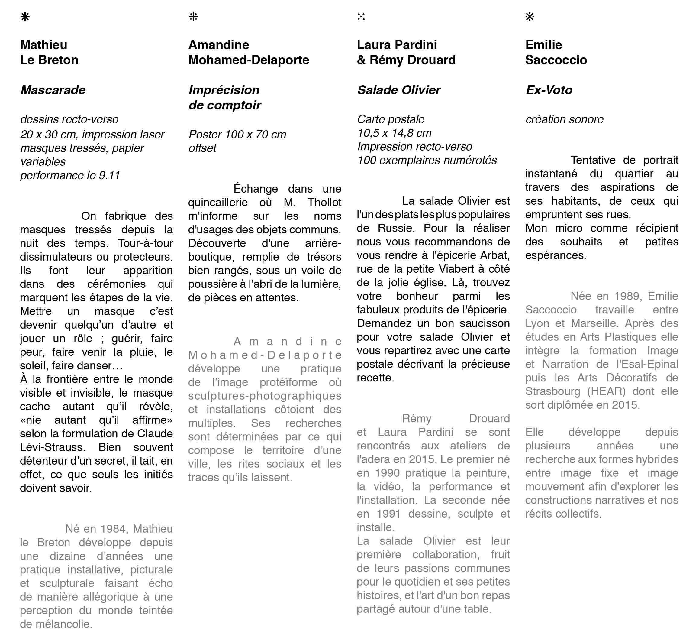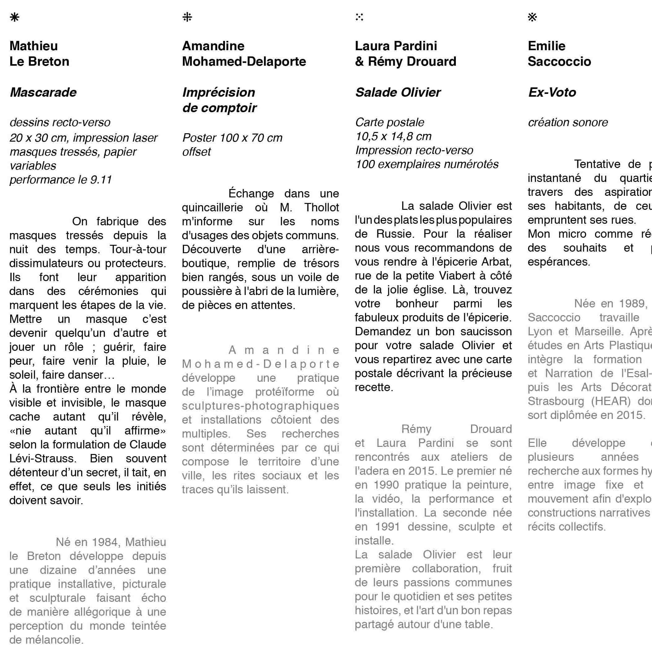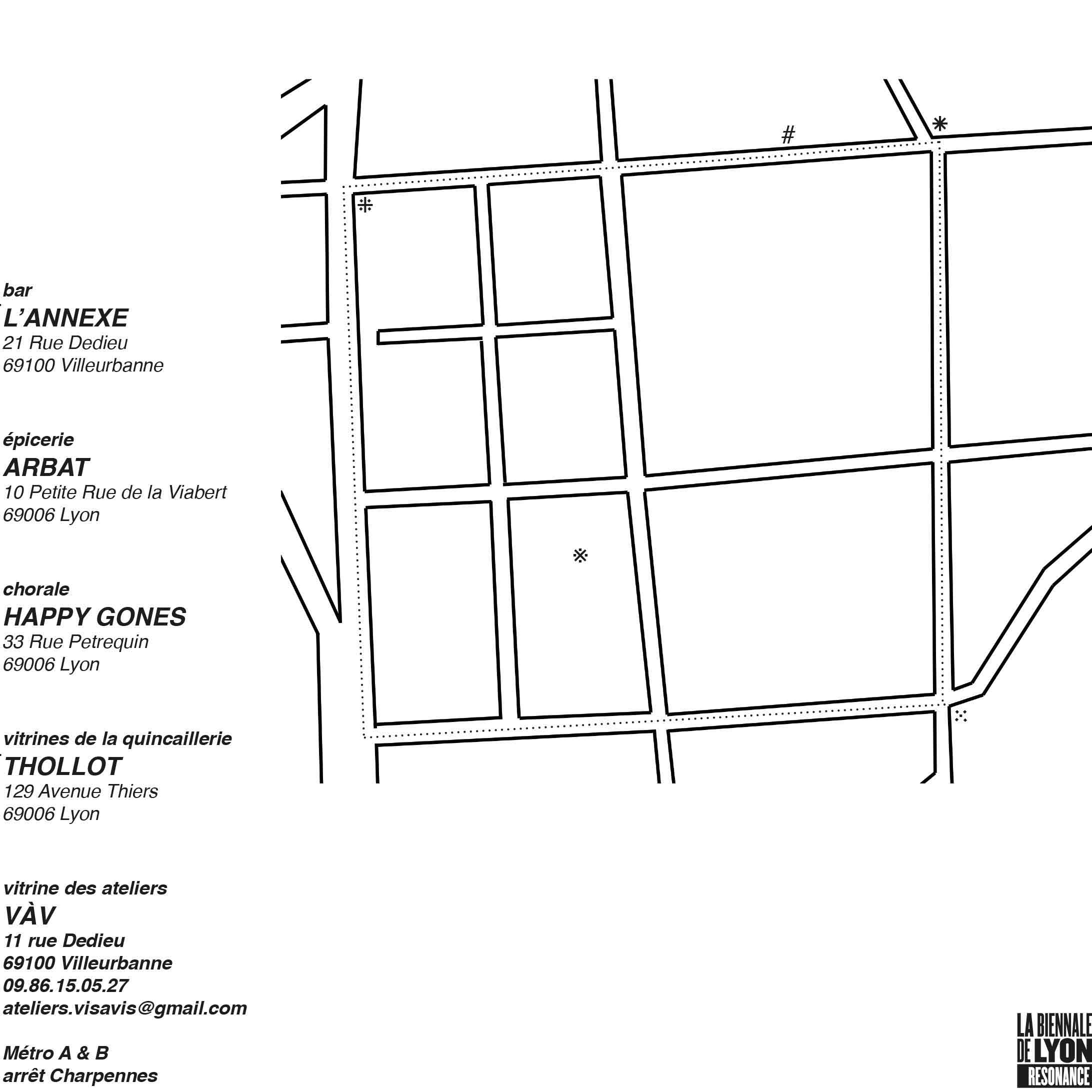 La balade a débuté au 11 rue Dedieu pour déambuler vers la quincaillerie Thollot avec une intervention d’Amandine Mohamed-Delaporte en vitrine. En cours de route, ponctuellement, nous avons écouté l’enregistrement sonore d’un micro-trottoir réalisé par Émilie Saccoccio auprès de passants du quartier. Puis en chemin nous avons été rejoint par la chorale Happy Gones qui a rythmé notre balade de chansons de leur répertoire. Peu après nous sommes arrivés à l’épicerie Arbat pour découvrir La salade Olivier, la carte postale que nous avons dessiné avec Rémy Drouard. Pour terminer nous avons assisté à une performance de Mathieu Le Breton, Mascarade, où il a tracé grâce à un fumigène la limite entre Lyon et Villeurbanne. Il portait un masque tressé dont nous avons pu retrouver le dessin au bar L’Annexe.