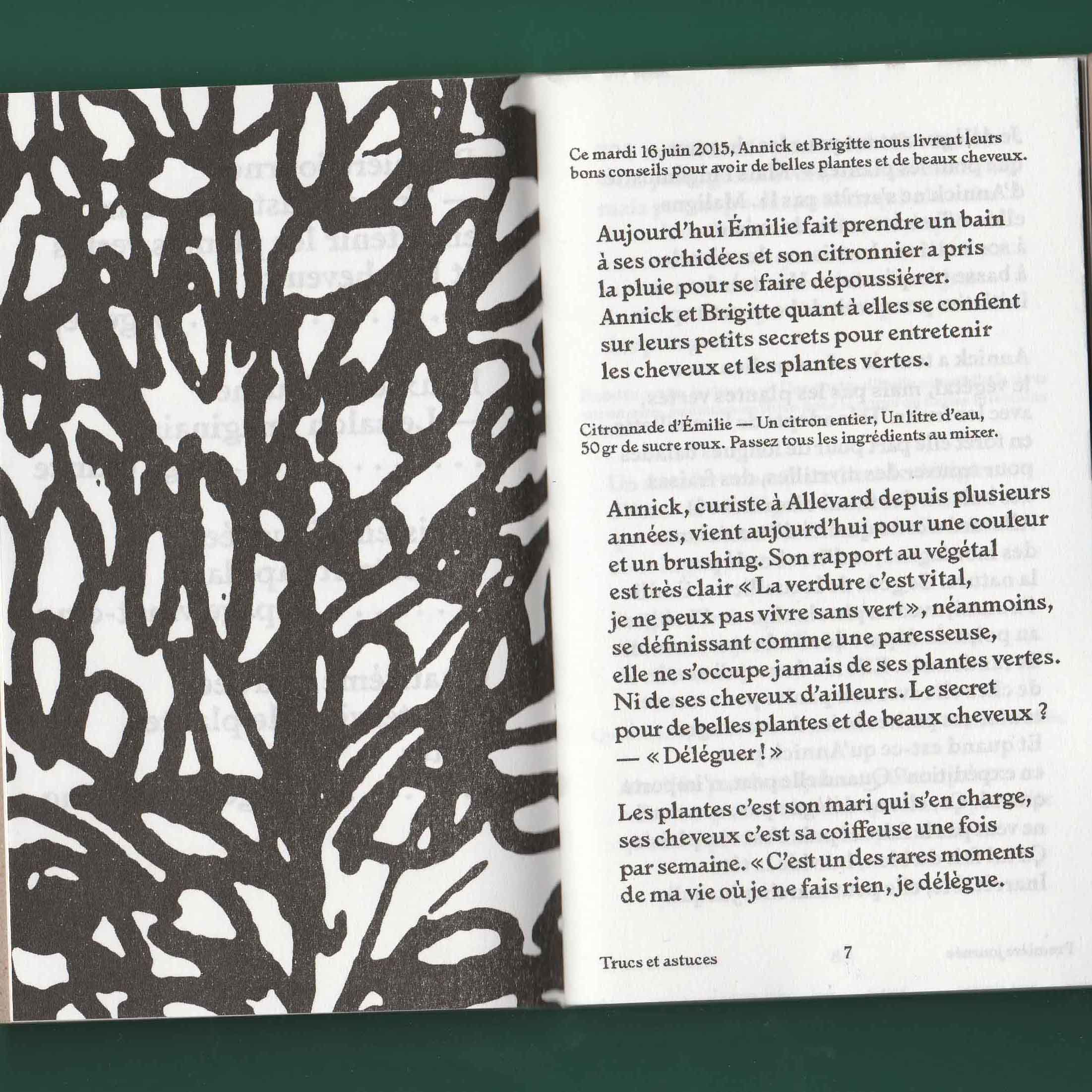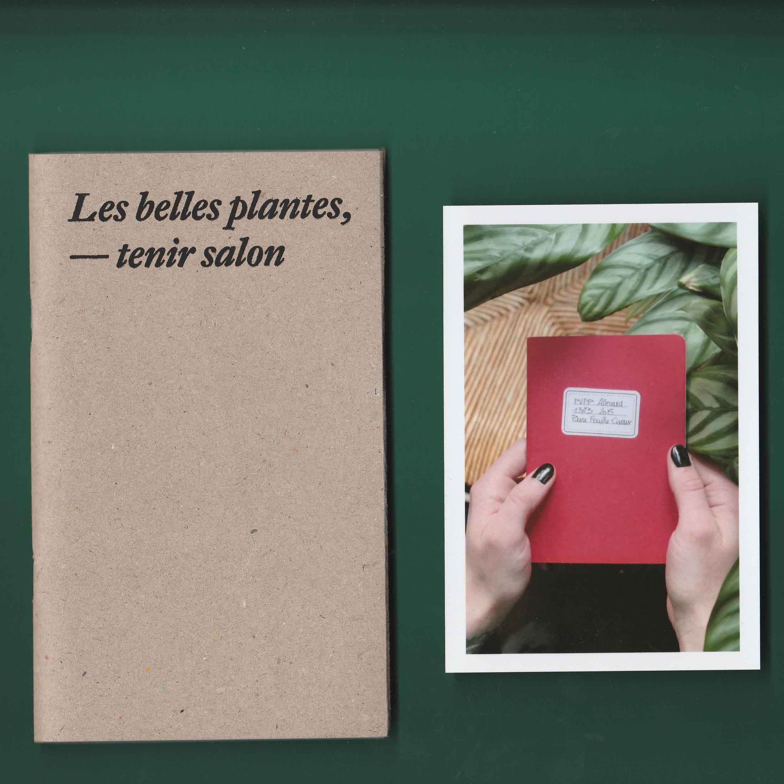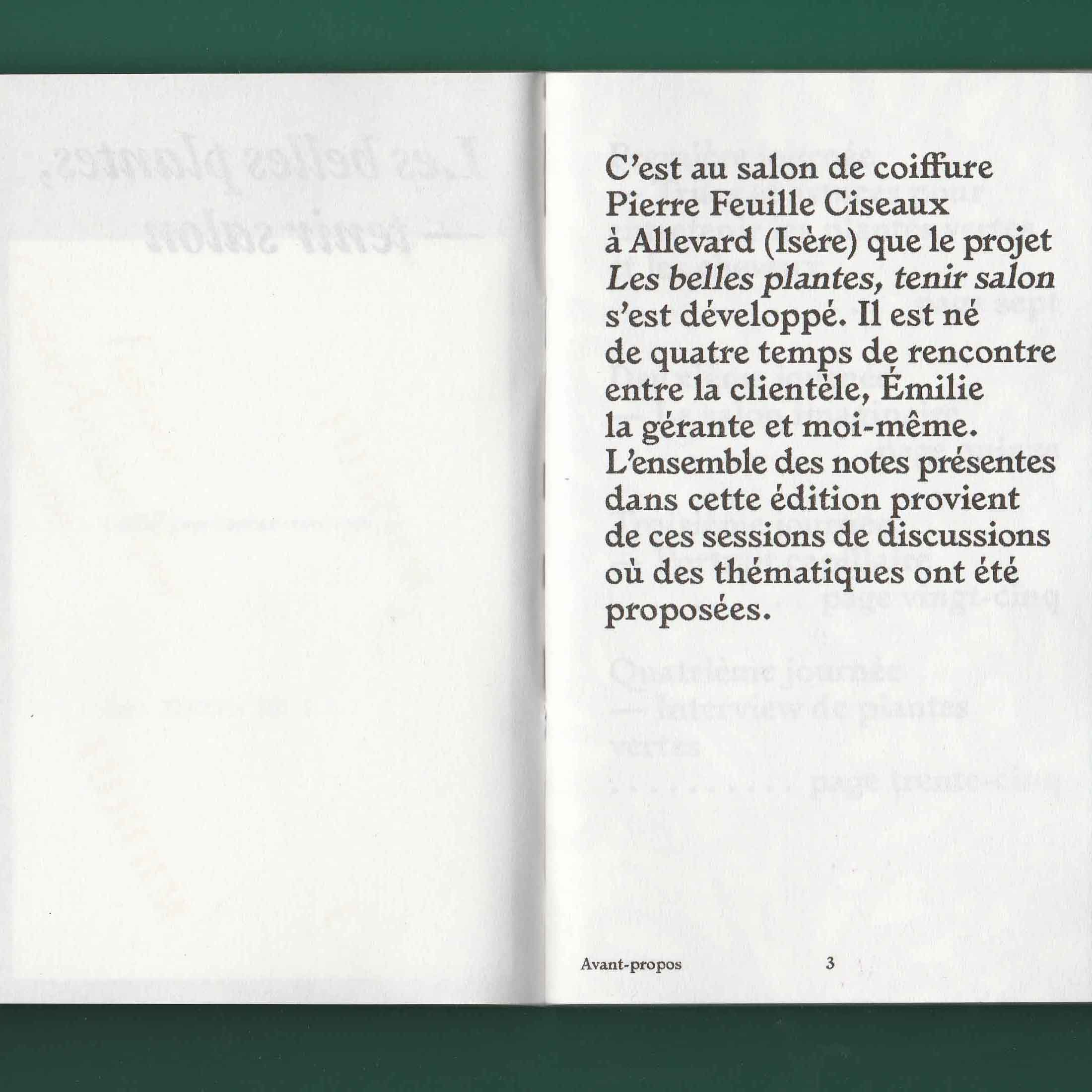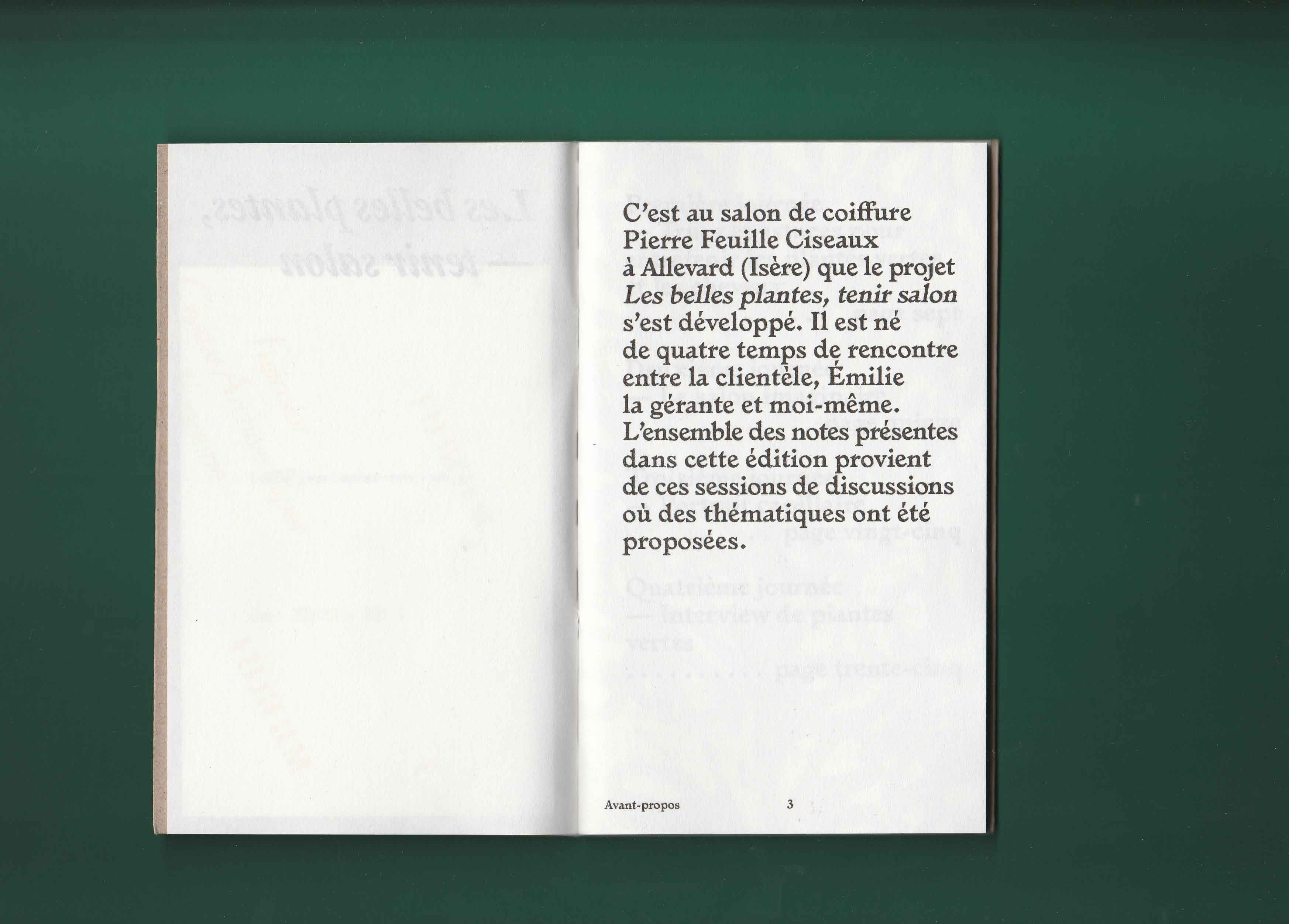 Si mon choix s’est porté sur ce salon plutôt qu’un autre endroit c’est parce que sa vitrine regorgeait de plantes vertes. On voyait alors en second plan des dames se faire coiffer. La fortuite promiscuité entre ces deux éléments, les plantes vertes et les cheveux, m’a donné envie d’explorer ces deux univers comme s’ils étaient voisins. Ils renvoient tous les deux au prendre soin et à l’entretien. Aussi l’espace du salon de coiffure m’interéssait en tant qu’espace d’intimité en dehors de la maison. Il appartient à la ville mais c’est aussi l’endroit où l’on se laisse toucher la tête et bien souvent on discute avec la personne qui nous coiffe. De là est né le projet des Belles plantes – tenir salon. À quatre reprises je me suis rendue au salon d’Emilie pour discuter avec sa clientèle de sujets en lien avec ses préoccupations. Pour expérimenter au mieux ce moment d’intimité je n’ai pris que des notes de ces entretiens. Il n’y aucune trace photo, vidéo ou sonore. Les notes ont ensuite été retranscrites dans une édition auto-éditée limité à 100 exemplaire et mise en page par Les formes associées.