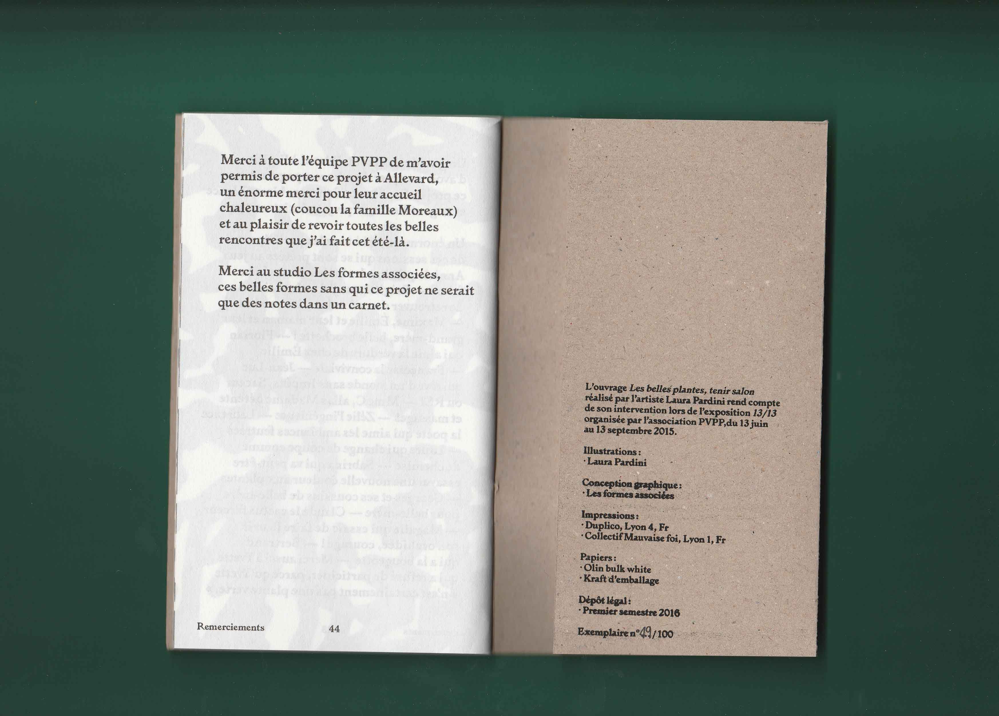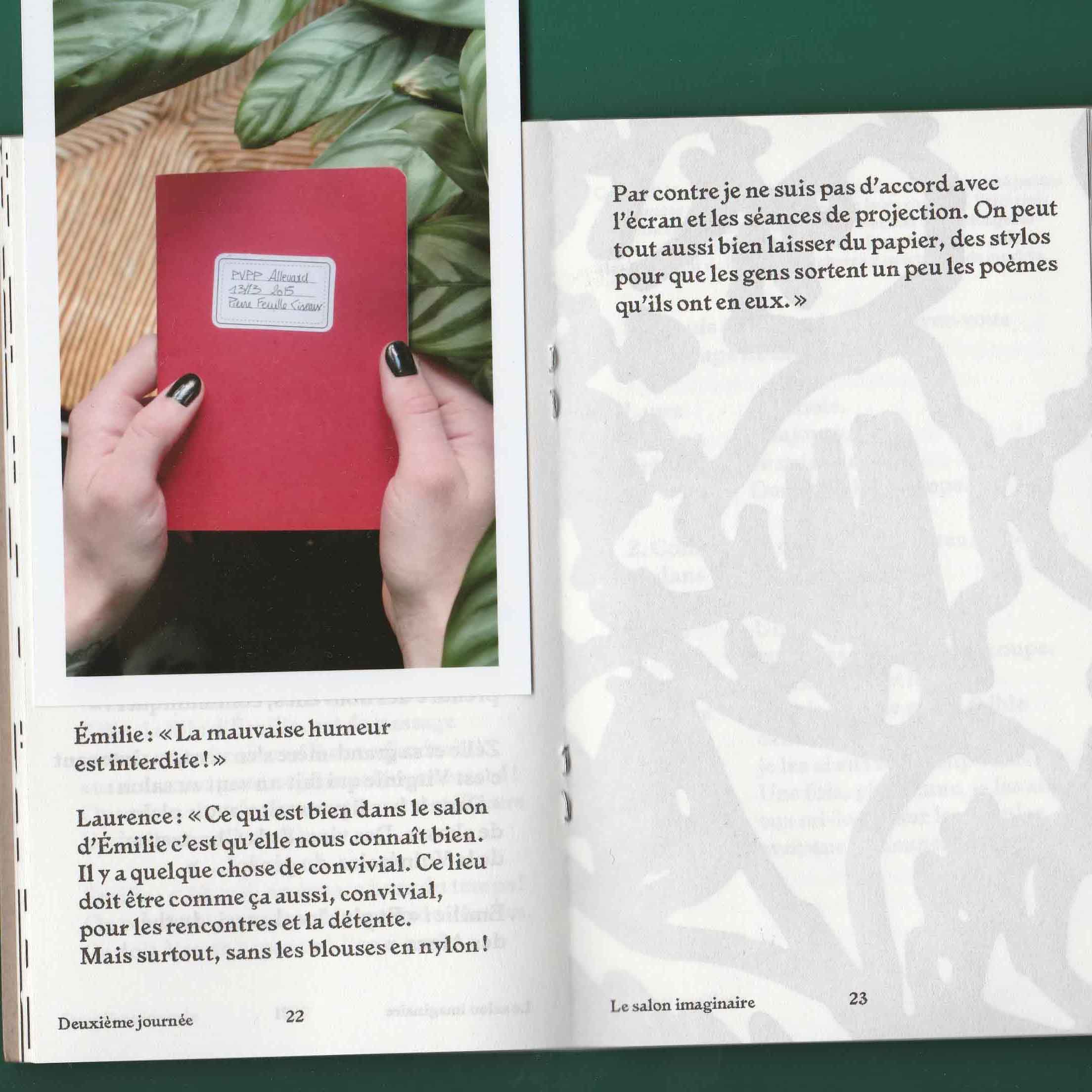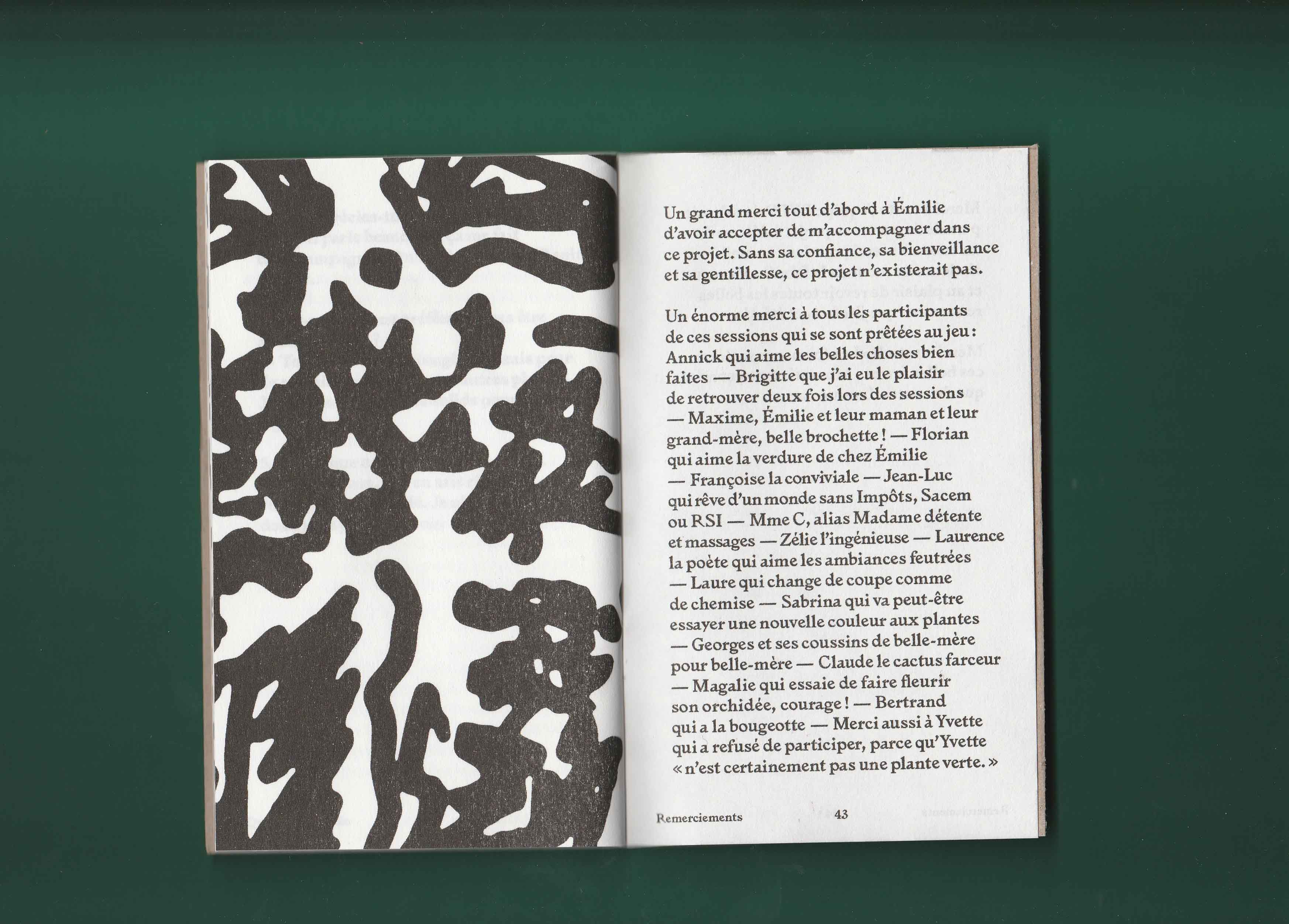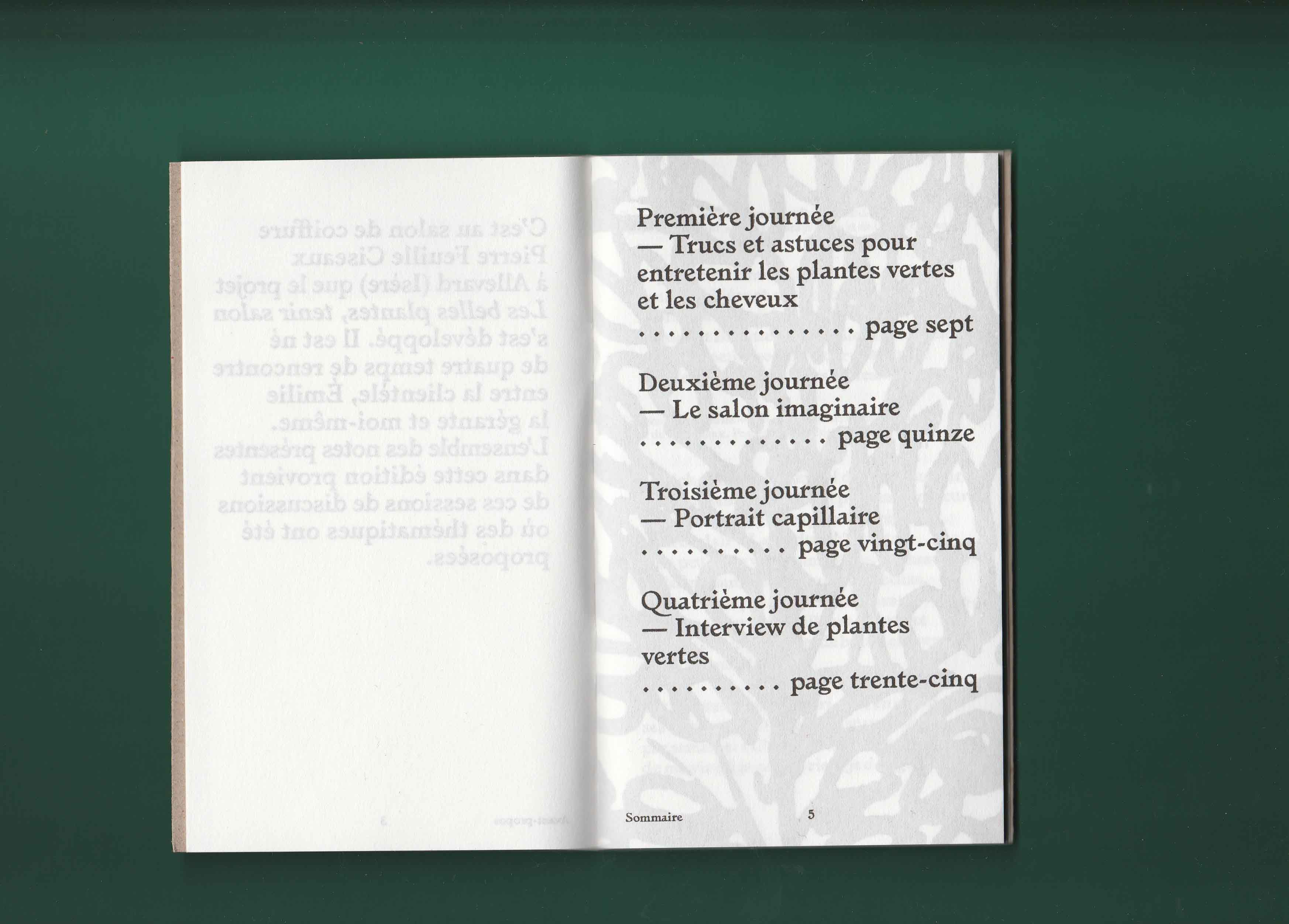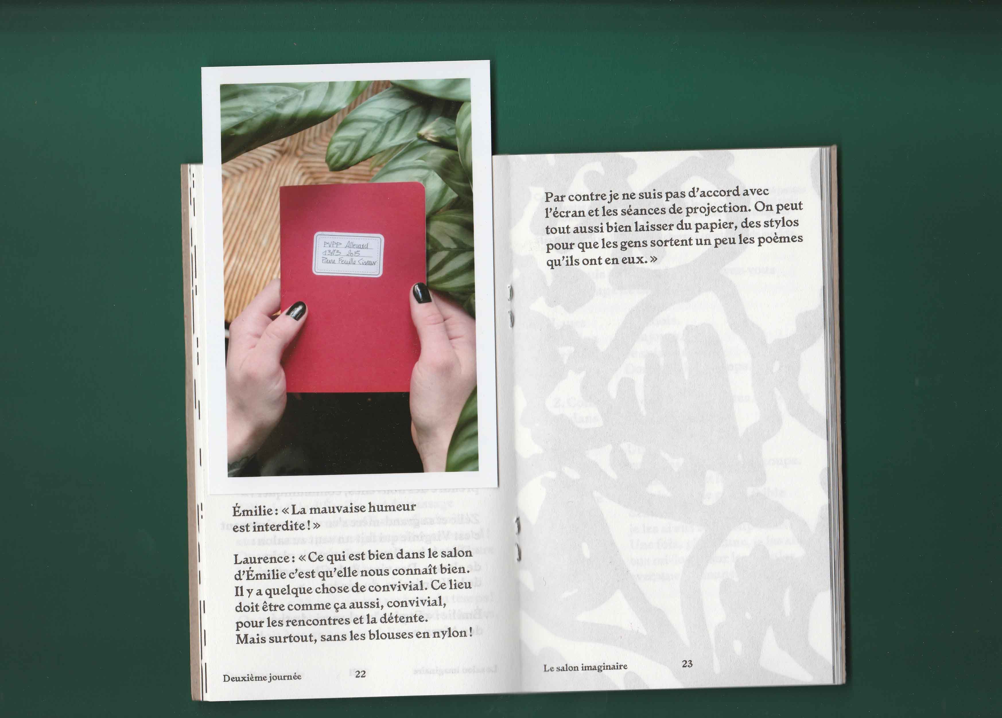 Si mon choix s’est porté sur ce salon plutôt qu’un autre endroit c’est parce que sa vitrine regorgeait de plantes vertes. On voyait alors en second plan des dames se faire coiffer. La fortuite promiscuité entre ces deux éléments, les plantes vertes et les cheveux, m’a donné envie d’explorer ces deux univers comme s’ils étaient voisins. Ils renvoient tous les deux au prendre soin et à l’entretien. Aussi l’espace du salon de coiffure m’interéssait en tant qu’espace d’intimité en dehors de la maison. Il appartient à la ville mais c’est aussi l’endroit où l’on se laisse toucher la tête et bien souvent on discute avec la personne qui nous coiffe. De là est né le projet des Belles plantes – tenir salon. À quatre reprises je me suis rendue au salon d’Emilie pour discuter avec sa clientèle de sujets en lien avec ses préoccupations. Pour expérimenter au mieux ce moment d’intimité je n’ai pris que des notes de ces entretiens. Il n’y aucune trace photo, vidéo ou sonore. Les notes ont ensuite été retranscrites dans une édition auto-éditée limité à 100 exemplaire et mise en page par Les formes associées.