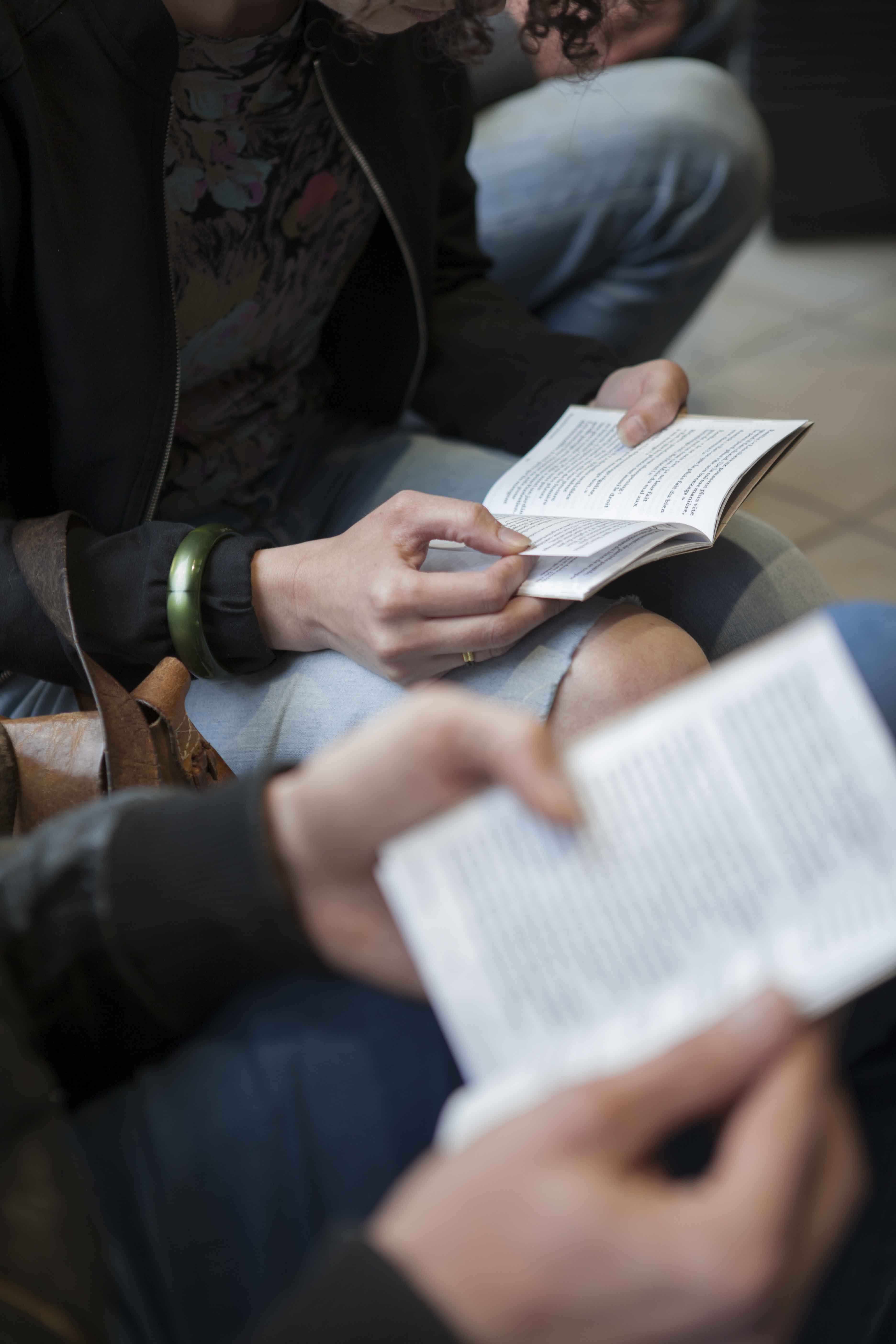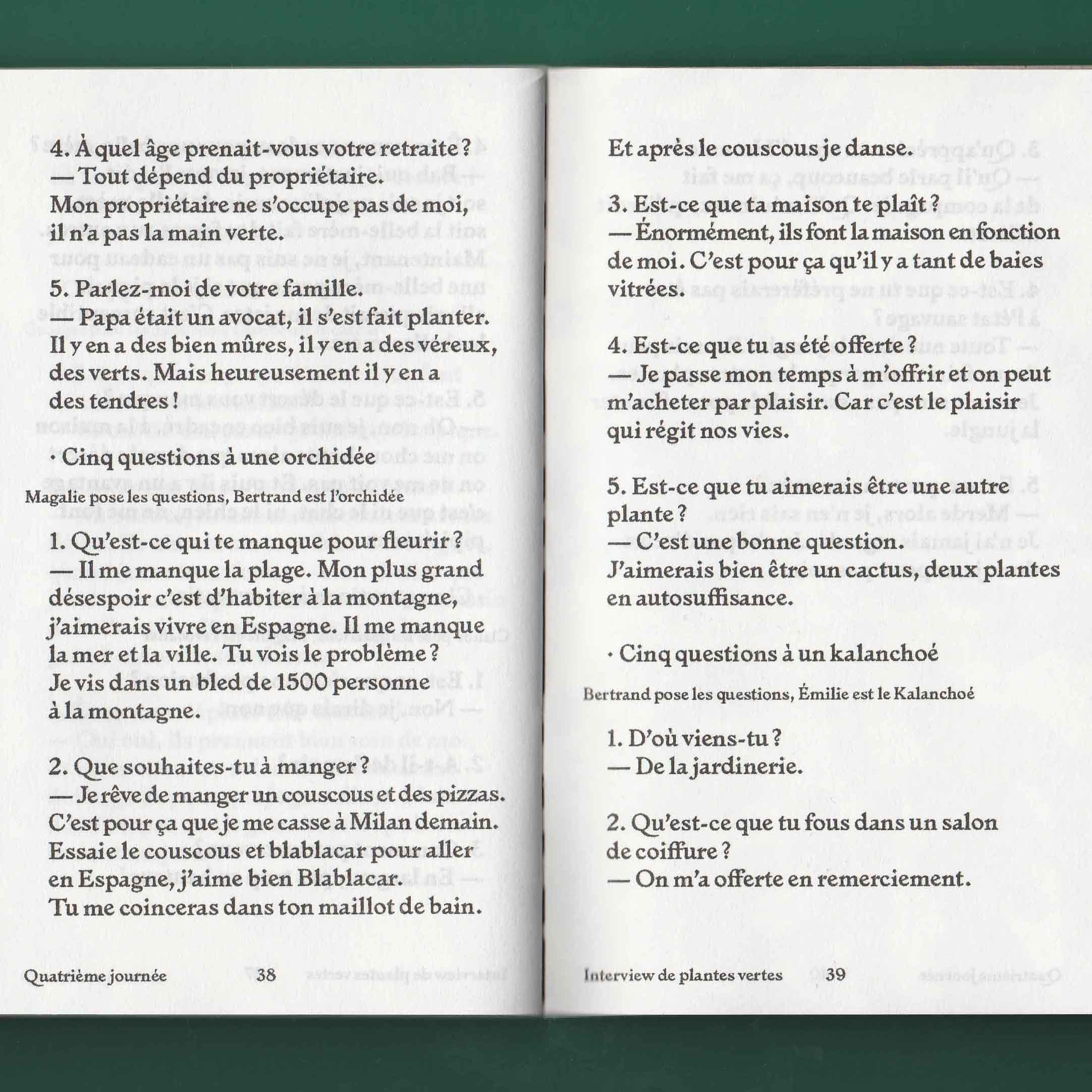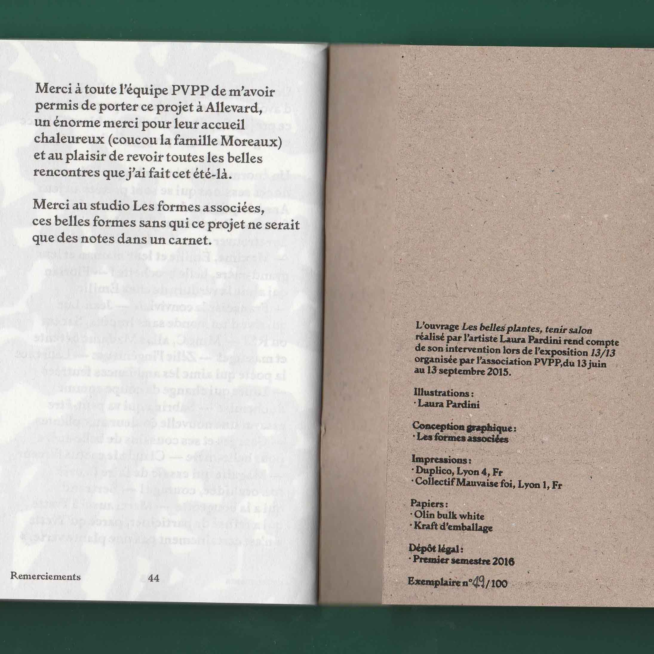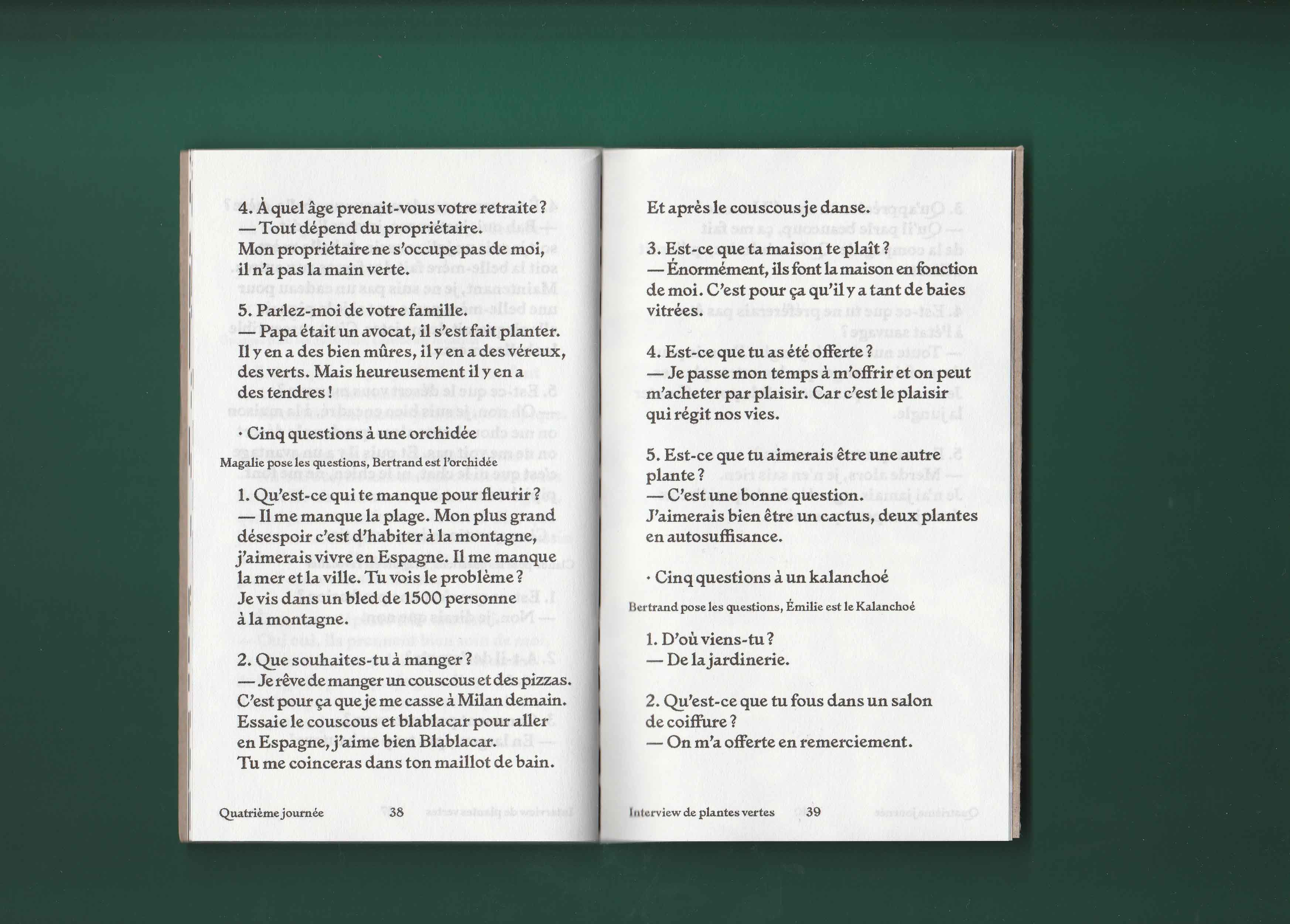 Si mon choix s’est porté sur ce salon plutôt qu’un autre endroit c’est parce que sa vitrine regorgeait de plantes vertes. On voyait alors en second plan des dames se faire coiffer. La fortuite promiscuité entre ces deux éléments, les plantes vertes et les cheveux, m’a donné envie d’explorer ces deux univers comme s’ils étaient voisins. Ils renvoient tous les deux au prendre soin et à l’entretien. Aussi l’espace du salon de coiffure m’interéssait en tant qu’espace d’intimité en dehors de la maison. Il appartient à la ville mais c’est aussi l’endroit où l’on se laisse toucher la tête et bien souvent on discute avec la personne qui nous coiffe. De là est né le projet des Belles plantes – tenir salon. À quatre reprises je me suis rendue au salon d’Emilie pour discuter avec sa clientèle de sujets en lien avec ses préoccupations. Pour expérimenter au mieux ce moment d’intimité je n’ai pris que des notes de ces entretiens. Il n’y aucune trace photo, vidéo ou sonore. Les notes ont ensuite été retranscrites dans une édition auto-éditée limité à 100 exemplaire et mise en page par Les formes associées.