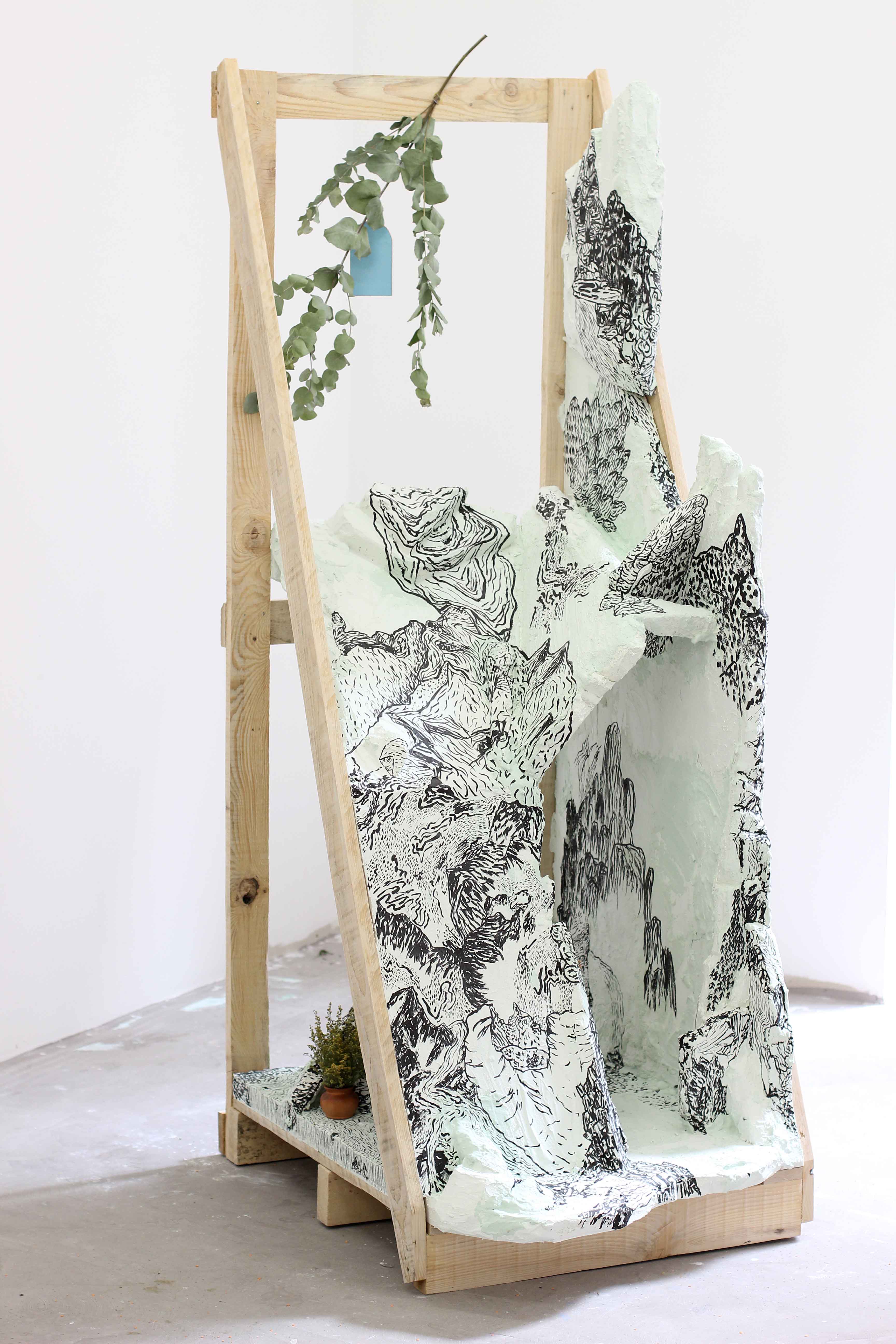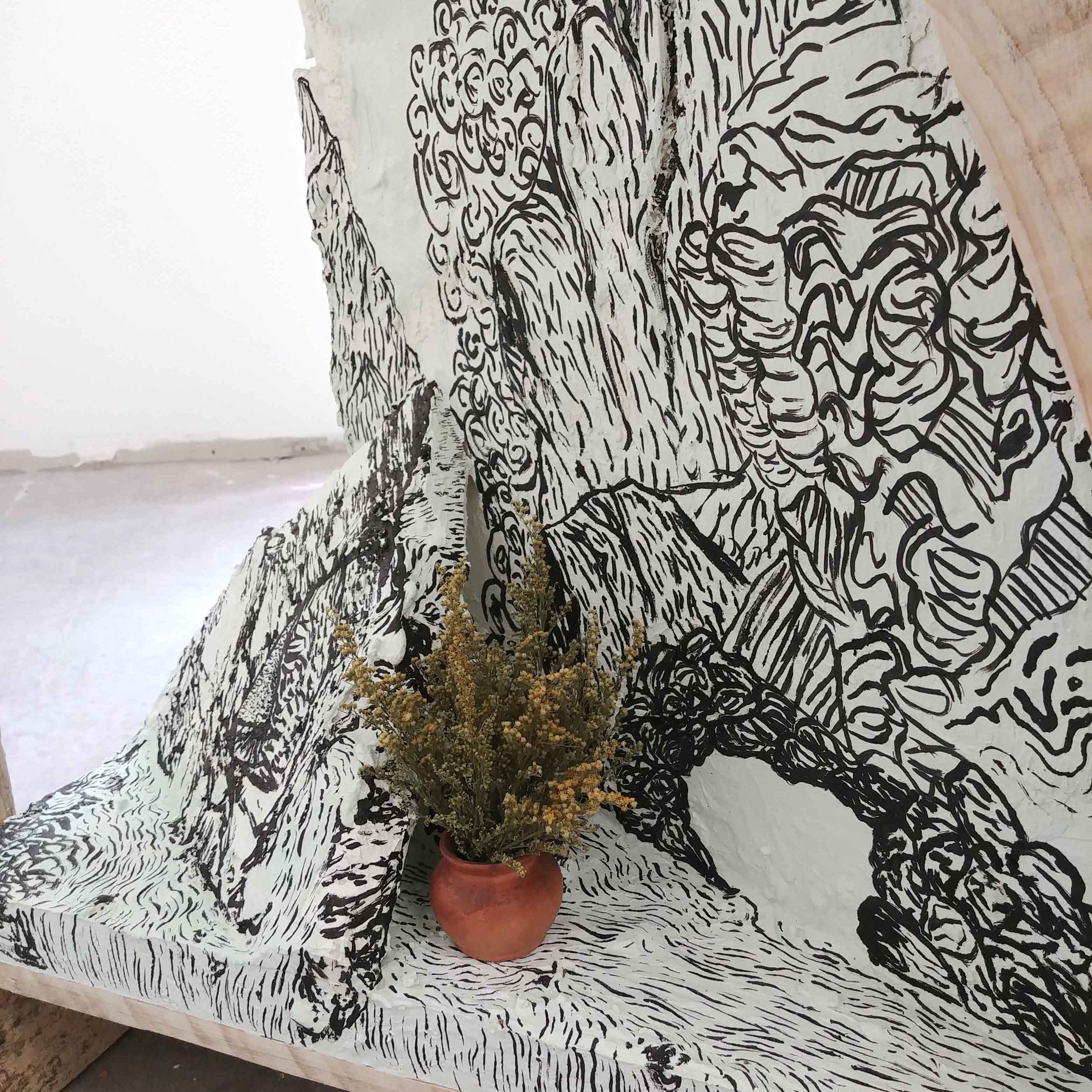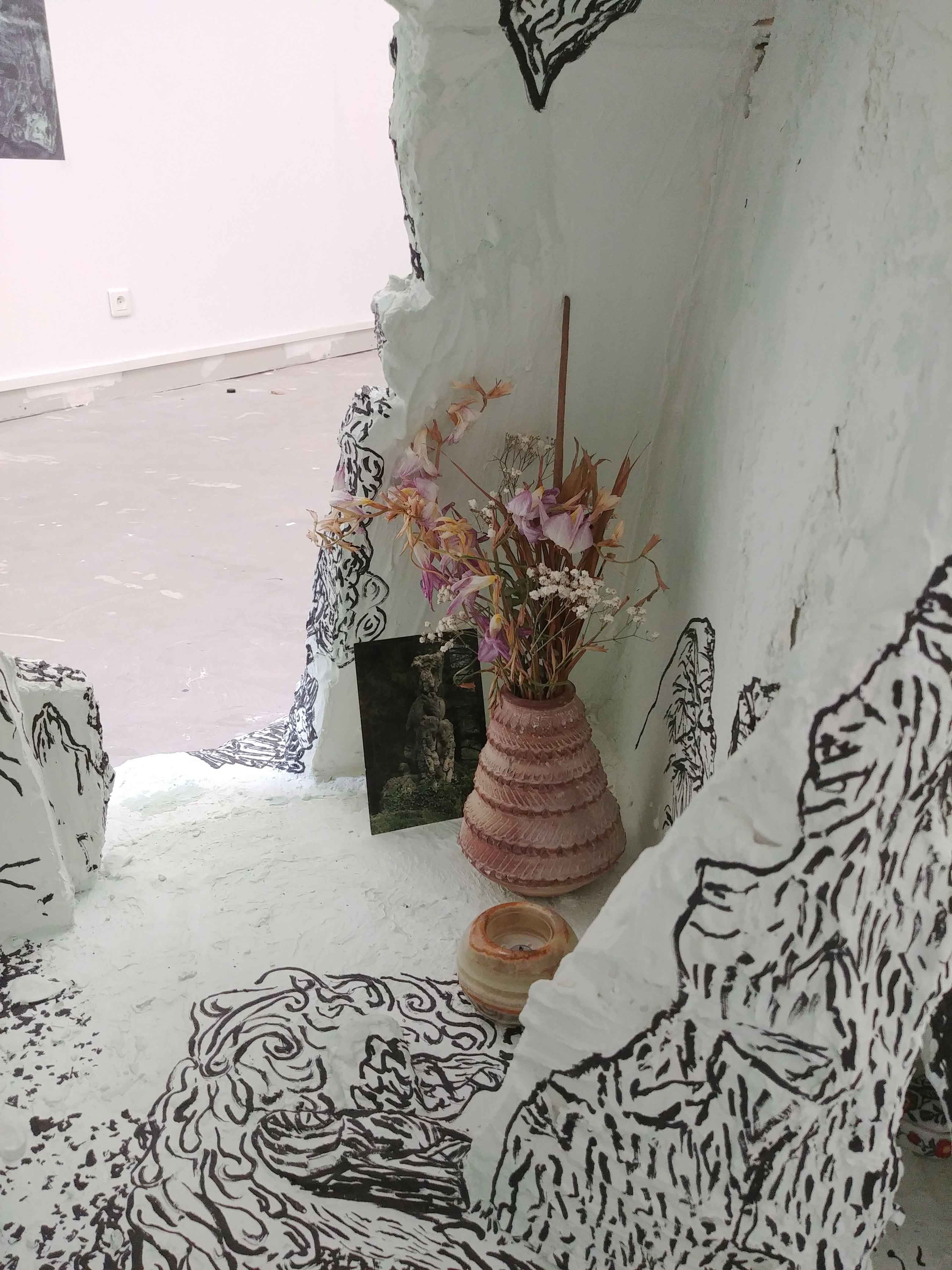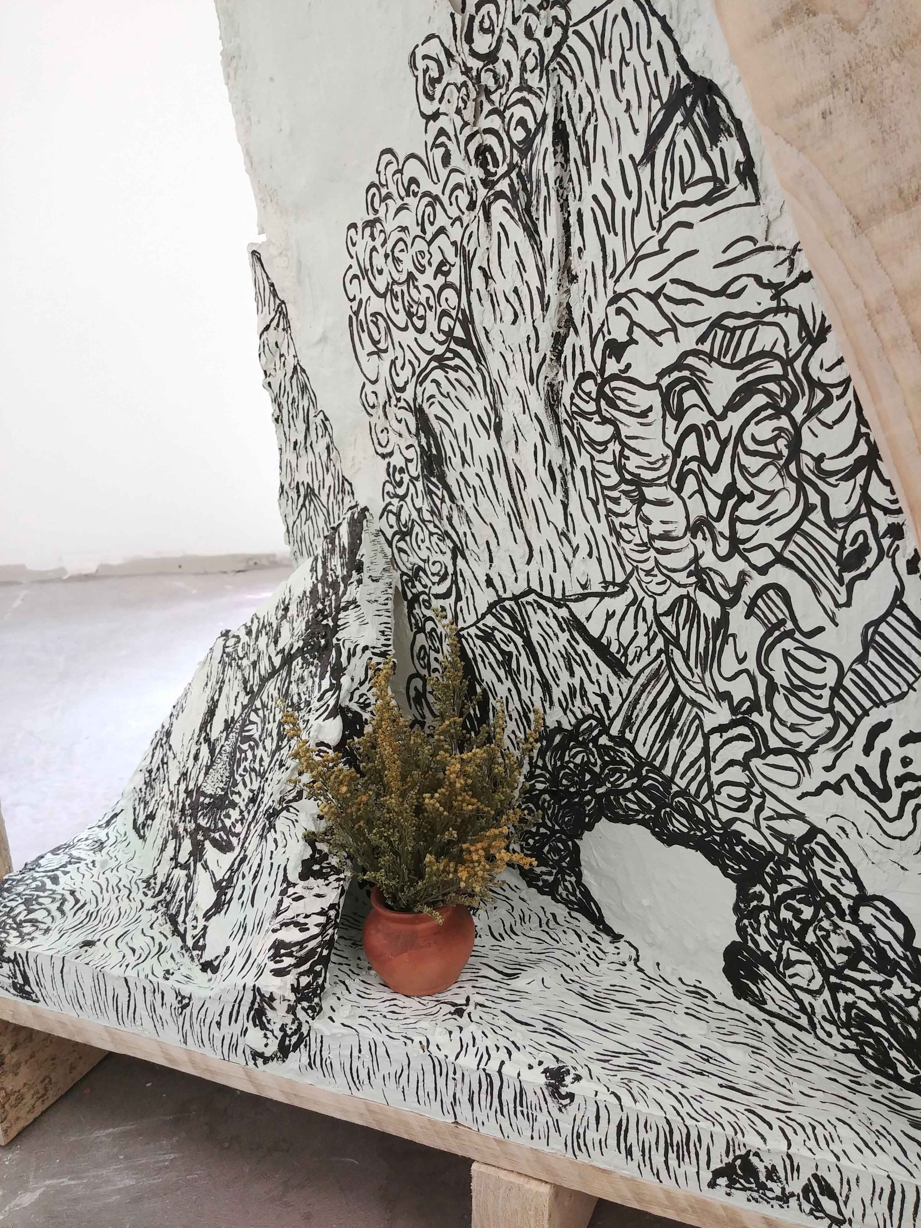 Bois, plâtre, encre de Chine, végétaux séchés, cartonette colorée, carte postale, pots en terre et bougeoir en pierre
