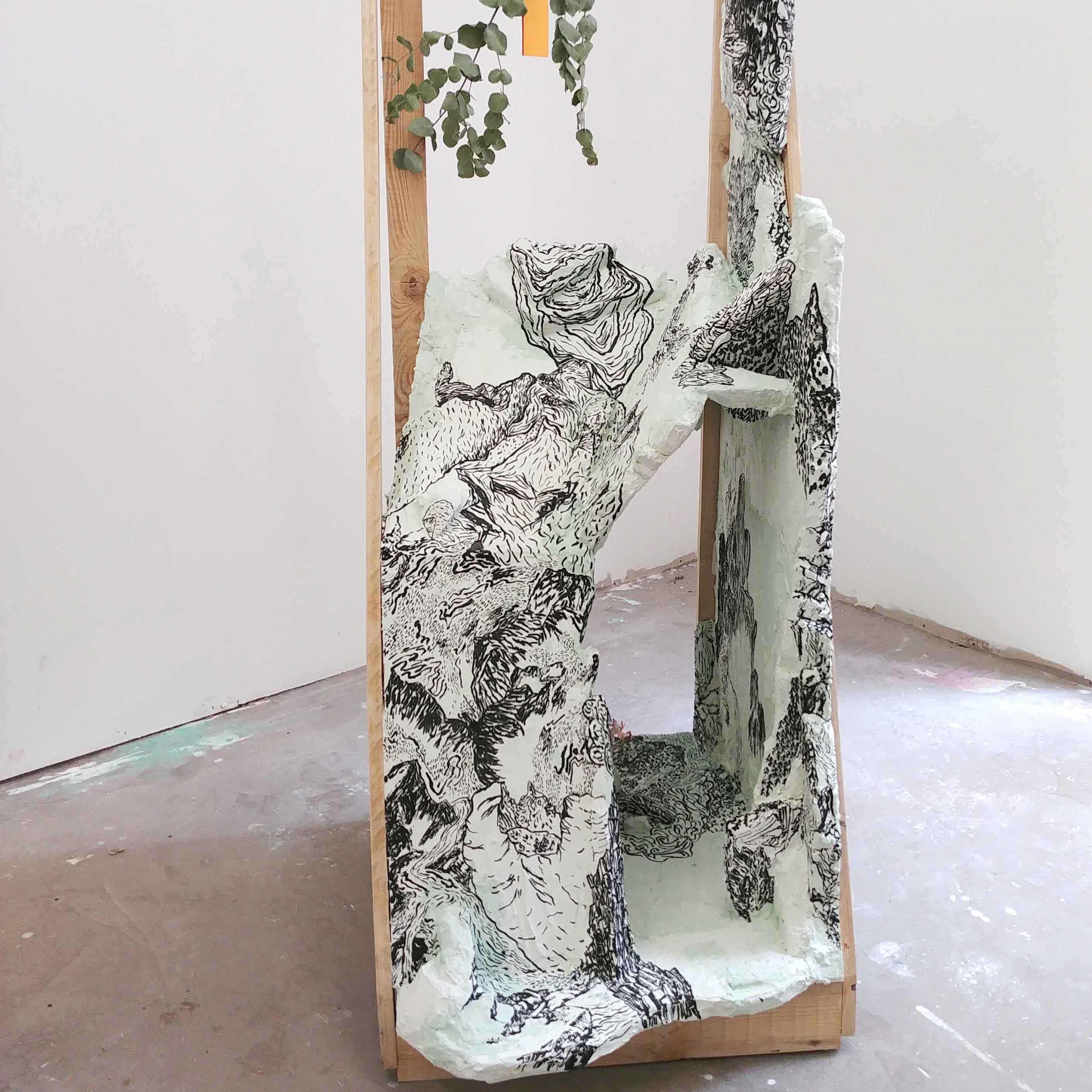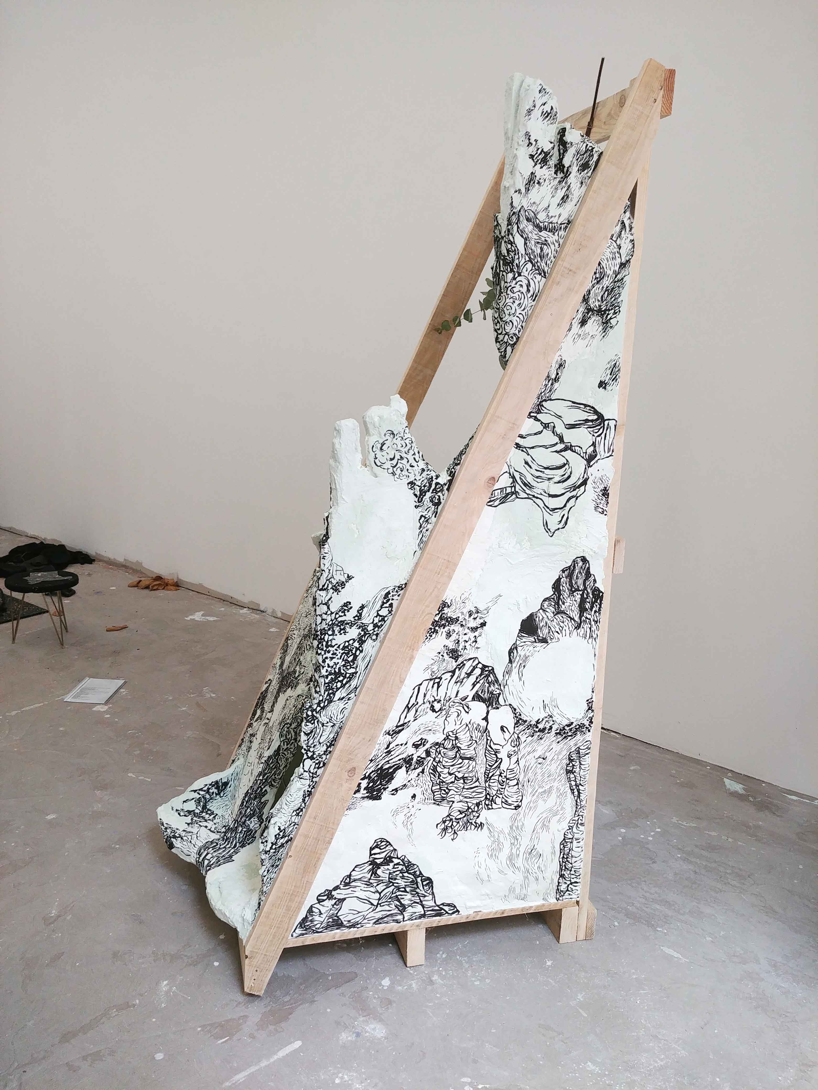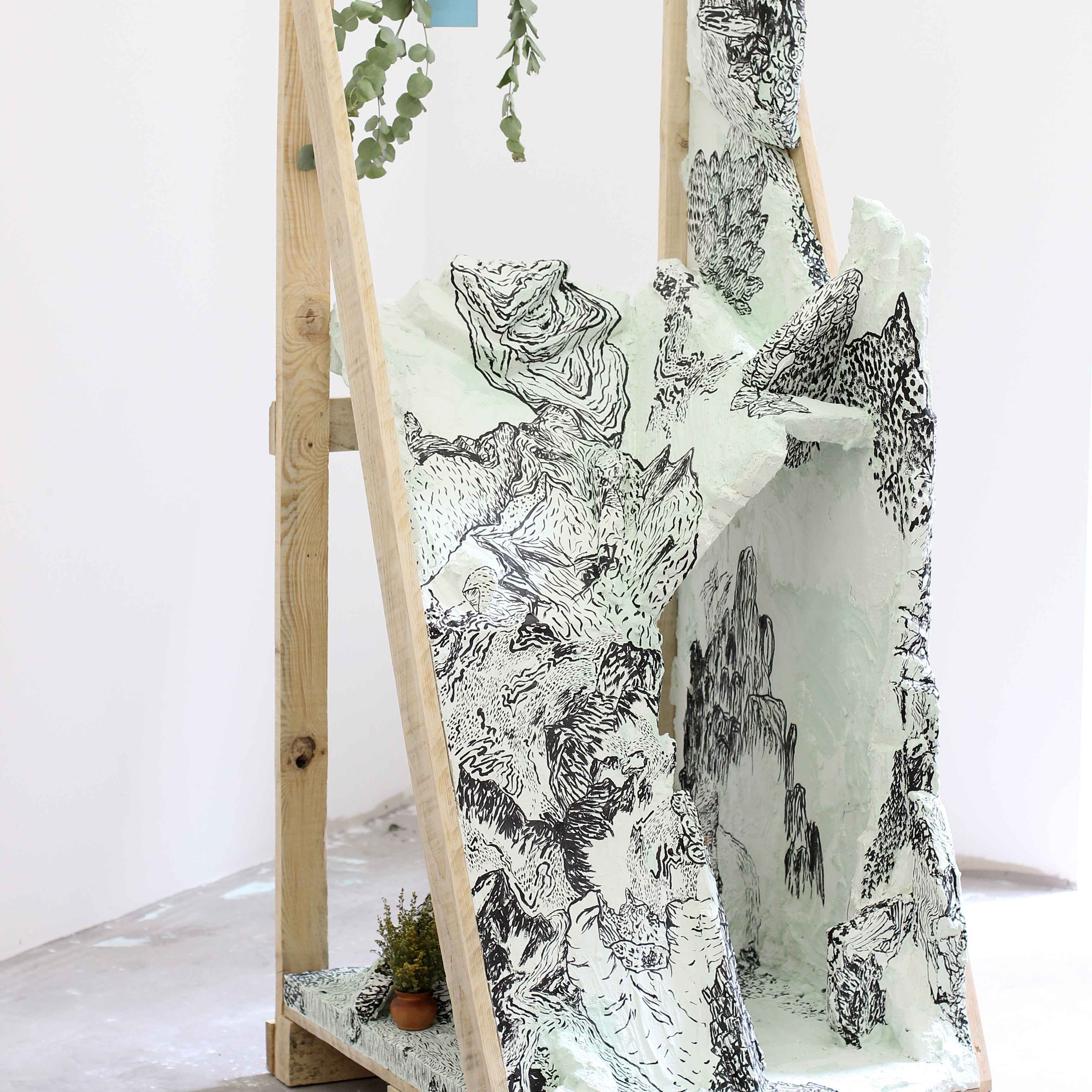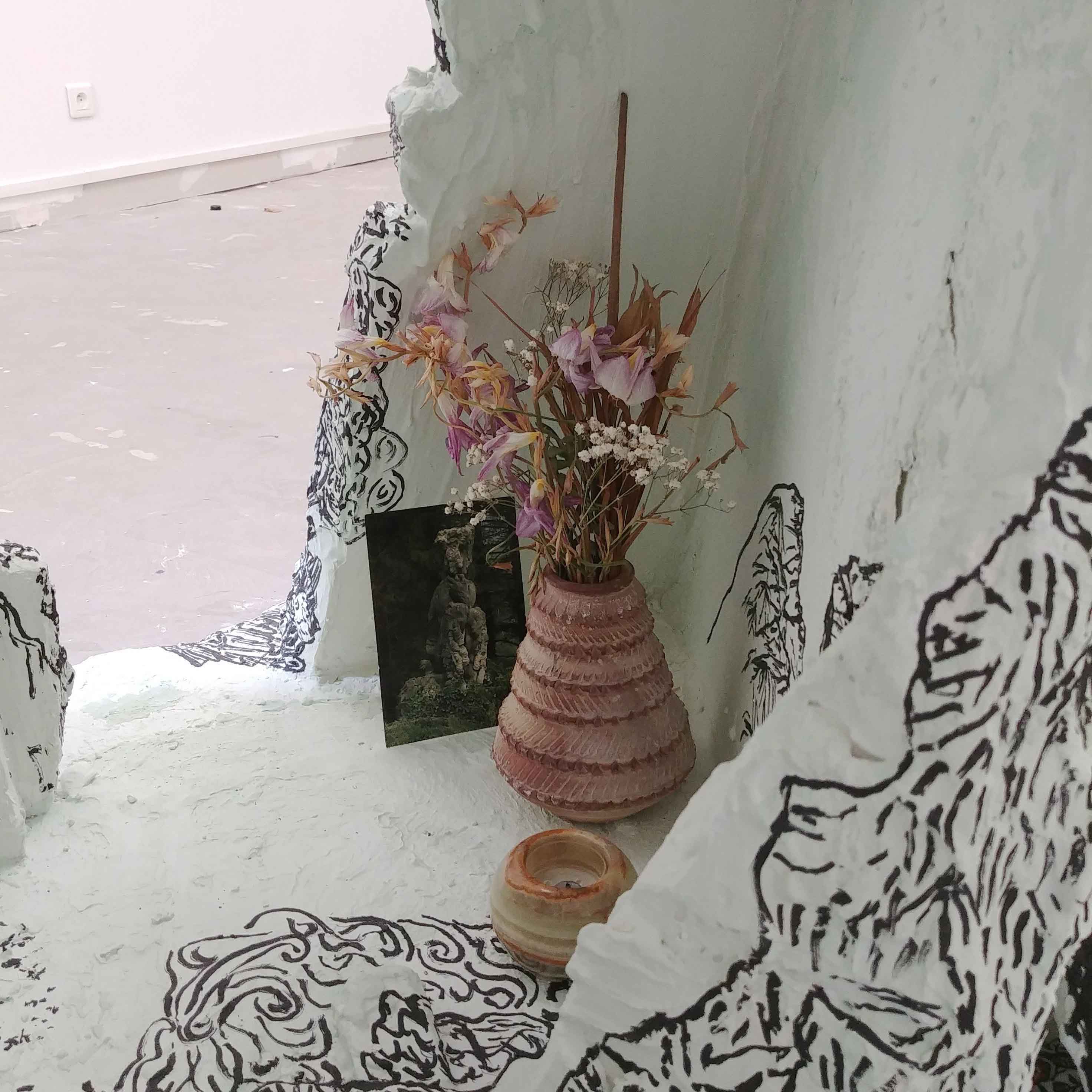 Bois, plâtre, encre de Chine, végétaux séchés, cartonette colorée, carte postale, pots en terre et bougeoir en pierre