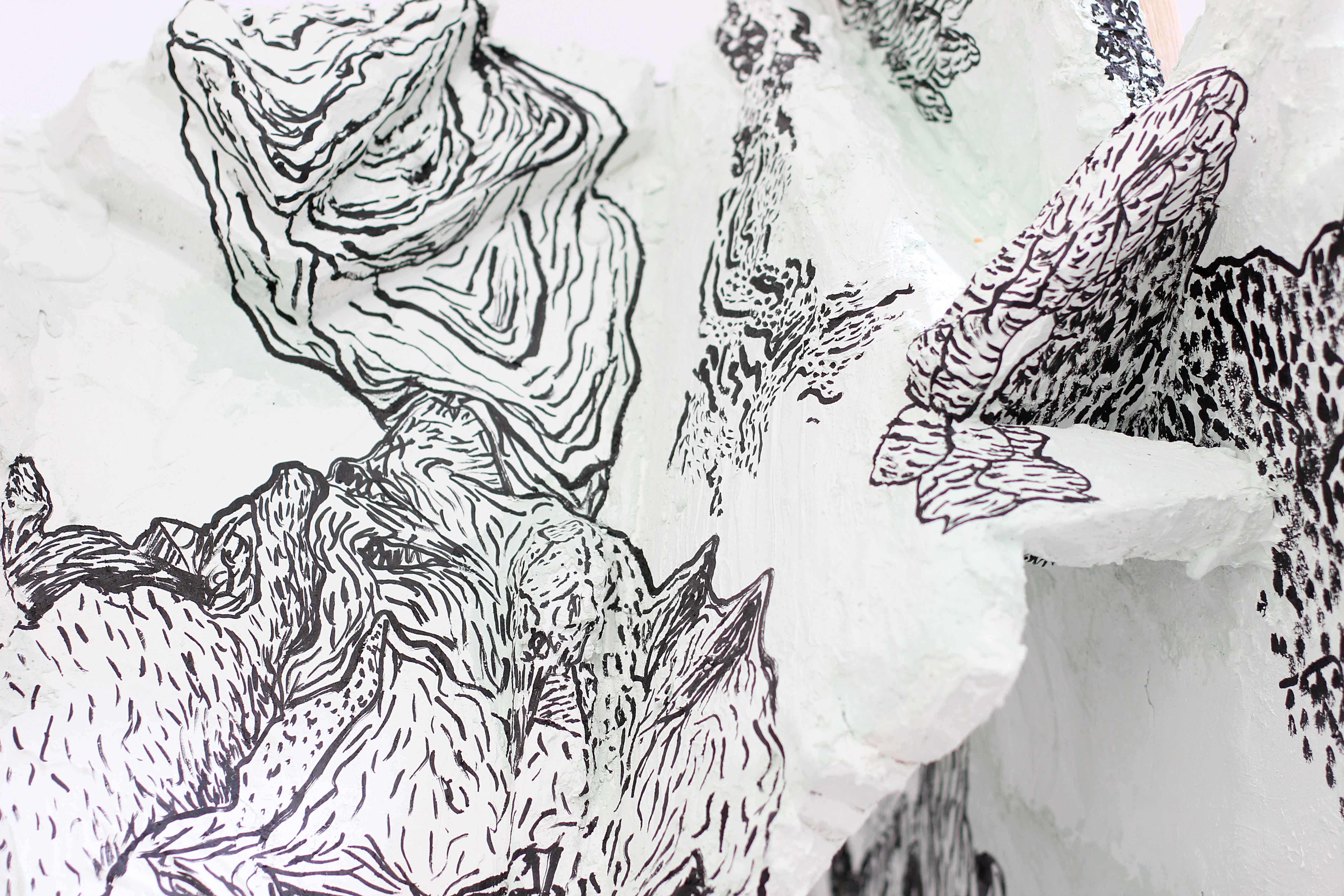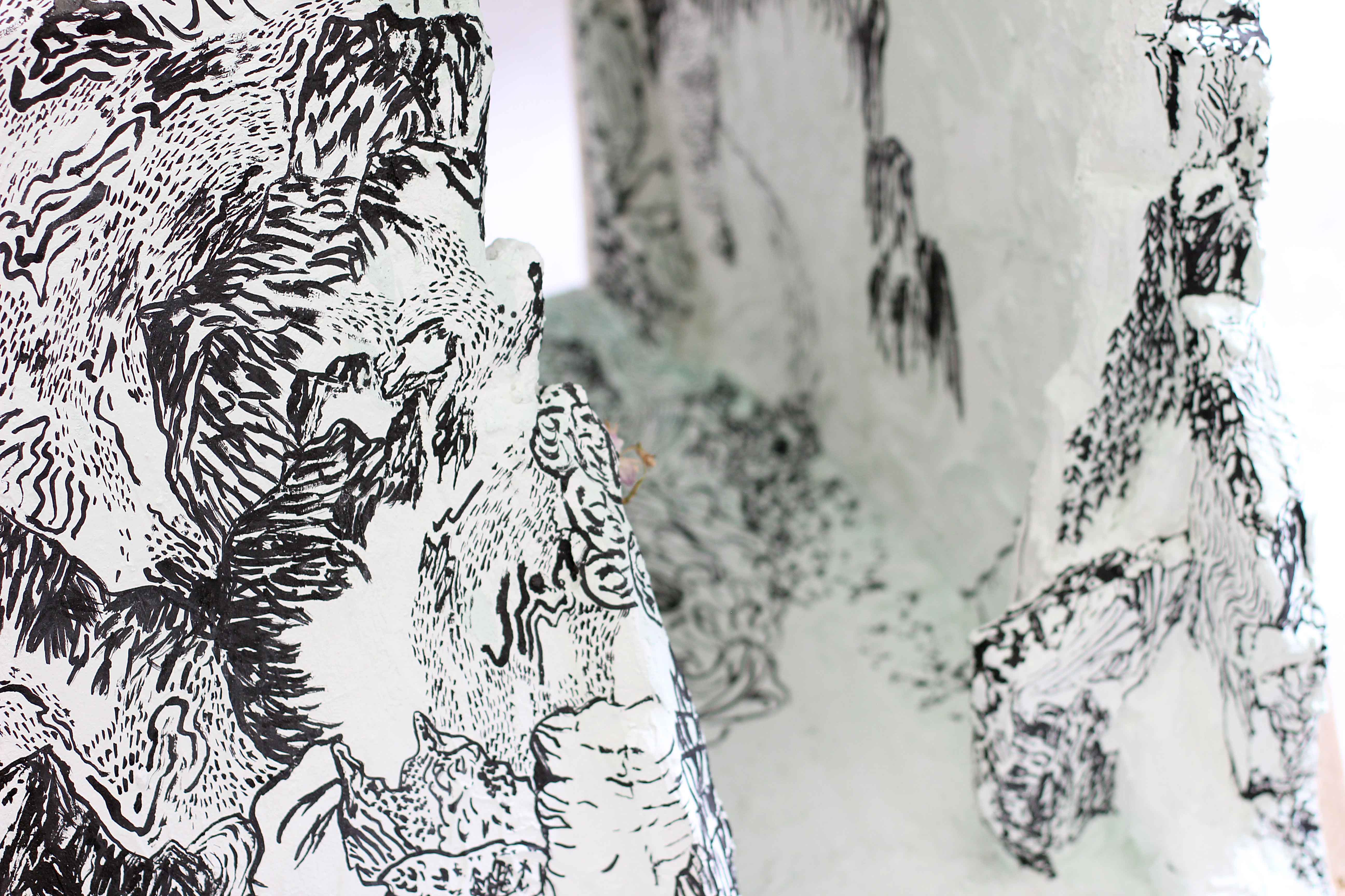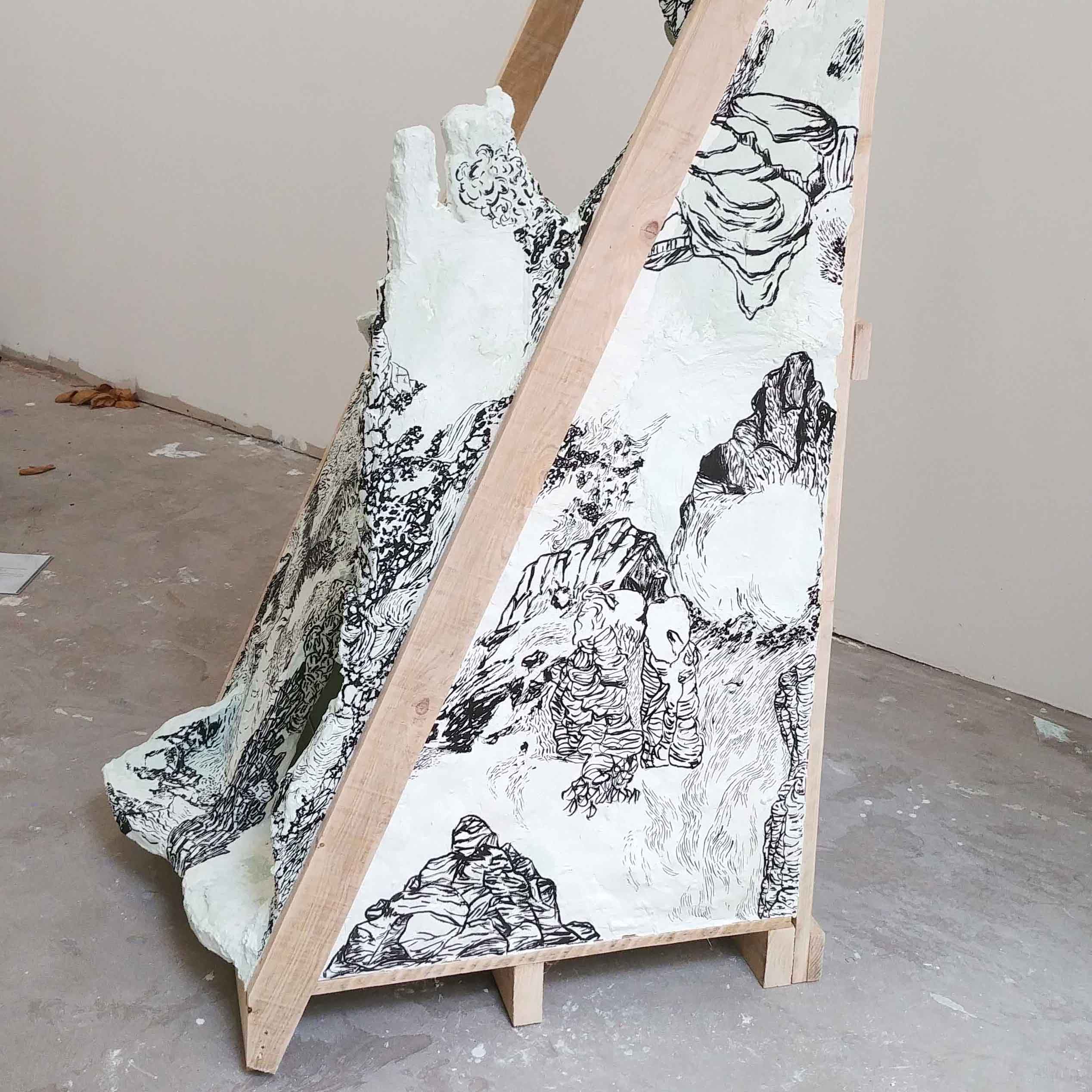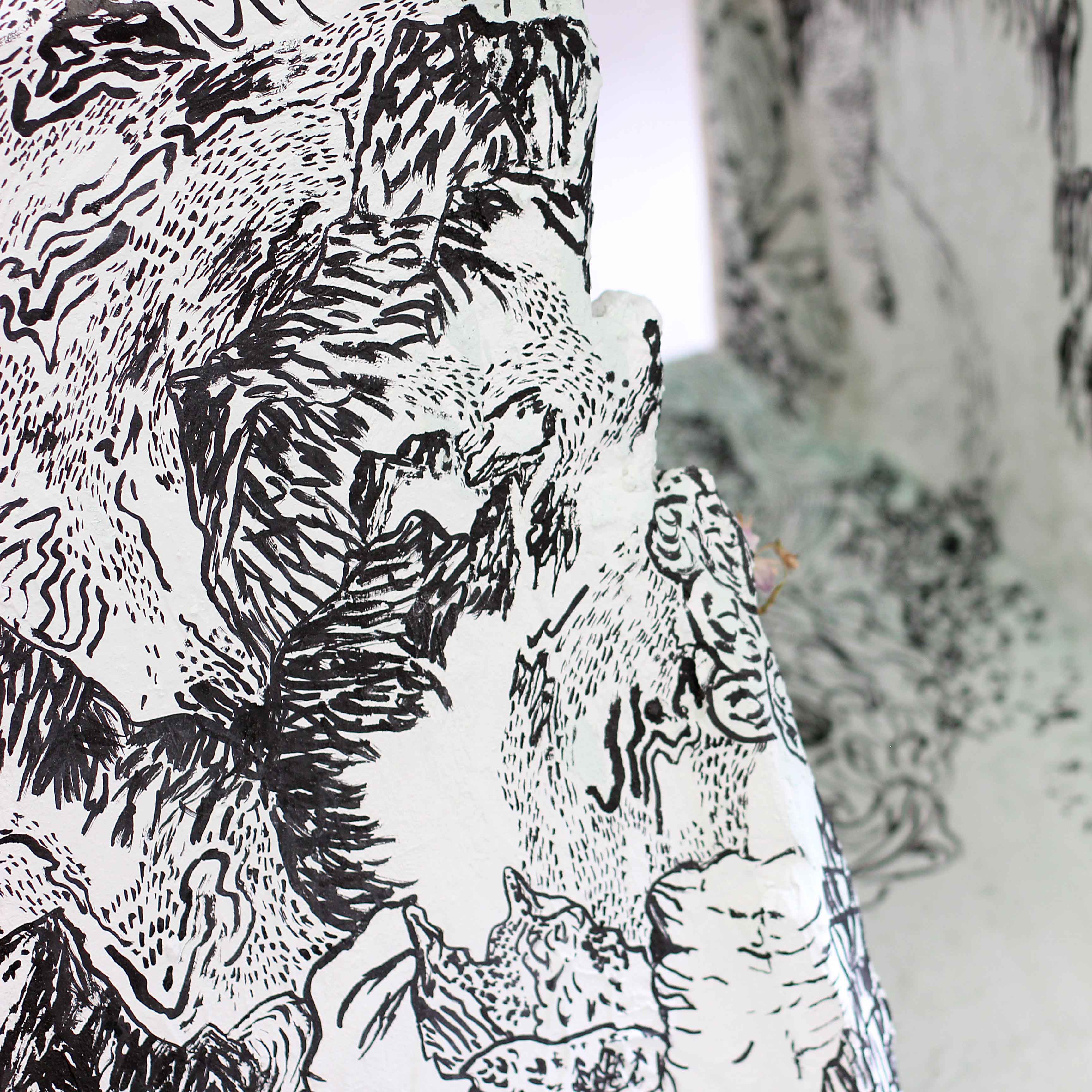 Bois, plâtre, encre de Chine, végétaux séchés, cartonette colorée, carte postale, pots en terre et bougeoir en pierre