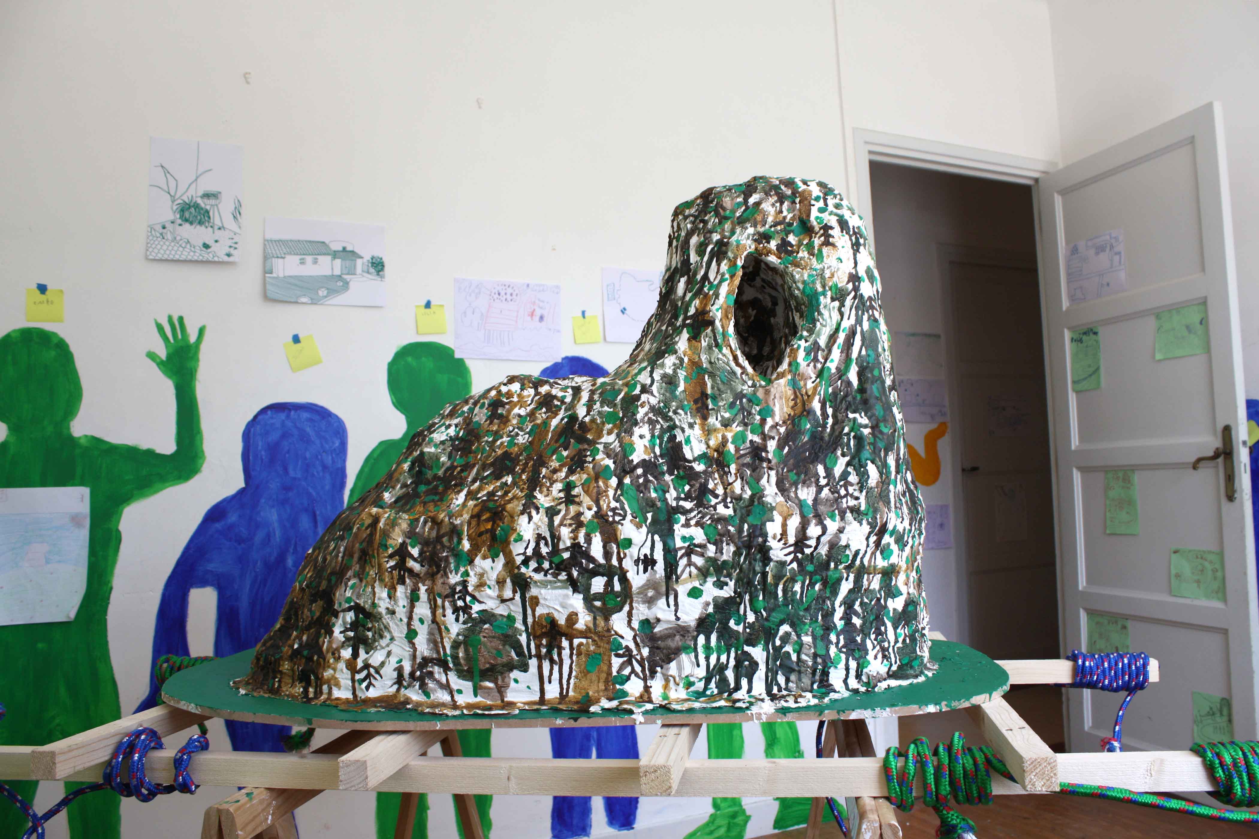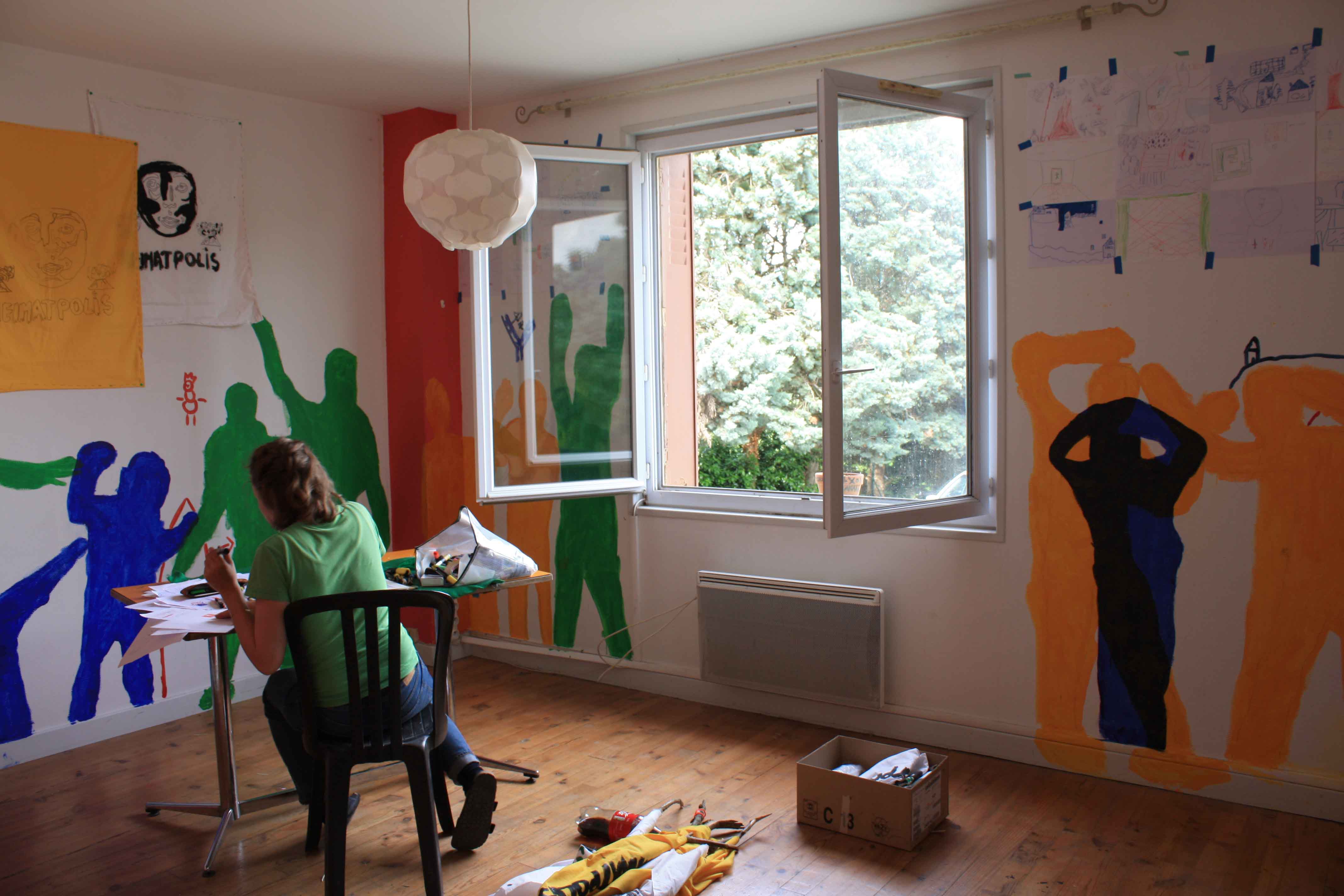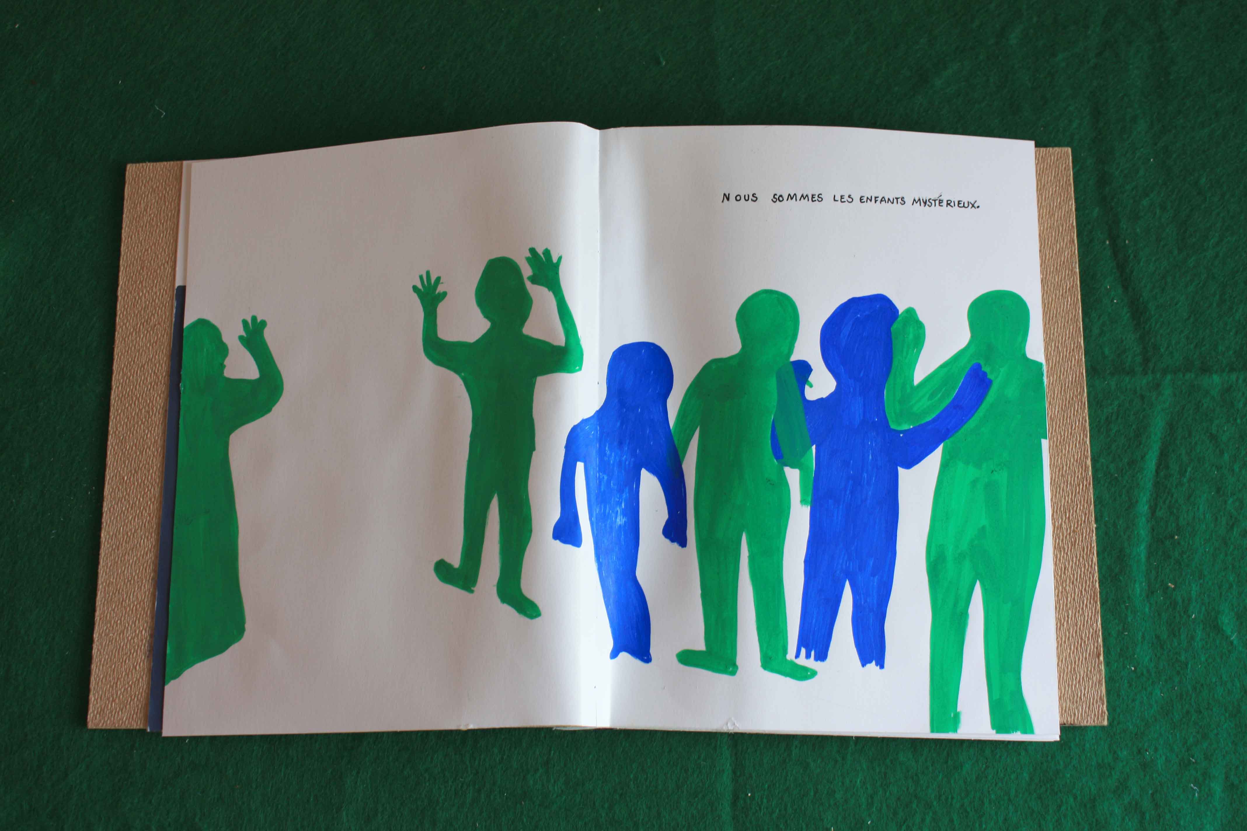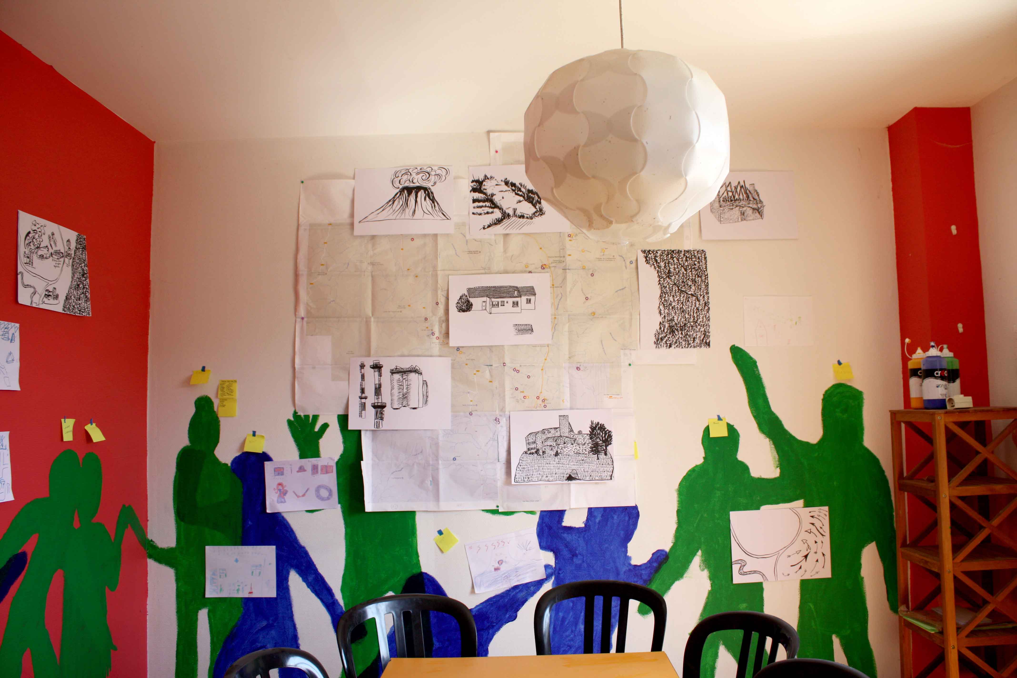 Au cours de ces cinq mois de travail avec les élèves de l’école primaire de Saint-Lager-Bressac nous avons construit une légende. Celle d’Heimatpolis et des enfants mystérieux. Nous avons pris possession du Quartier-Général où de belles plantes poussent et où des silhouettes mystérieuses habitent les murs. Et puis un soir on a pu voir les enfants mystérieux parés de bandanas verts, portant des banderoles et agitant des maracas de cailloux. Ils ont traversé le village et ont ramené à leur Q.-G. un trésor, celui qui permet de réactiver Andance le volcan endormi. Maintenant ils ont un livre dans leur école qui raconte cette histoire et qui permettra, on l’espère, de guider les prochains enfants mystérieux.