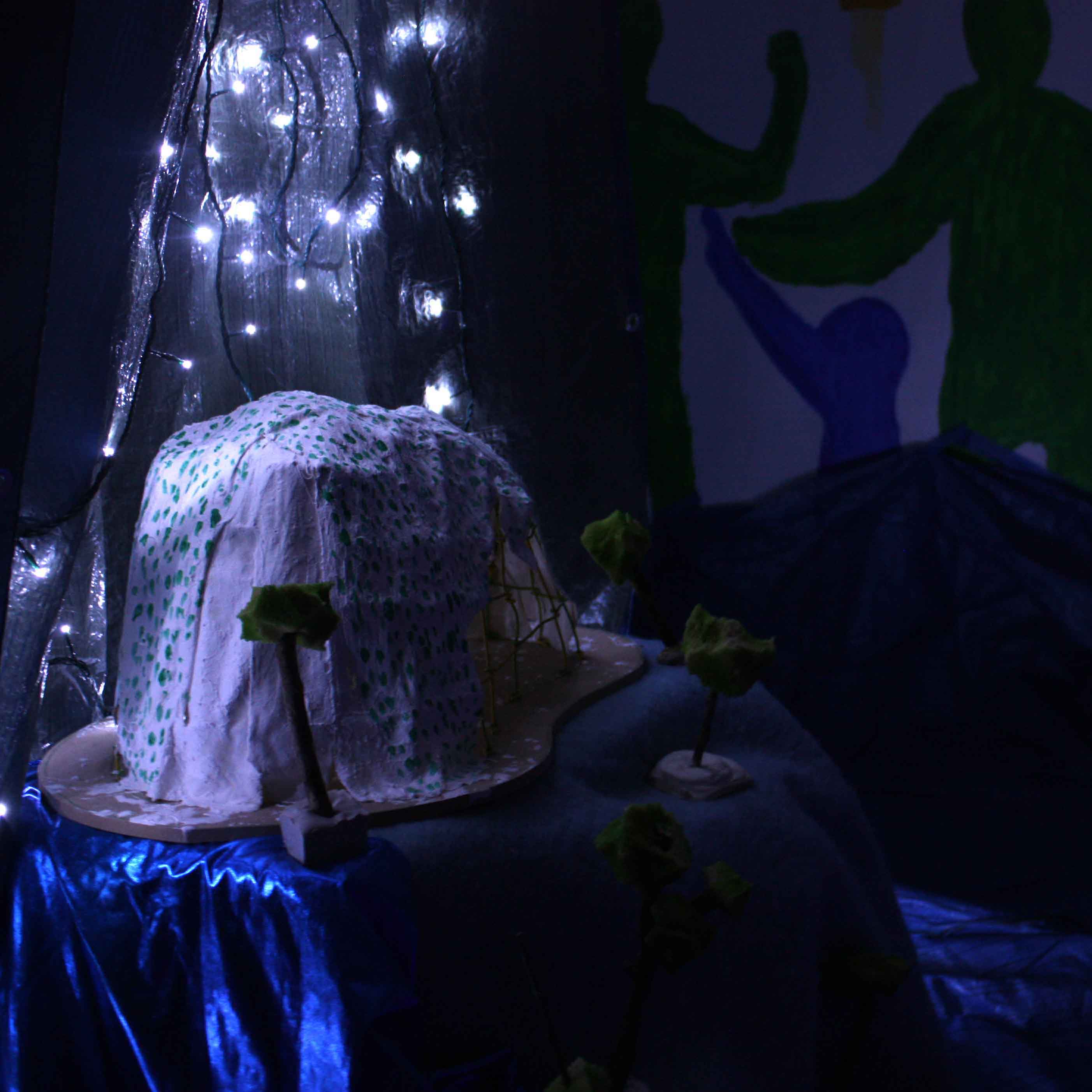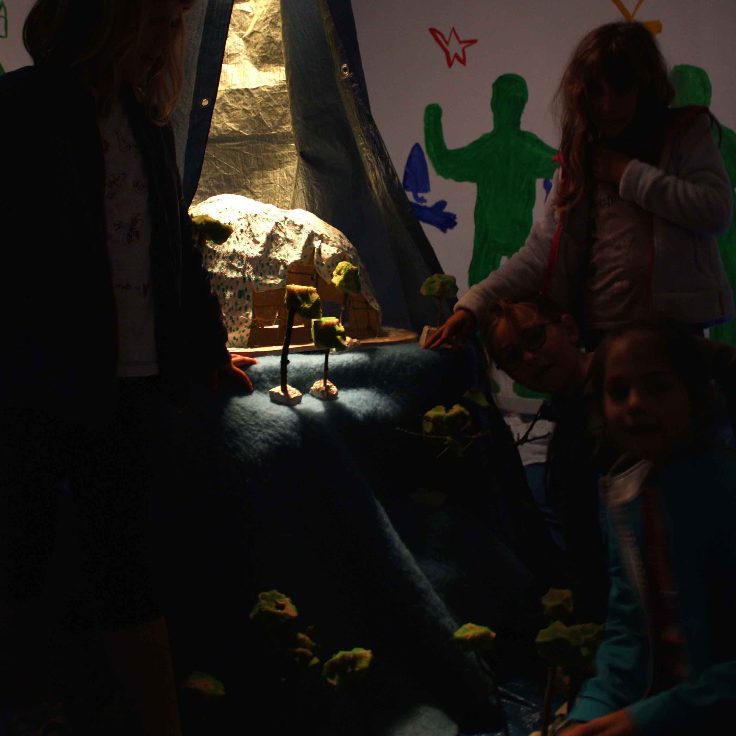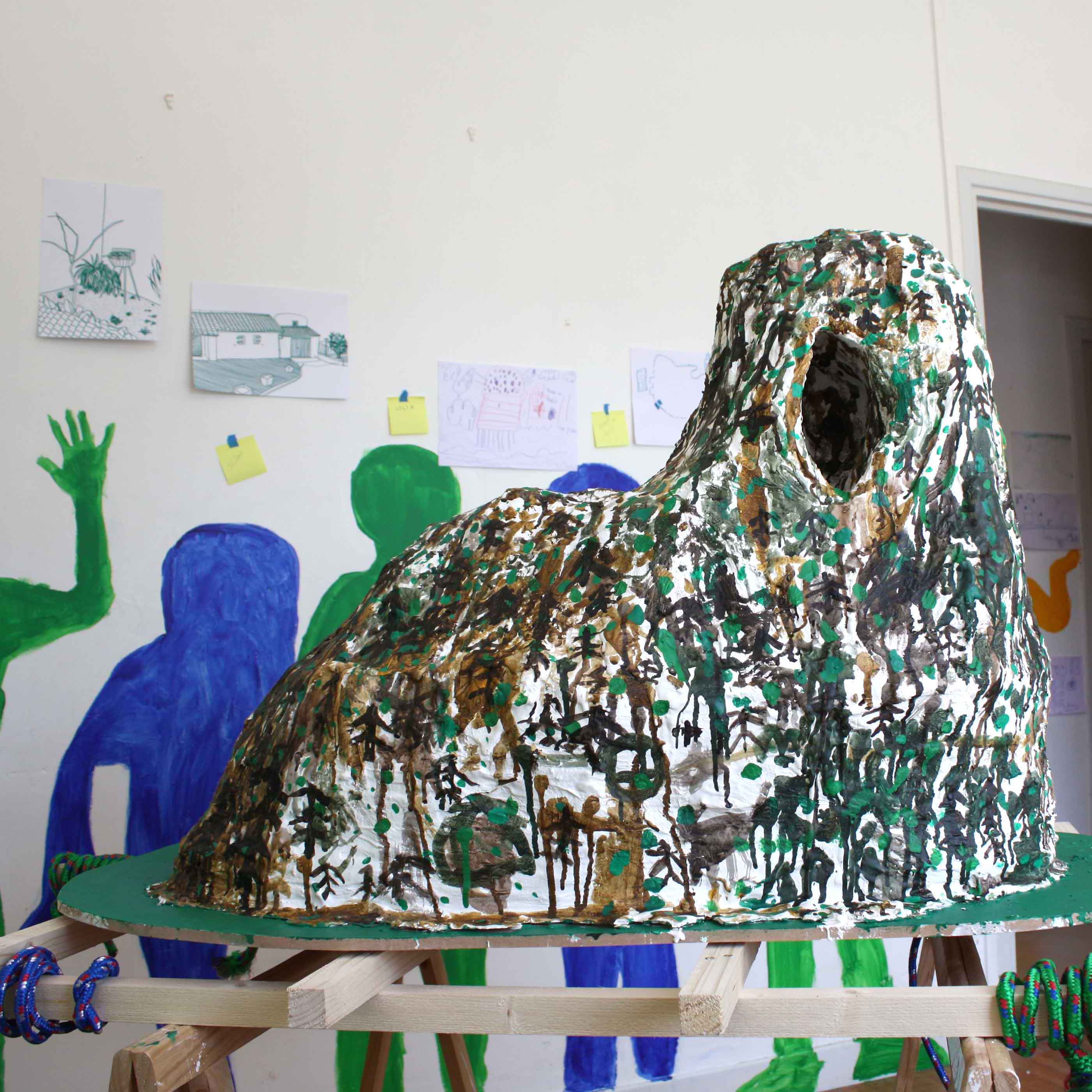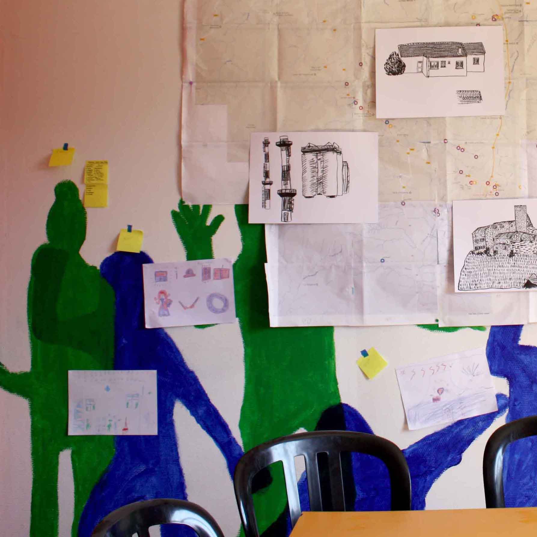 Au cours de ces cinq mois de travail avec les élèves de l’école primaire de Saint-Lager-Bressac nous avons construit une légende. Celle d’Heimatpolis et des enfants mystérieux. Nous avons pris possession du Quartier-Général où de belles plantes poussent et où des silhouettes mystérieuses habitent les murs. Et puis un soir on a pu voir les enfants mystérieux parés de bandanas verts, portant des banderoles et agitant des maracas de cailloux. Ils ont traversé le village et ont ramené à leur Q.-G. un trésor, celui qui permet de réactiver Andance le volcan endormi. Maintenant ils ont un livre dans leur école qui raconte cette histoire et qui permettra, on l’espère, de guider les prochains enfants mystérieux.