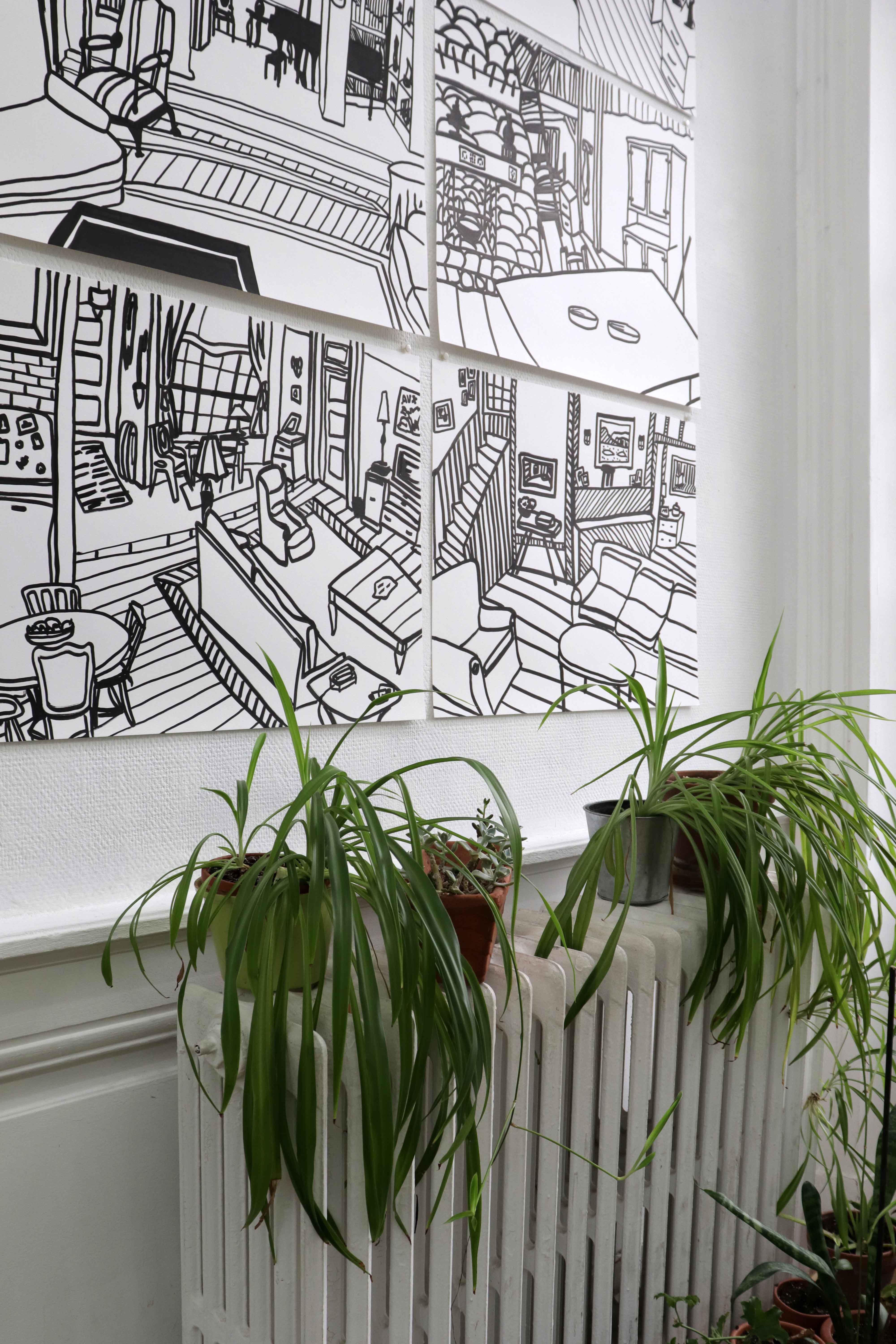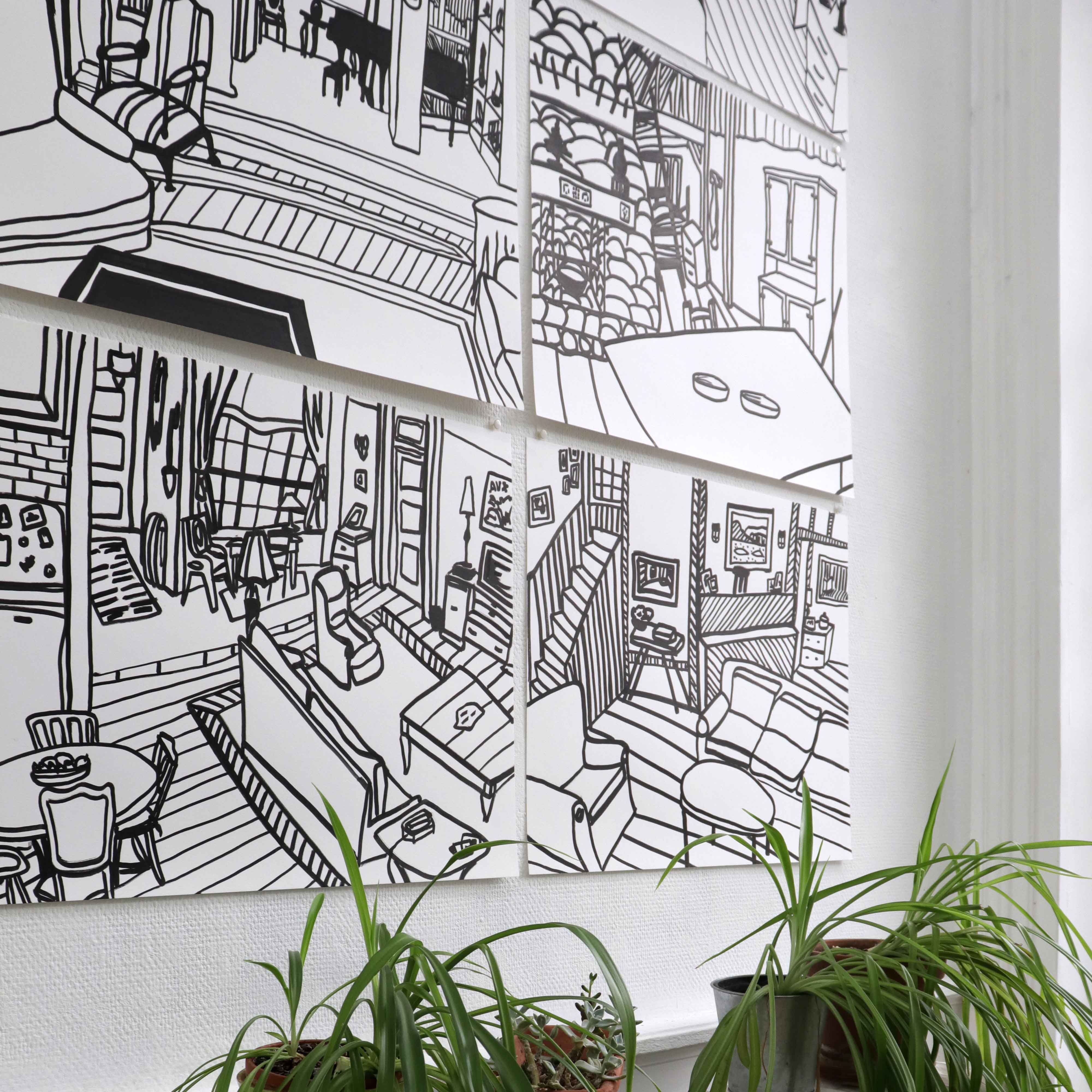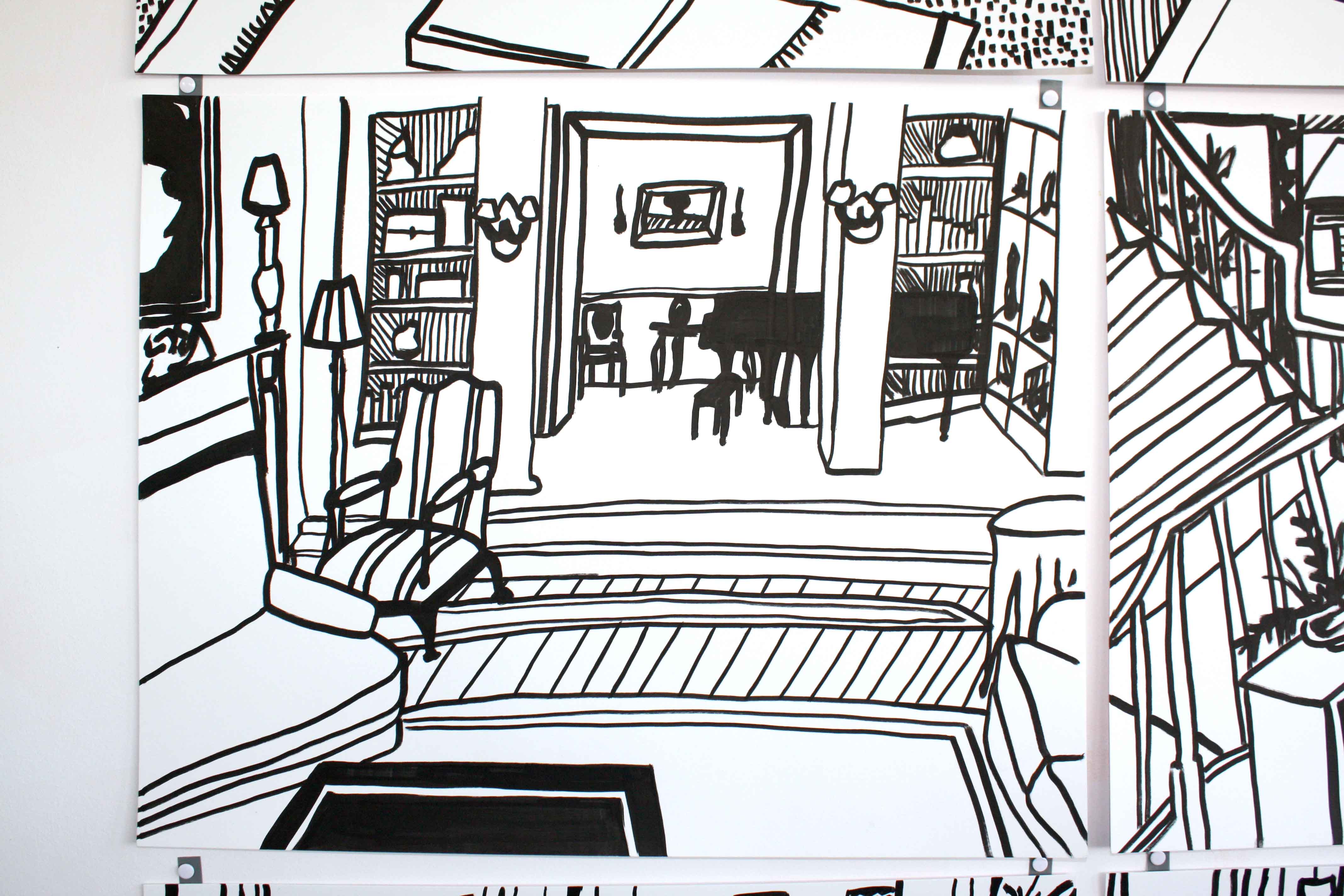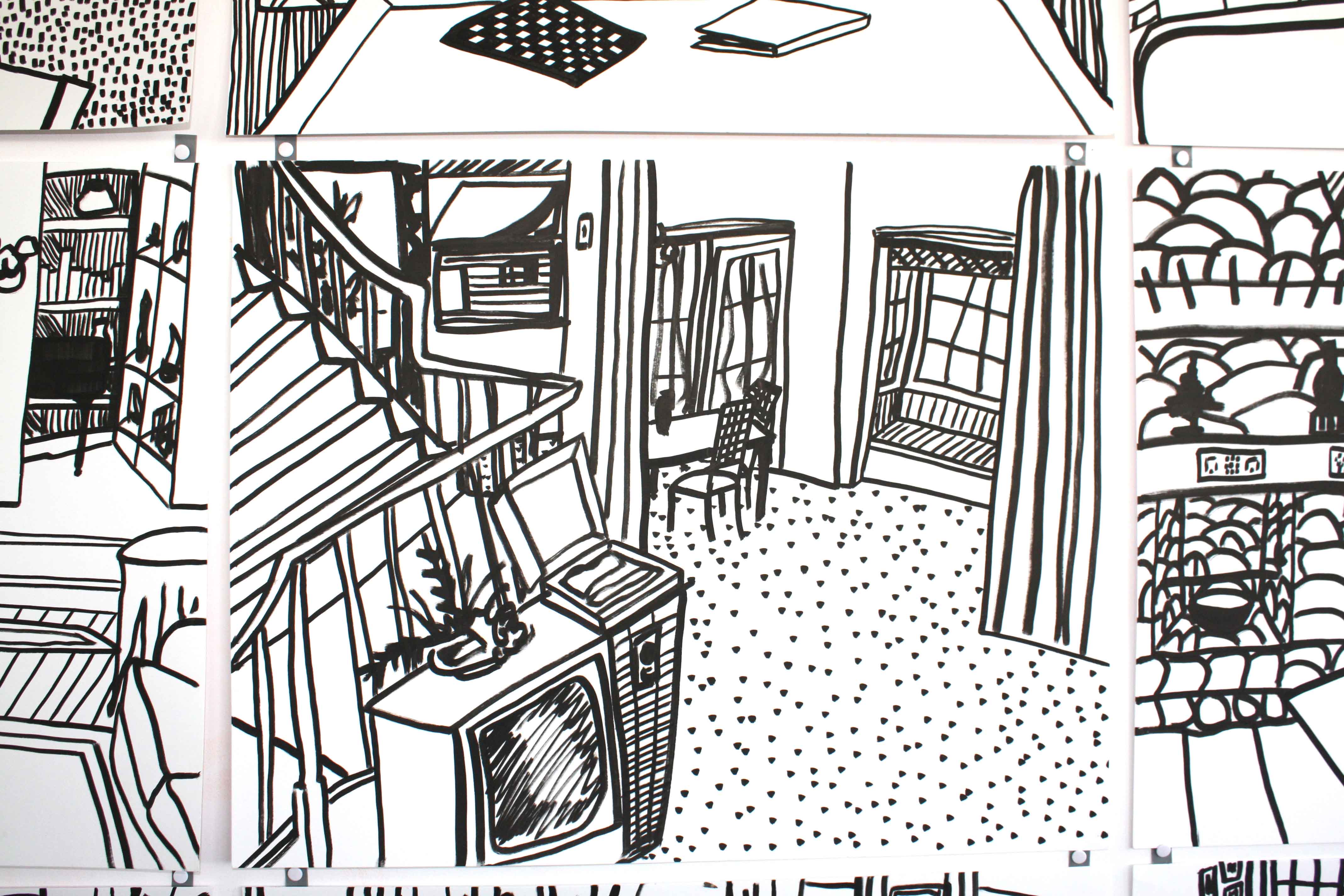 Cette série de dessins reprend des living-rooms de séries télévisées américaines datant de 1964 à 2005. Pour chacune de ces séries la caméra filme depuis un angle fixe, nous regardons ainsi la scène depuis le « quatrième mur ». Chacune de ces séries montre un noyau familial ou amical et dépeint des moments de vie au sein de leur foyer. Les séries présentes sont : Le prince de Bel-air, Scrubs, Mariés deux enfants, Une nounou d’enfer, Ma sorcière bien-aimée, La petite maison dans la prairie, Ma famille d’abord, Friends et Notre belle famille.