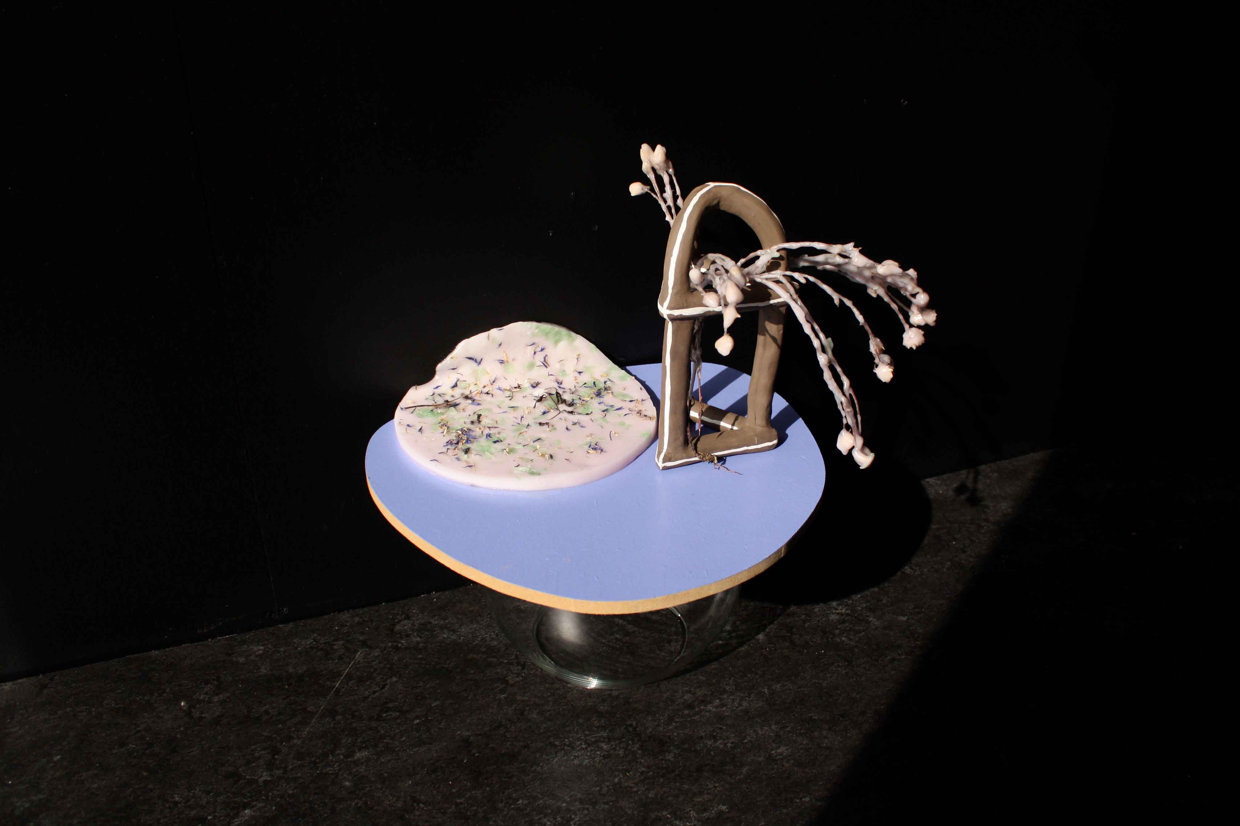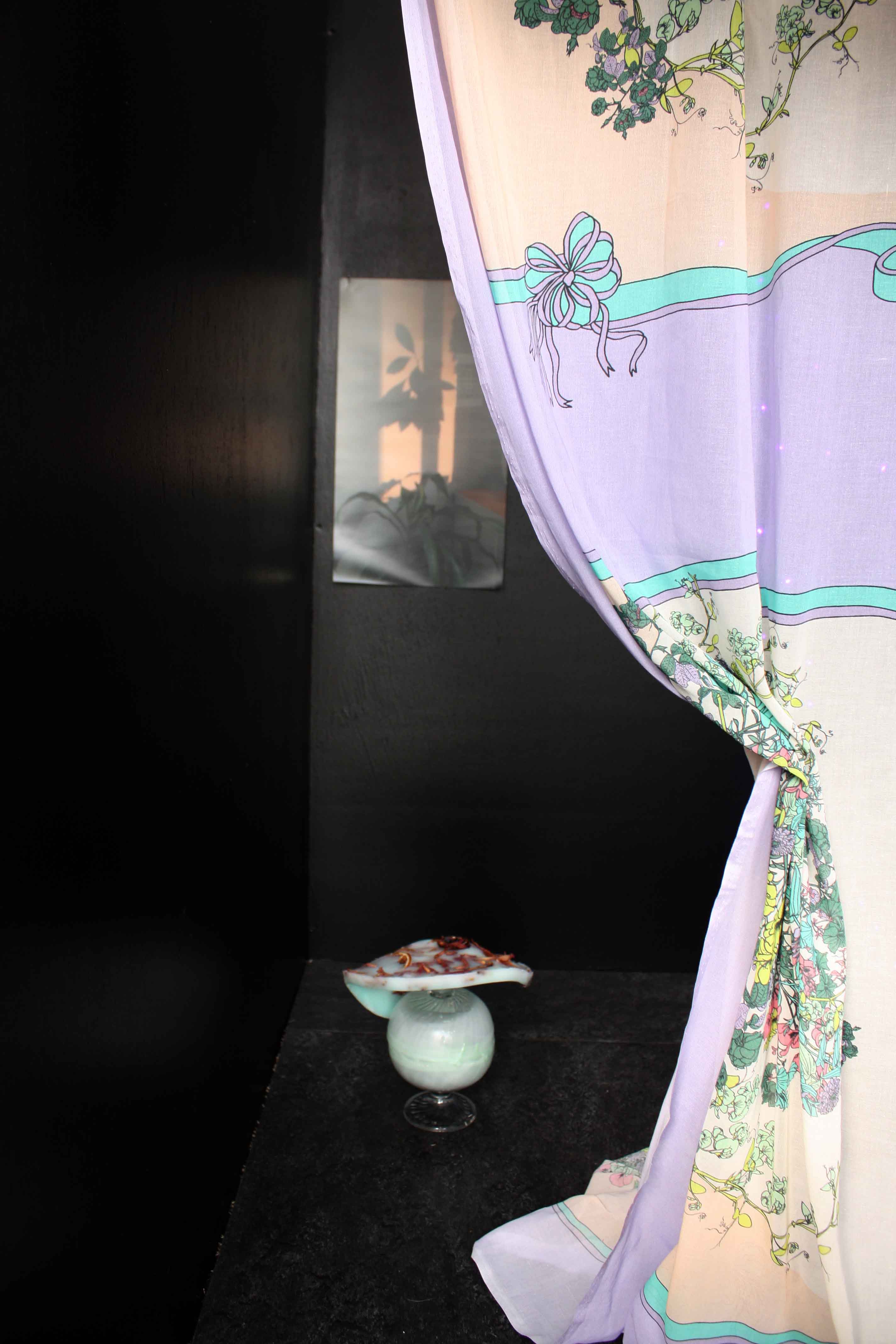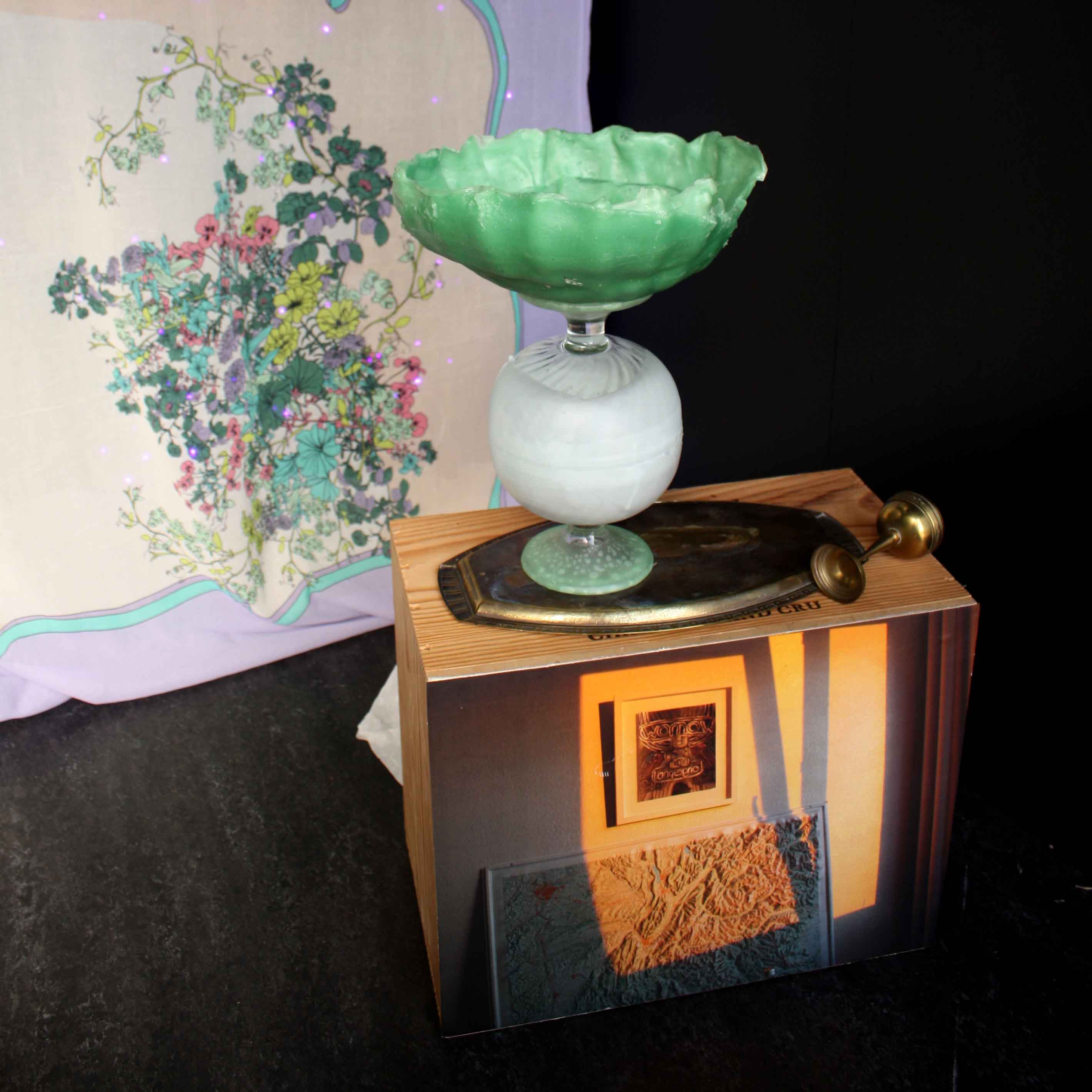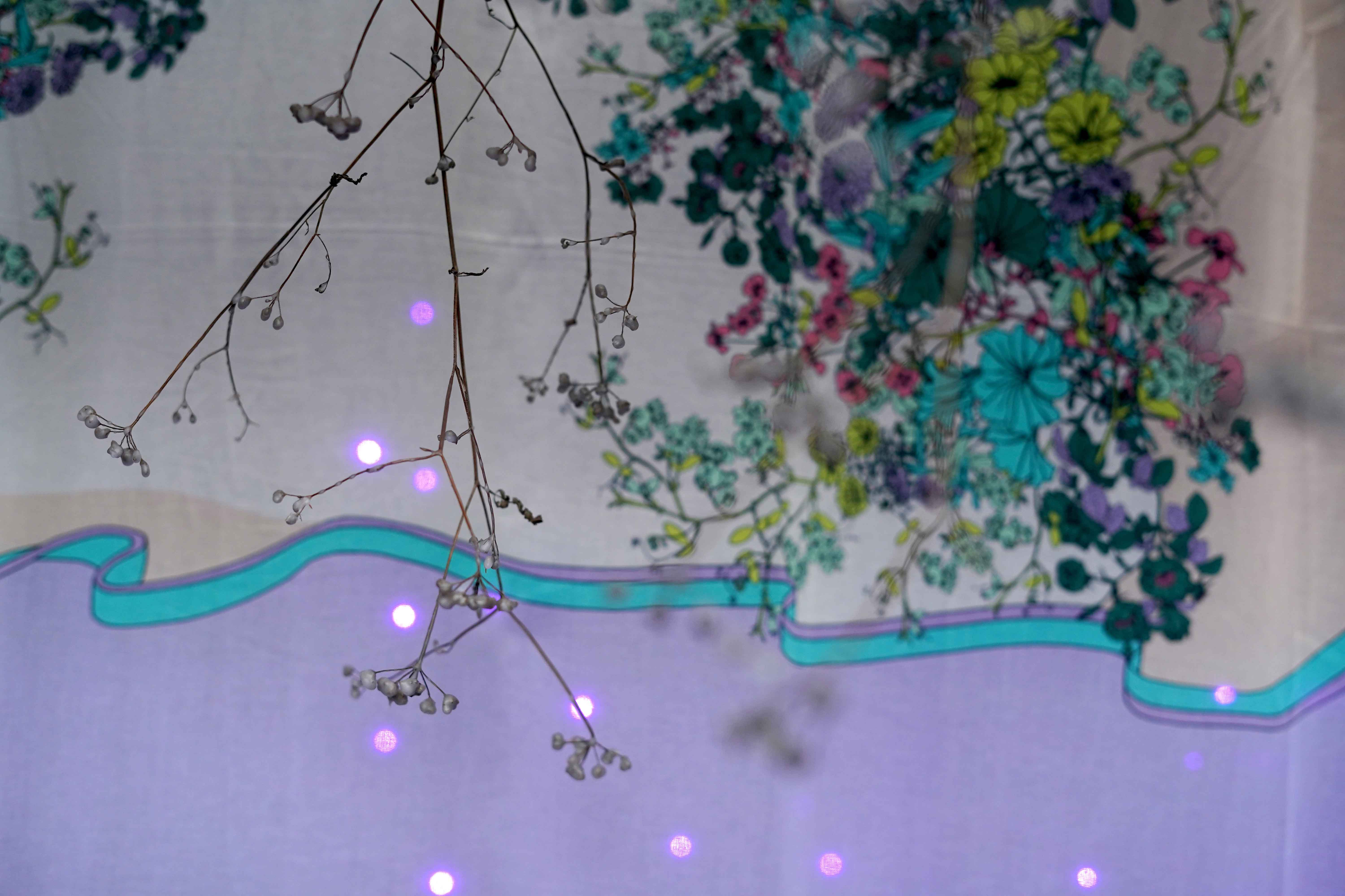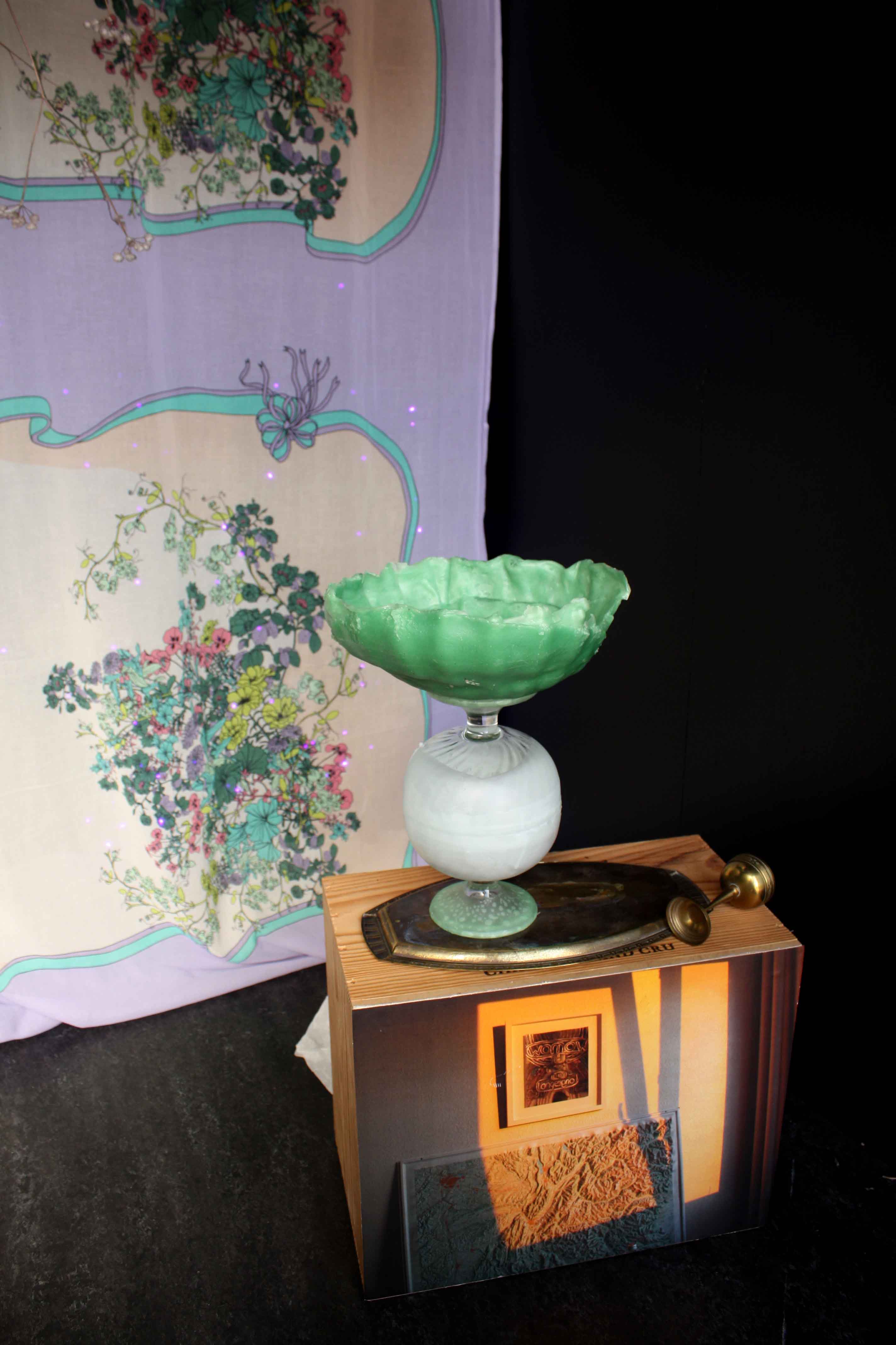 Installation dans la Nanotecture du Basculeur, fleurs cristallisées dans de la cire, peinture sur soie, drapé, guirlande, caisse en bois, et différentes compositions : « Les prieures », « Coupelles » et « Monument ».