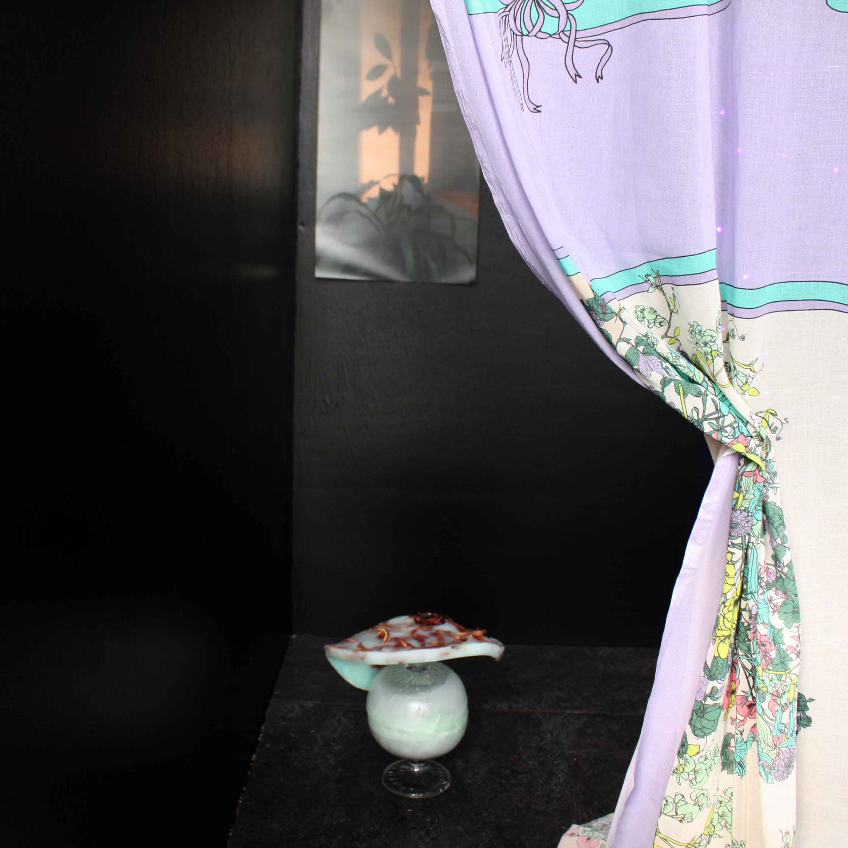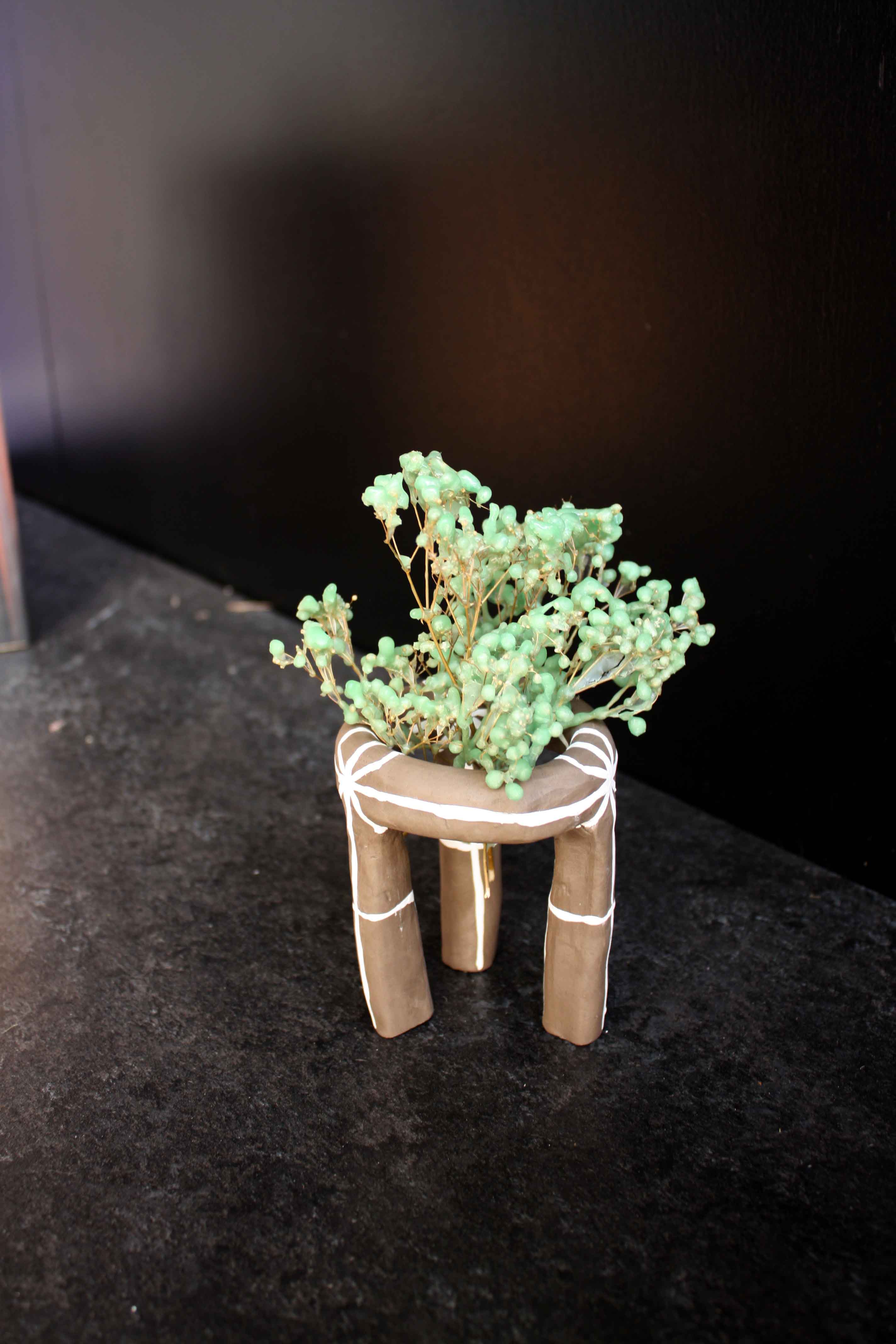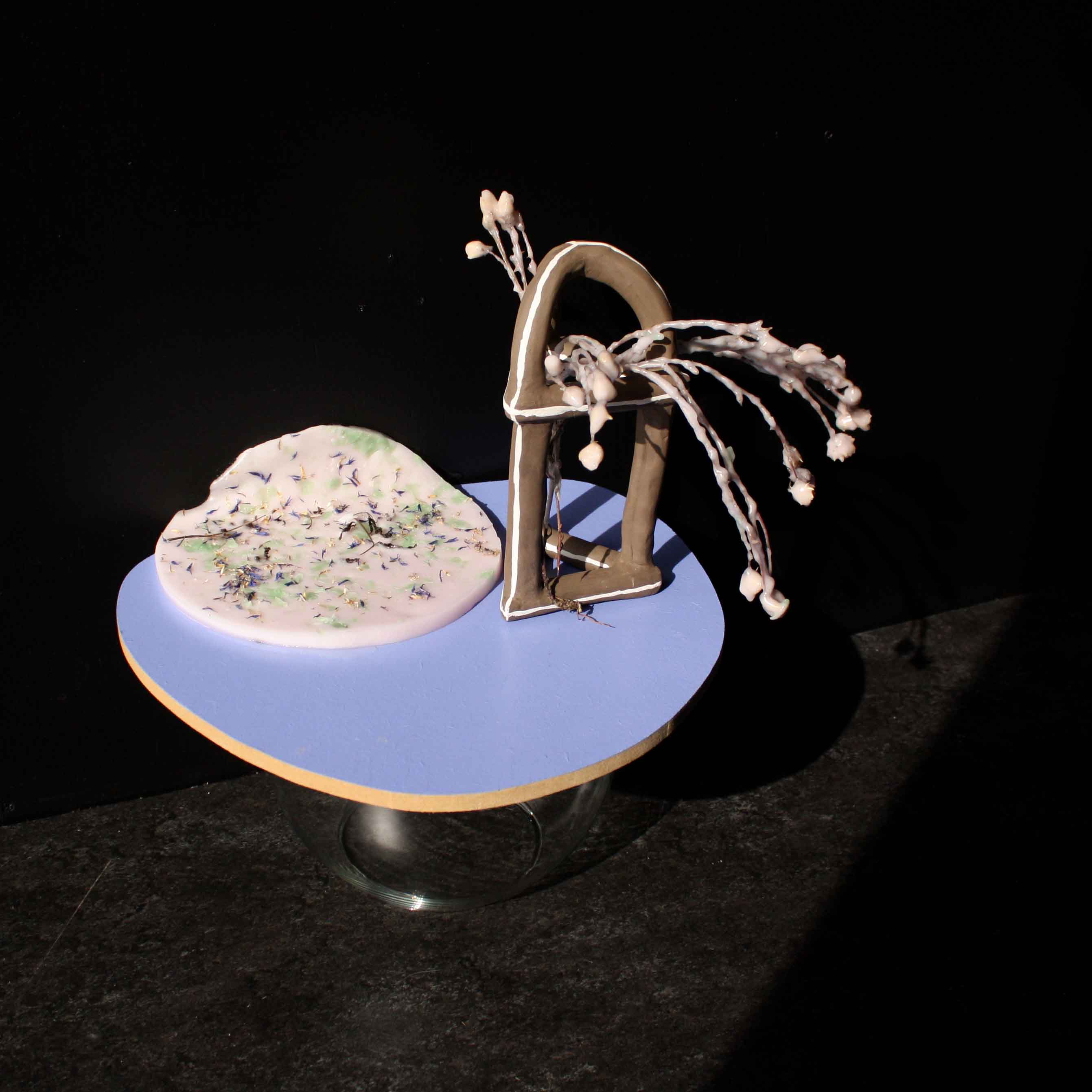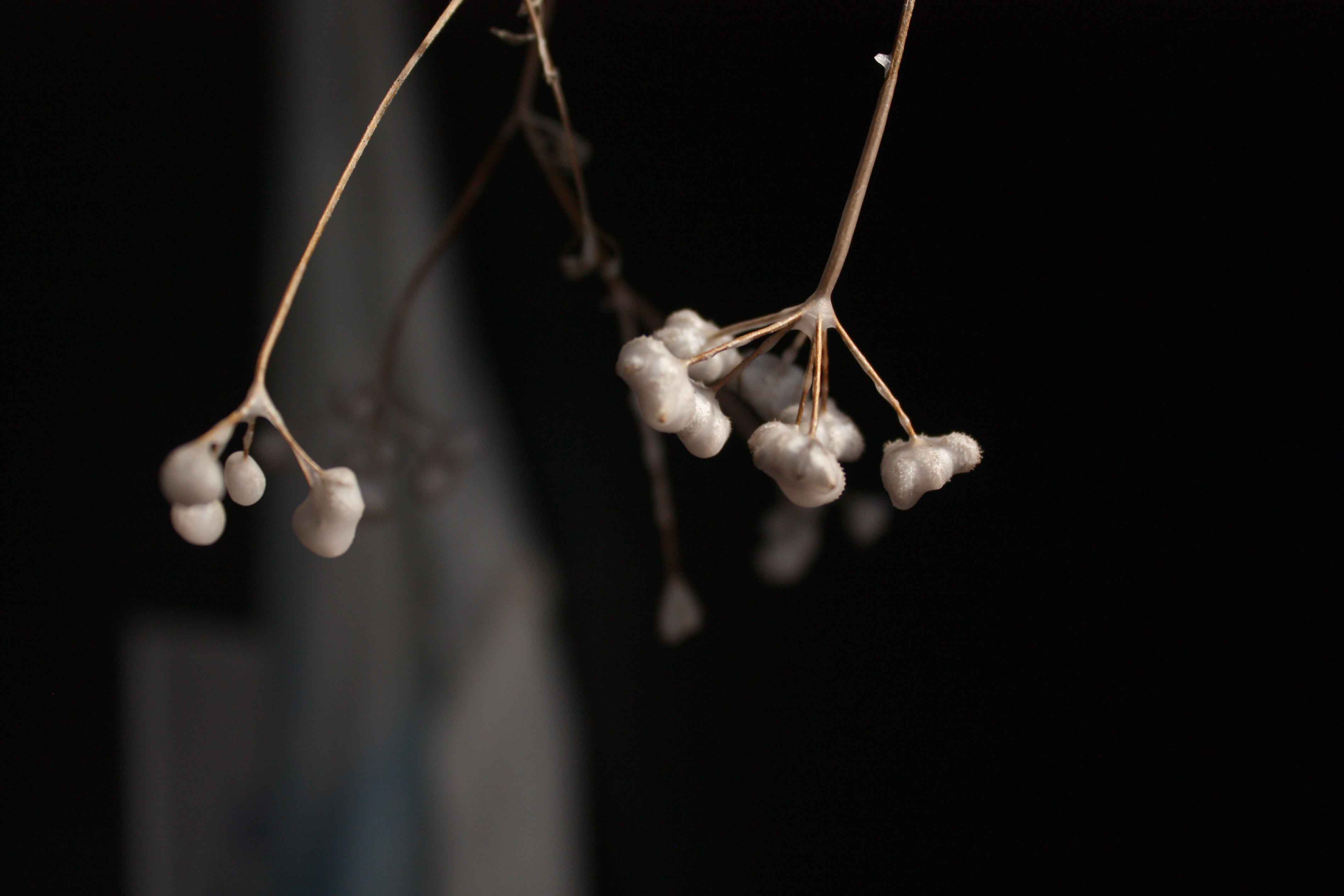 Installation dans la Nanotecture du Basculeur, fleurs cristallisées dans de la cire, peinture sur soie, drapé, guirlande, caisse en bois, et différentes compositions : « Les prieures », « Coupelles » et « Monument ».