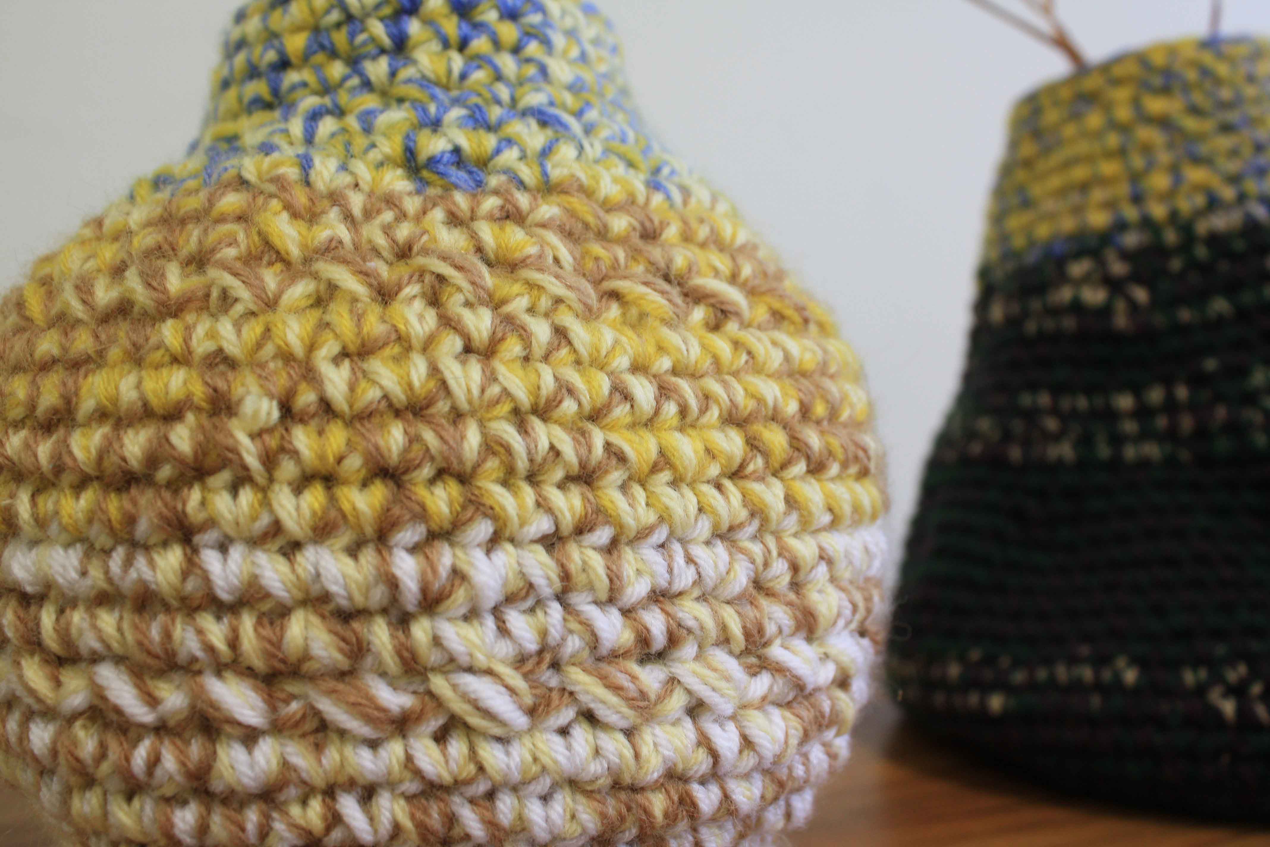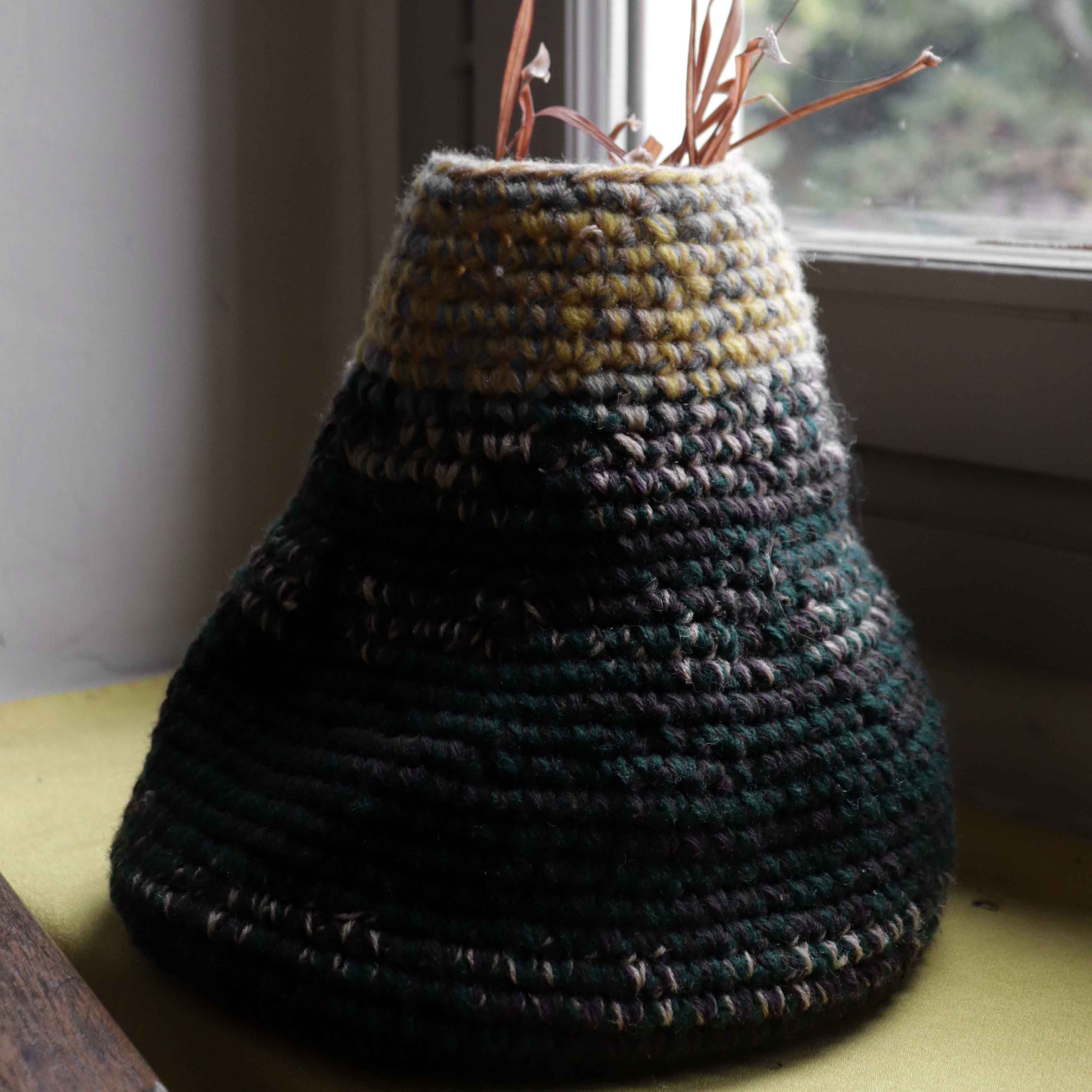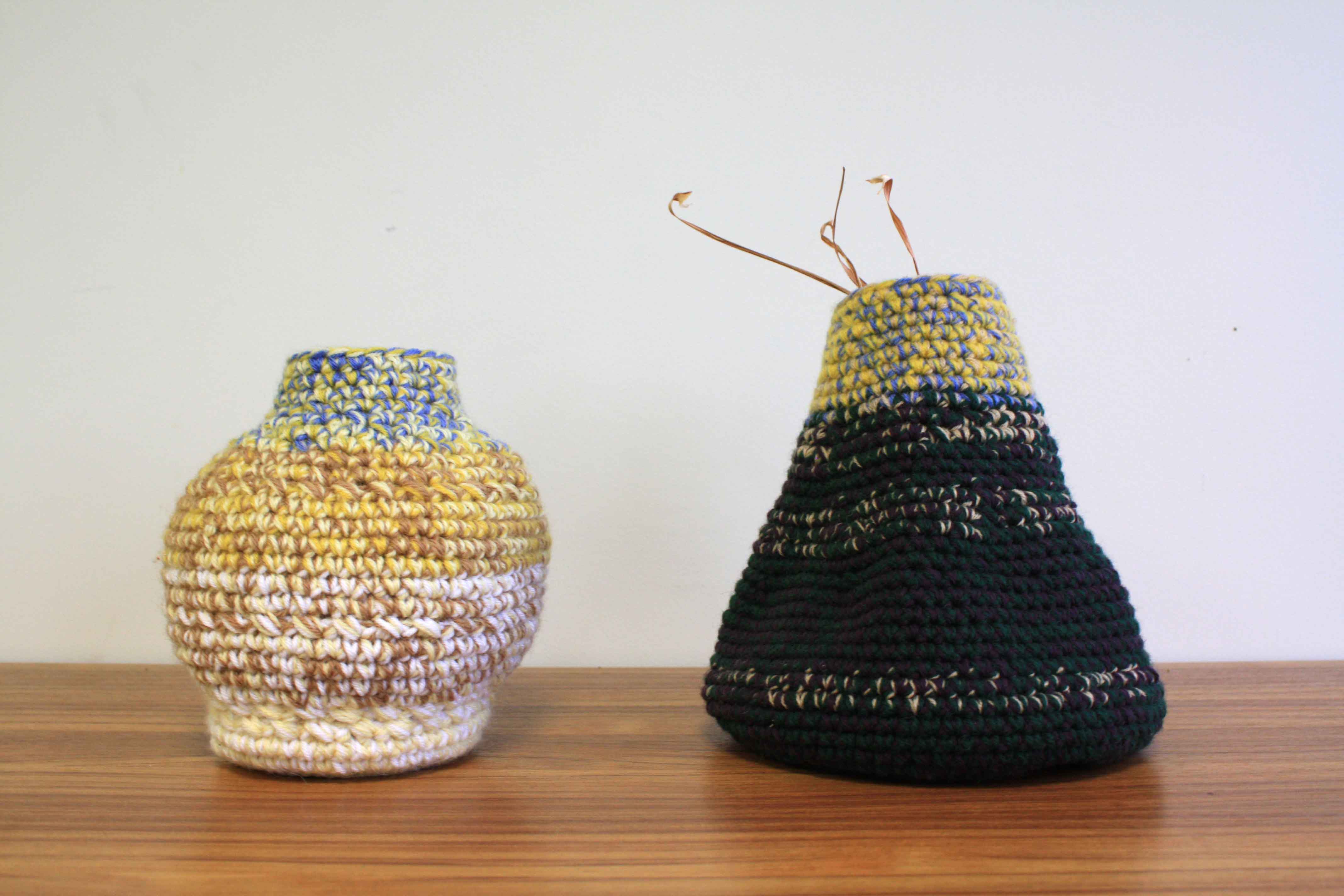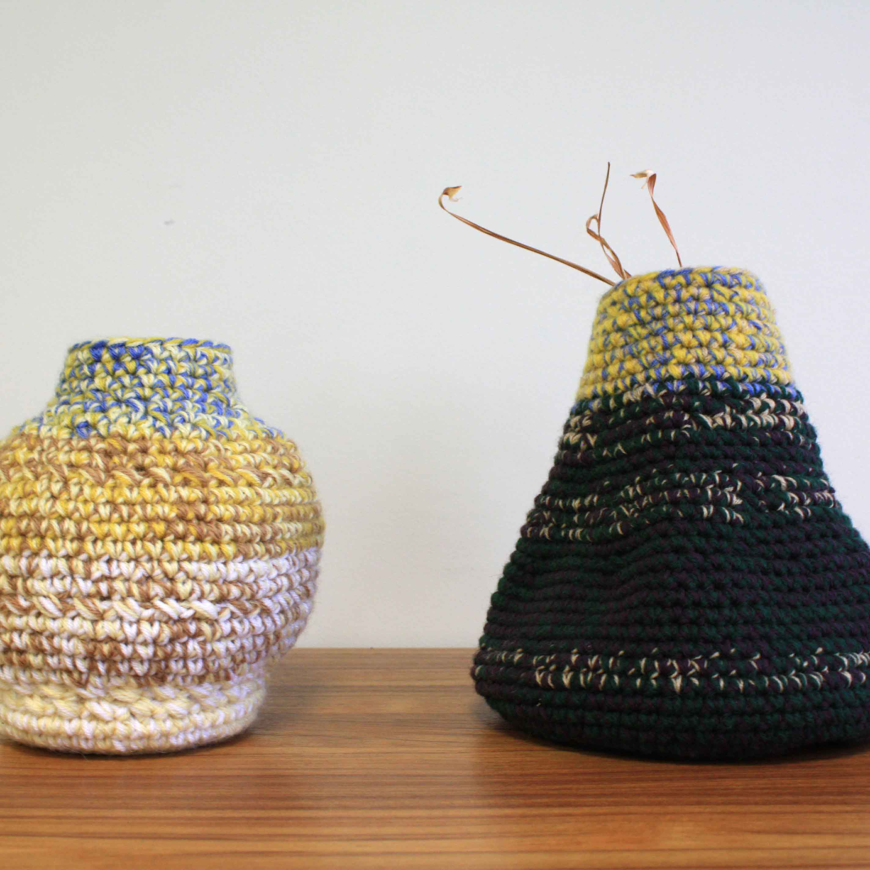 Cette série de vases est une recherche de formes empruntées à l’univers de la poterie, mais réalisées en crochet. La fragilité des céramiques est transformée en souplesse – écrasés les vases peuvent reprendre leur forme à l’infini – et leur fonction première de retenir l’eau est rendue caduque.