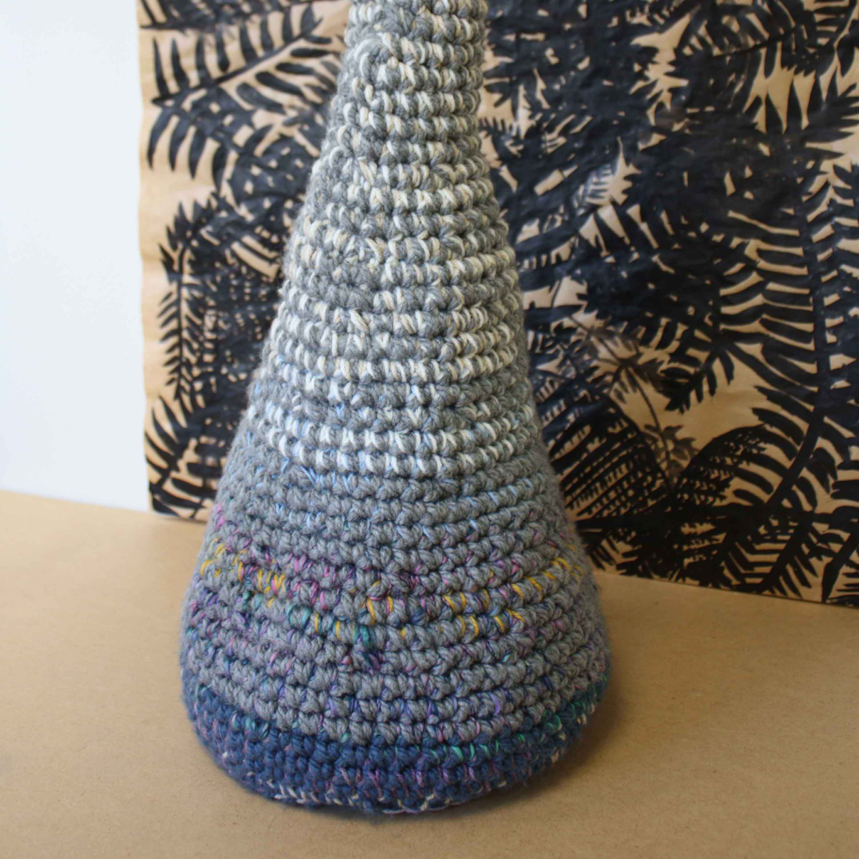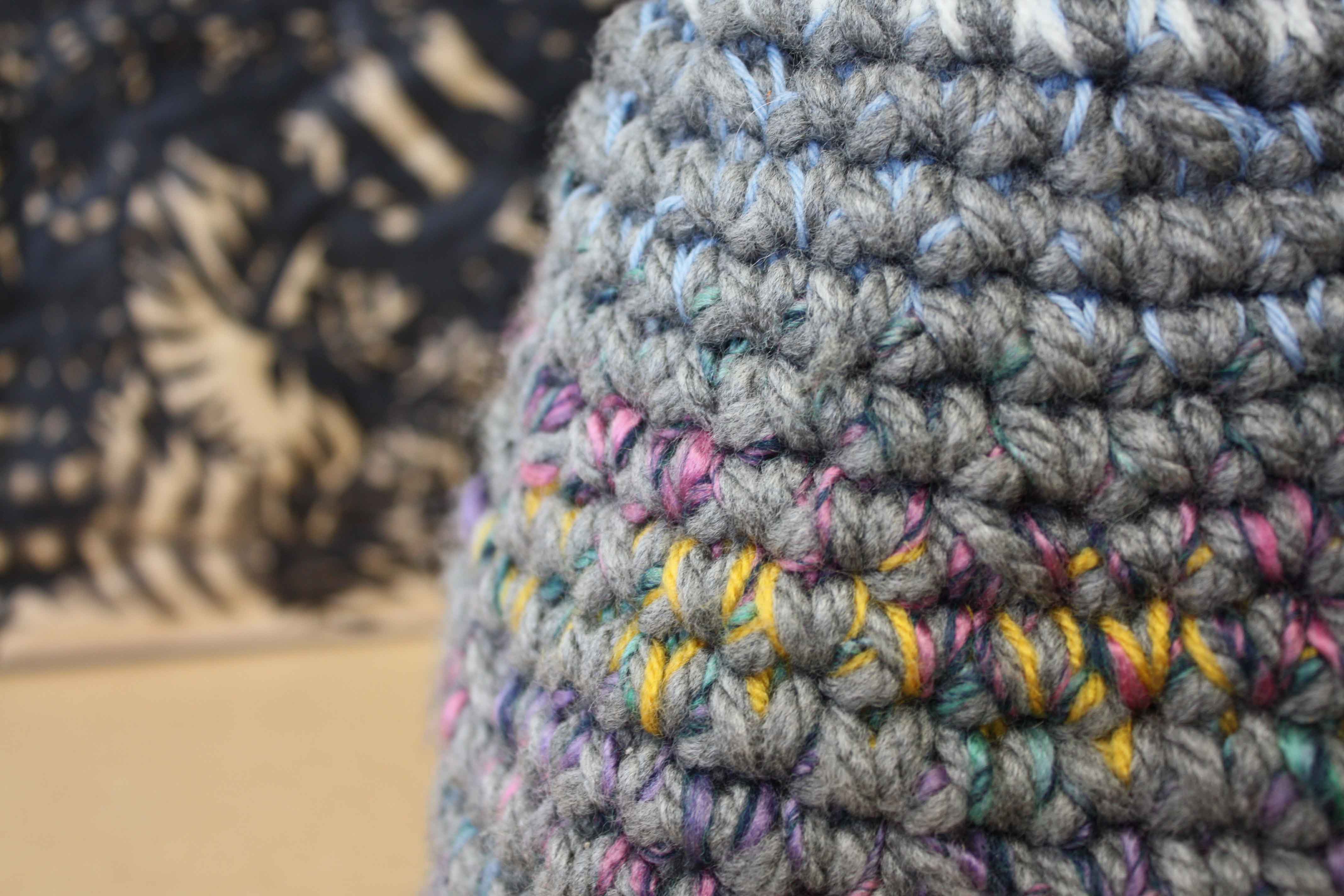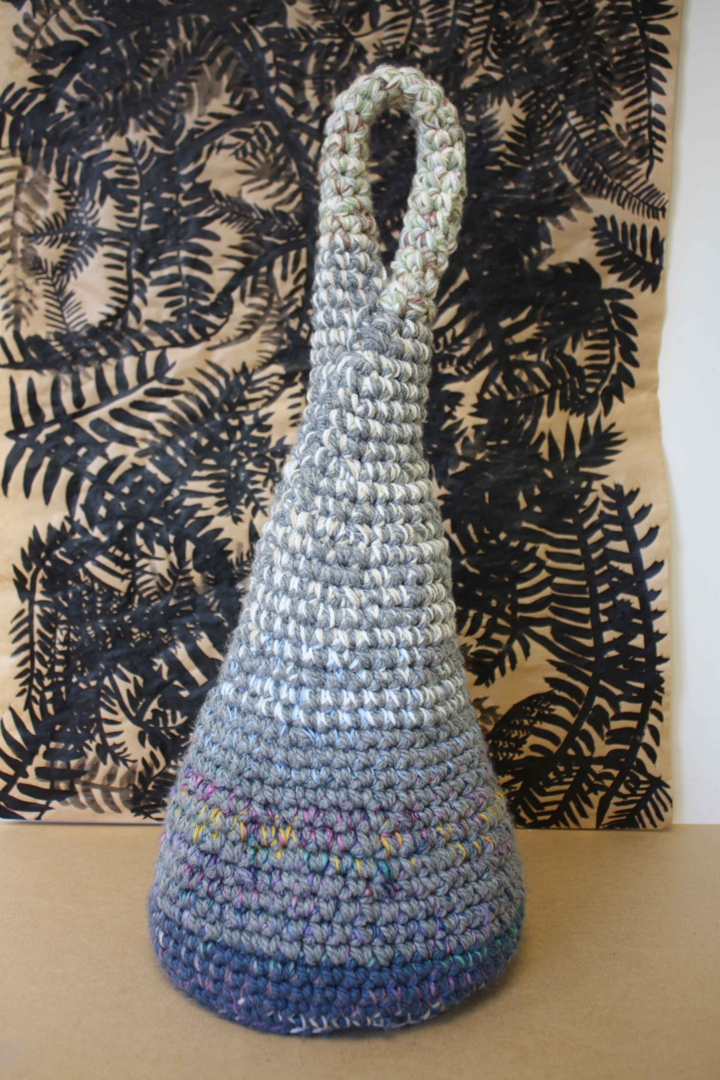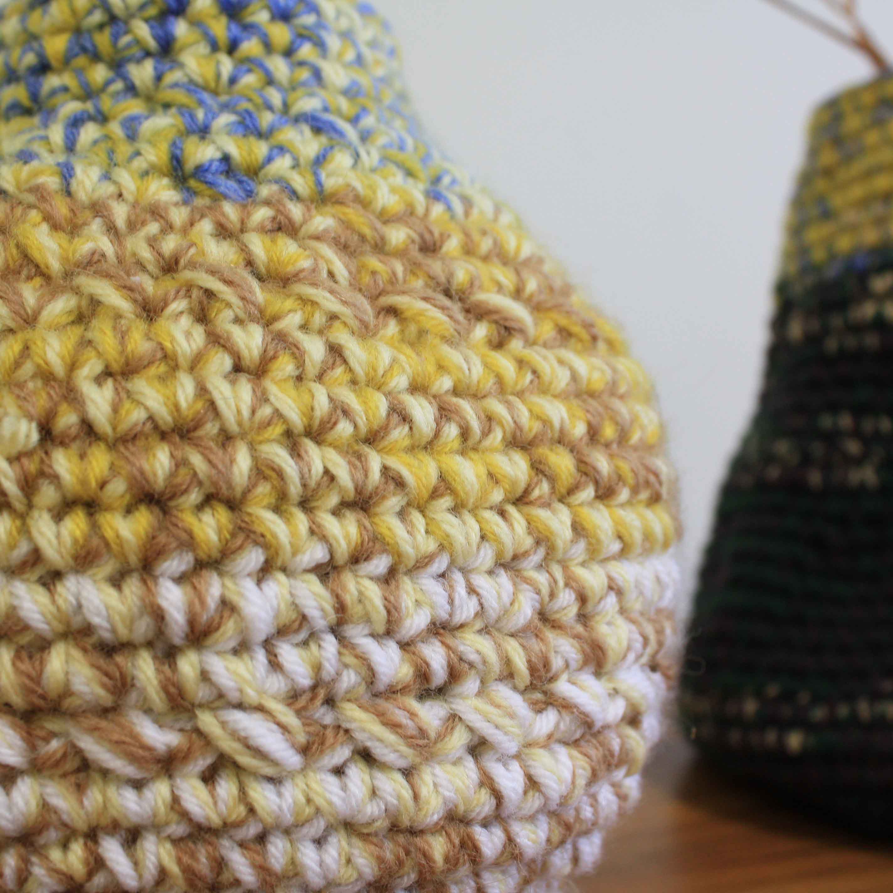 Cette série de vases est une recherche de formes empruntées à l’univers de la poterie, mais réalisées en crochet. La fragilité des céramiques est transformée en souplesse – écrasés les vases peuvent reprendre leur forme à l’infini – et leur fonction première de retenir l’eau est rendue caduque.